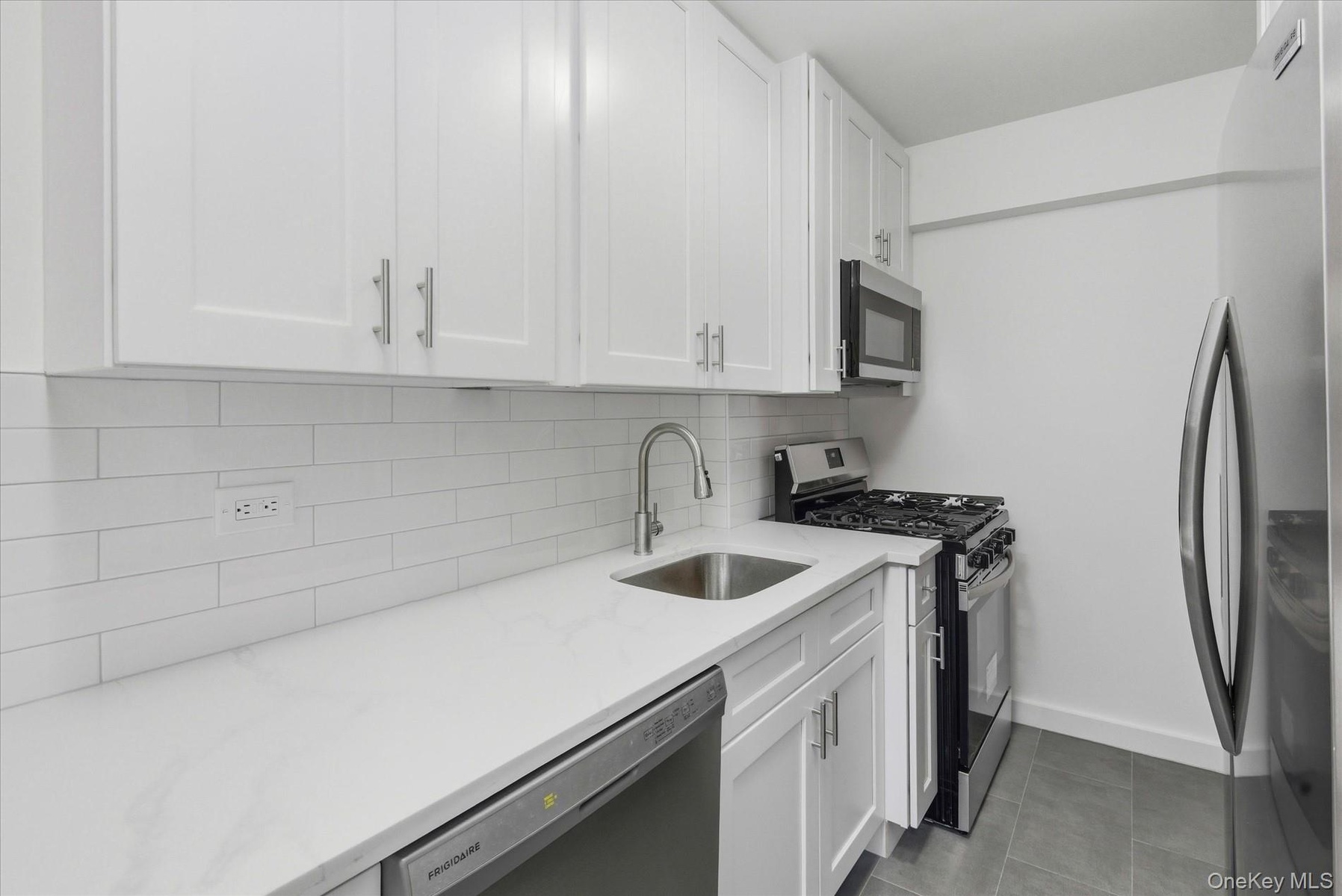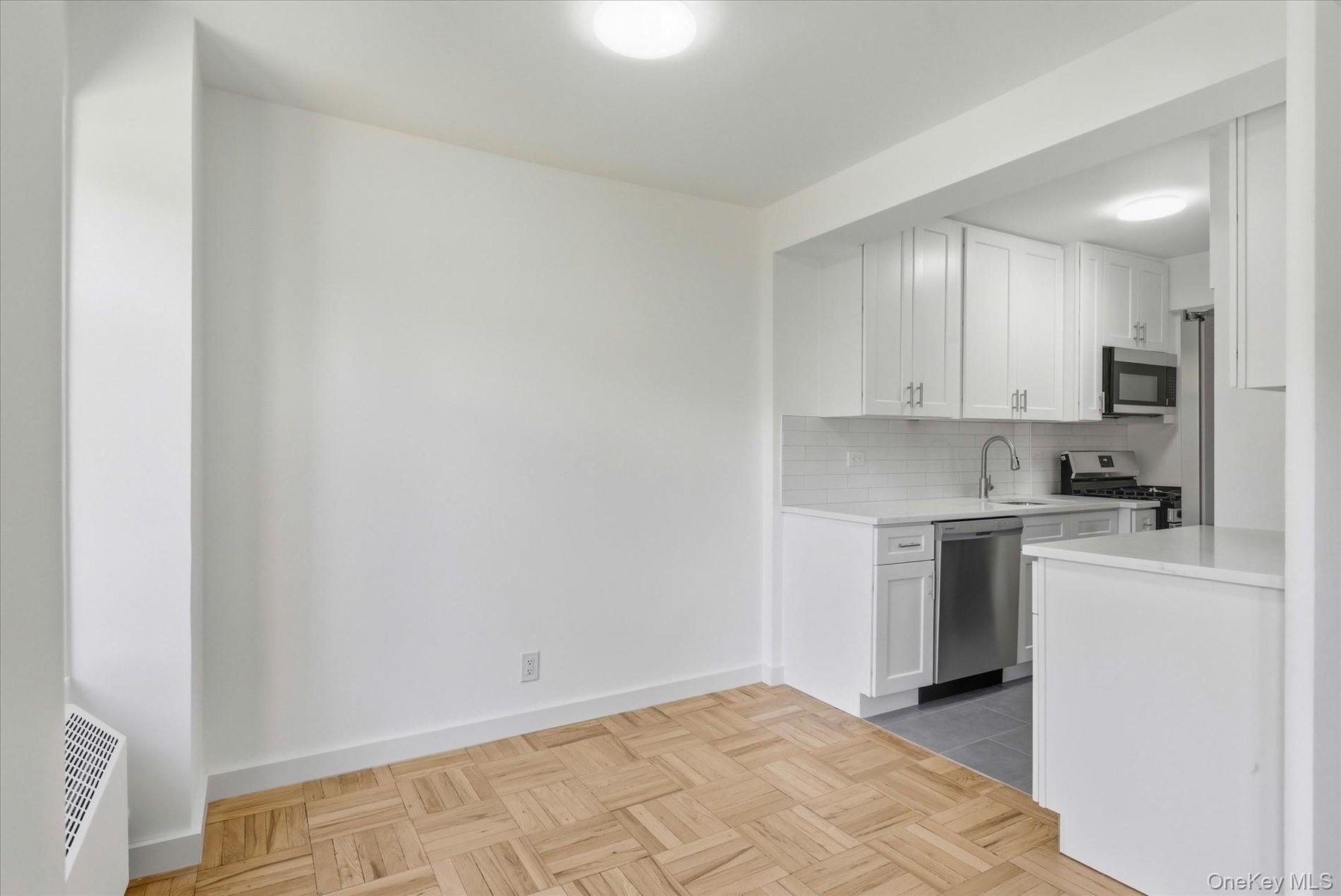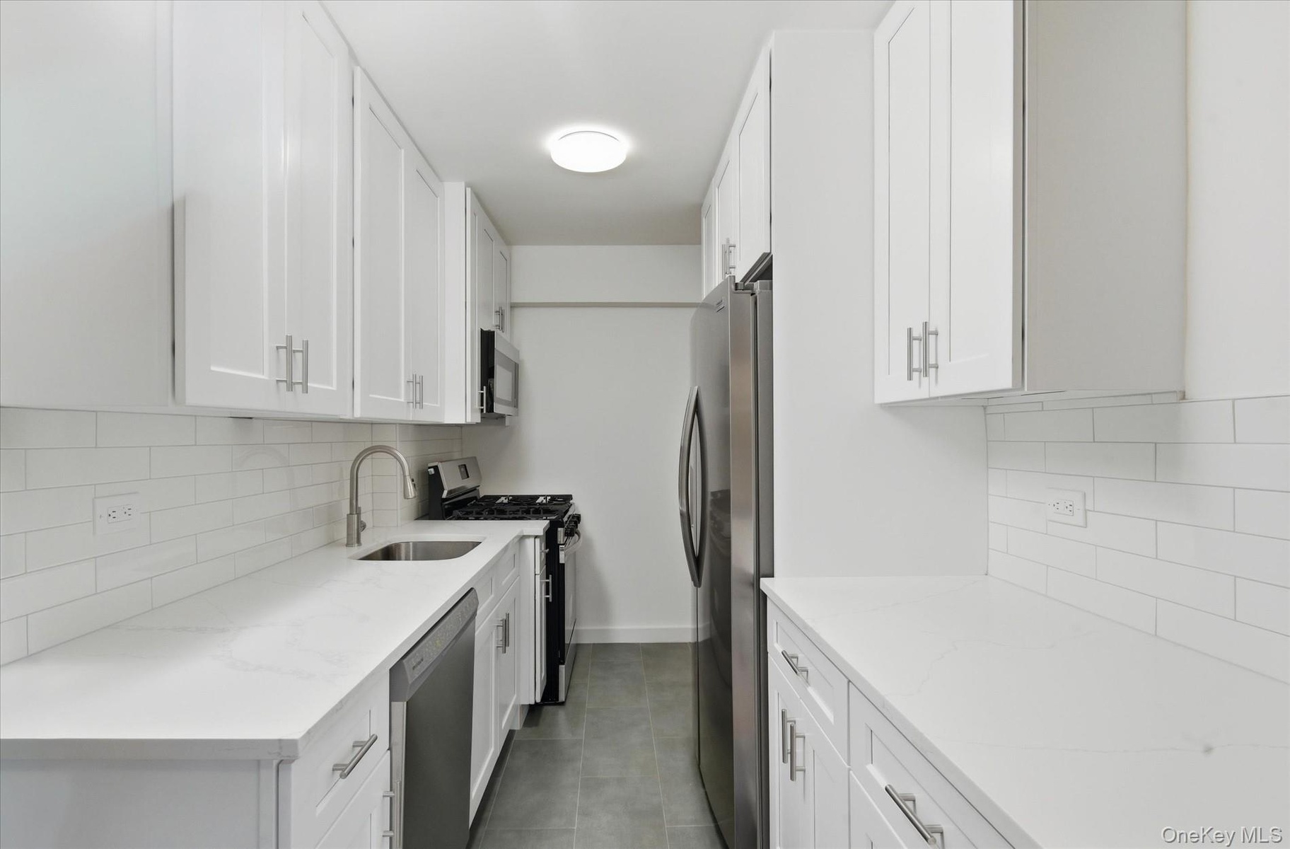 The entryway features a large walk-in closet, complemented by additional storage throughout the unit. Refinished oak parquet floors and new base moldings add warmth and elegance, while the brand-new kitchen impresses with stainless steel appliances, including a dishwasher and above-stove microwave with vent, modern cabinetry, and a stylish backsplash.