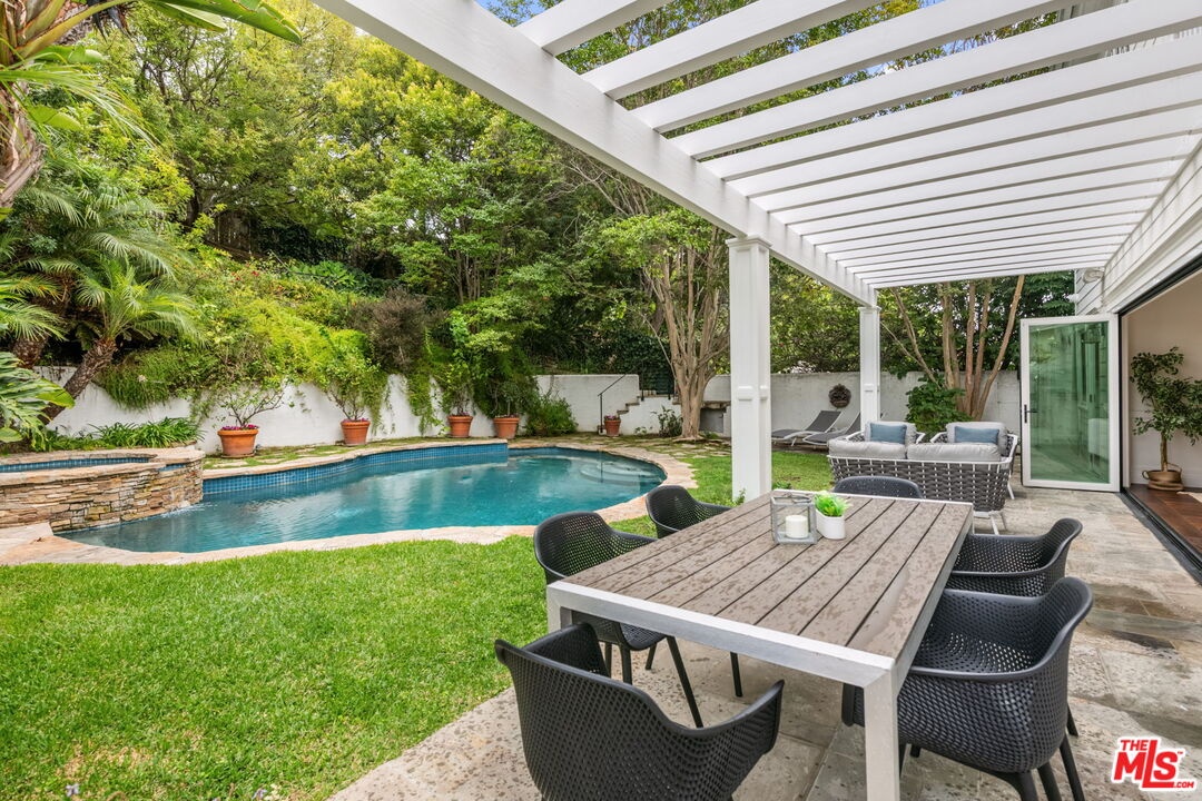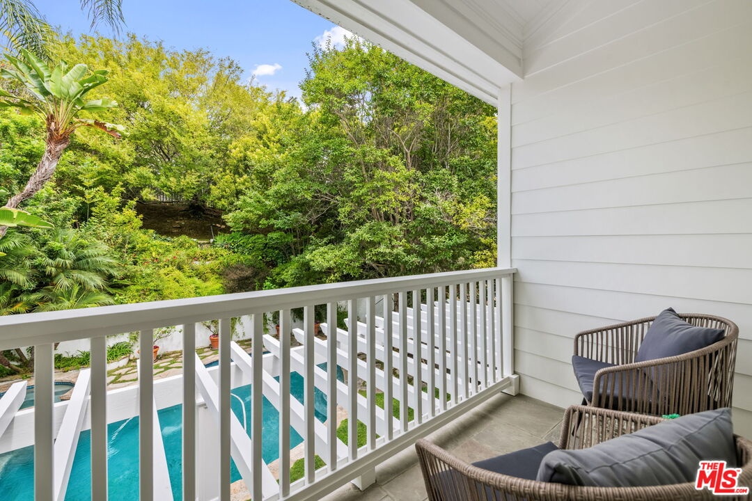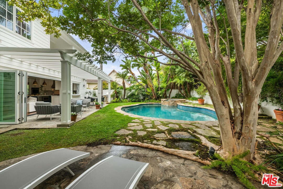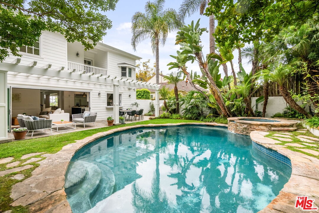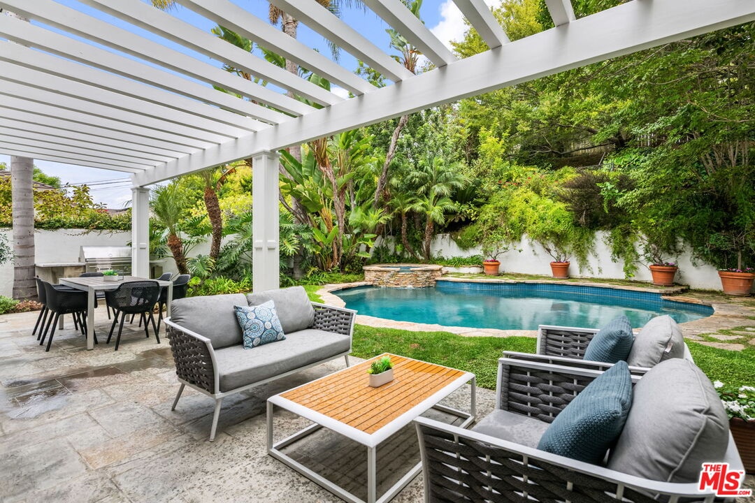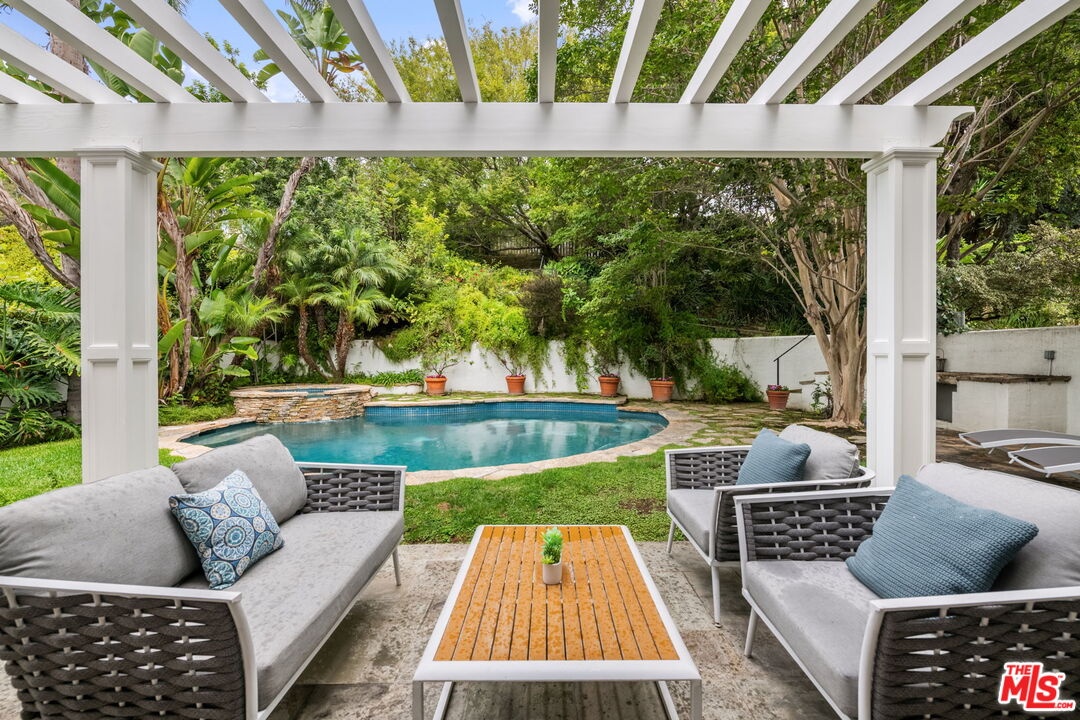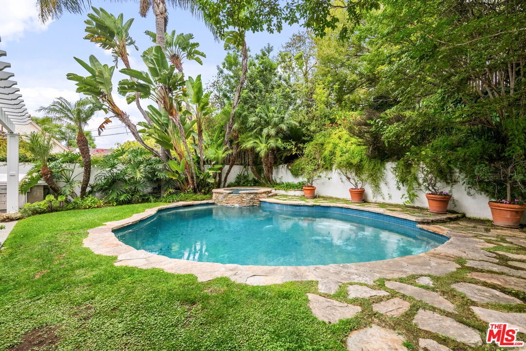 Gorgeous Custom 5 bed/4.5 bath Cape Cod Style Traditional 2-story in Beverlywood with spectacular views and delightful, oversized entertainer's backyard with pool and spa. Set privately off the street with treetop and city views, this lovely home is filled with natural light, high-end finishes, abundant storage and custom architectural details throughout. The home is designed for luxury family living and upscale entertaining. The entry features a two-story open ceiling and a charming, well-appointed mud room with barn door closure. The home's ideal, open floor plan includes a spacious living room with wainscoting, fireplace, large bay window with ample cushioned seating with city views, and an elegant powder room tucked away nearby. Formal dining room with exquisite coffered ceiling opens to sun-filled gourmet Kosher kitchen with large center island that offers generous breakfast seating for the whole family, stainless steel appliances including 8-burner Wolf range with built-in griddle and grill, over-range pot-filler faucet, high-capacity externally-vented Wolf hood, double ovens, a wine fridge, built-in under counter microwave, 2 sinks, marble countertops, pantry cabinets with pull out drawers and unique serving window over sink that opens the kitchen to an outside counter/bar adjacent to the outdoor BBQ. Kitchen opens to family room with 4-panel bi-fold doors that create an open, indoor/outdoor living space perfect for hosting intimate and larger-scale gatherings, with built-in barbecue and pergola-covered patio, and a backyard oasis with privately landscaped mature trees framing the pool/spa. Downstairs includes 2 bedrooms, one with en-suite beautifully updated 3/4 bathroom and large patio with tree-top views, and the 5th bedroom with backyard access and 3/4 bathroom just outside the bedroom, ideal as well for a home office. Upstairs 3 additional bedrooms, including oversized primary suite with fireplace, bay window with built-in cushions seating and city views, 2 closets including large custom closet, covered balcony overlooking backyard and luxurious remodeled marble-finished primary bathroom with spa tub, separate shower and dual basins. 2 additional spacious bedrooms upstairs open to shared bathroom with dual basins, including one generously-sized bedroom with a front-facing balcony that boasts breathtaking expansive city views spanning from Downtown Los Angeles to Marina del Rey. Additional features found in luxury estate homes include built-in speaker system in family room ceiling and backyard, security system including custom-designed exterior security cameras with remote access, tastefully remodeled custom bathrooms, high-end fixtures and hardware, hardwood flooring, dual zoned ac/heat, graceful wainscoting, custom door casings, solid wood doors throughout for sound reduction and added privacy, built-ins, skylight, high ceilings and recessed lighting throughout. Ideal proximity to Beverly Hills shopping and retail, Century City's Westfield Mall and Downtown Culver City retail and restaurants, with easy access to freeways. Castle Heights Elementary School. Stunning home ready to move right in!
