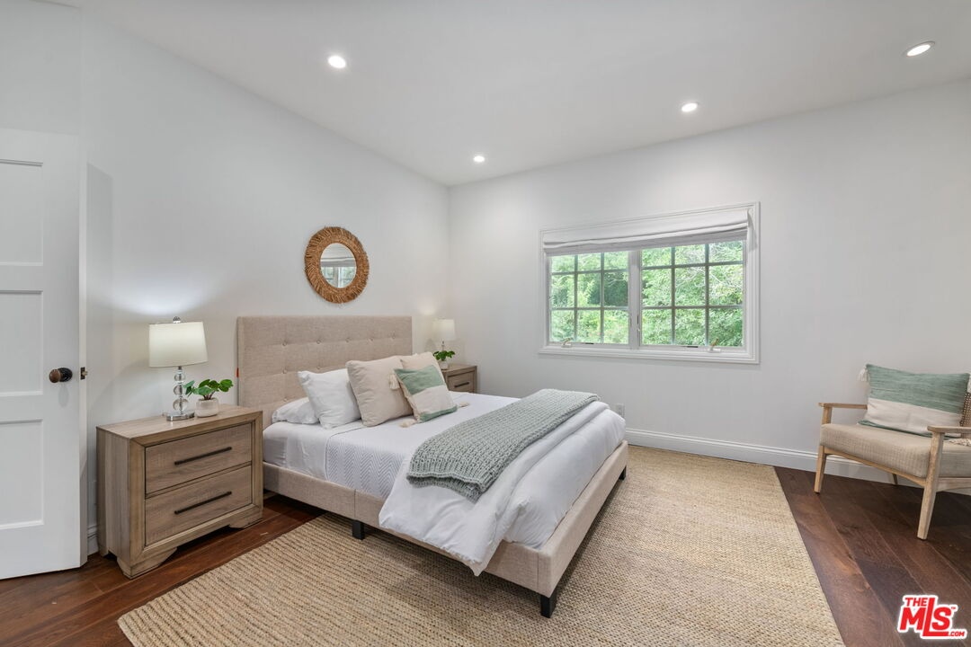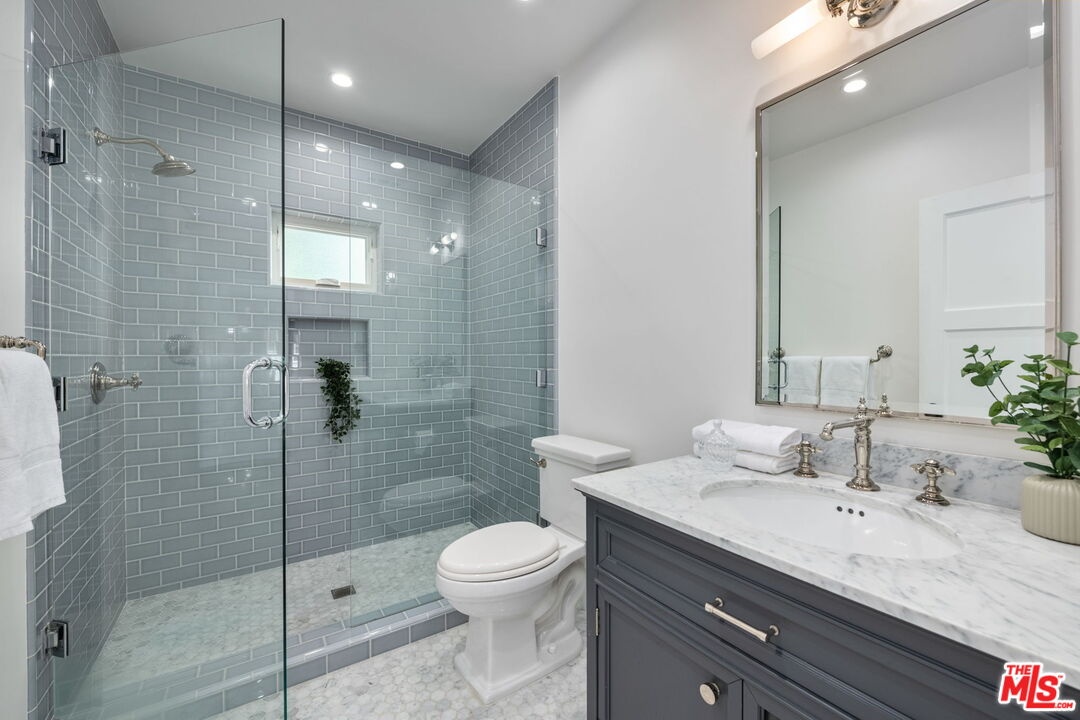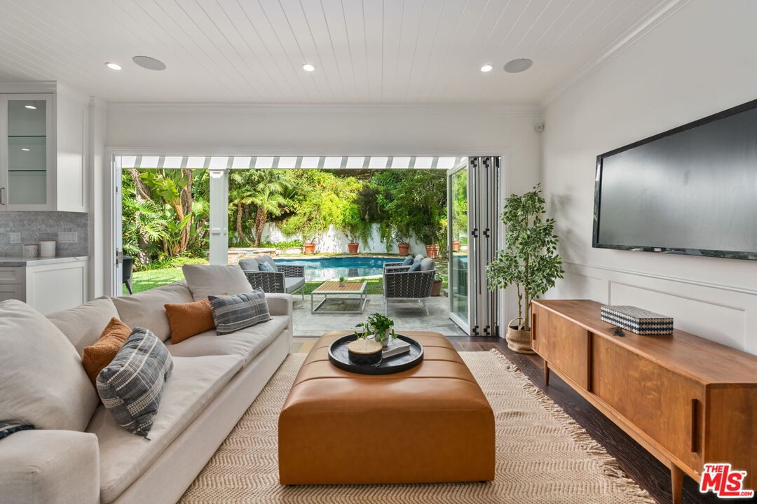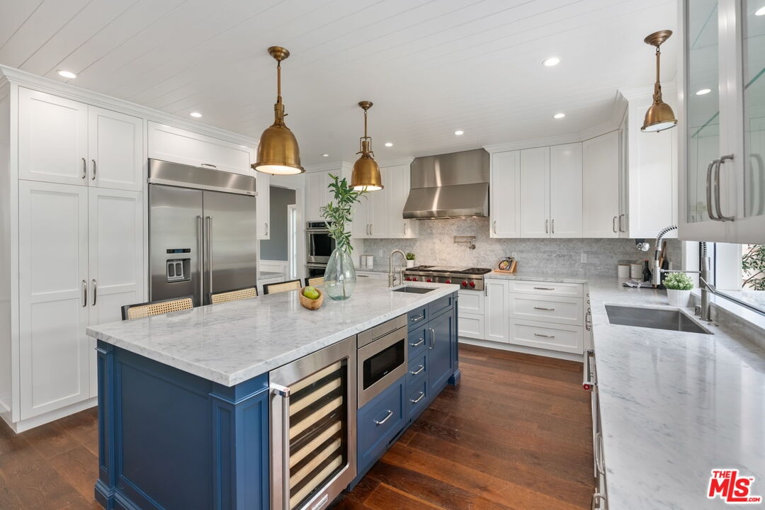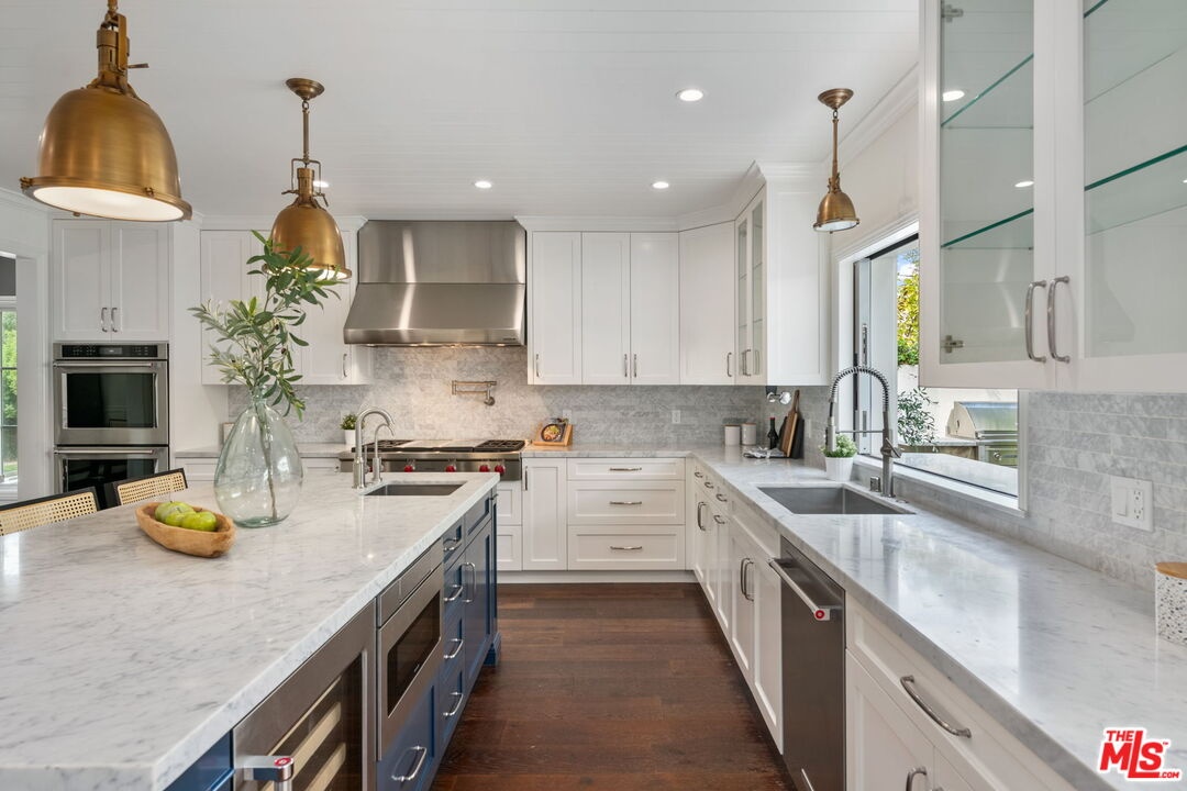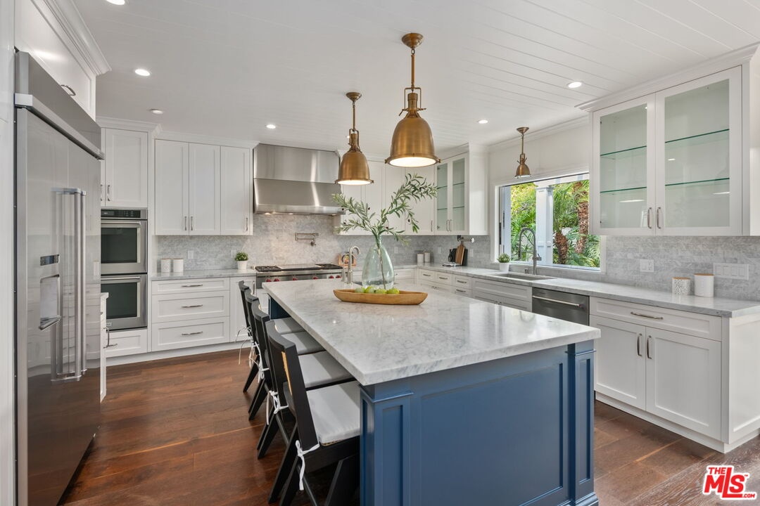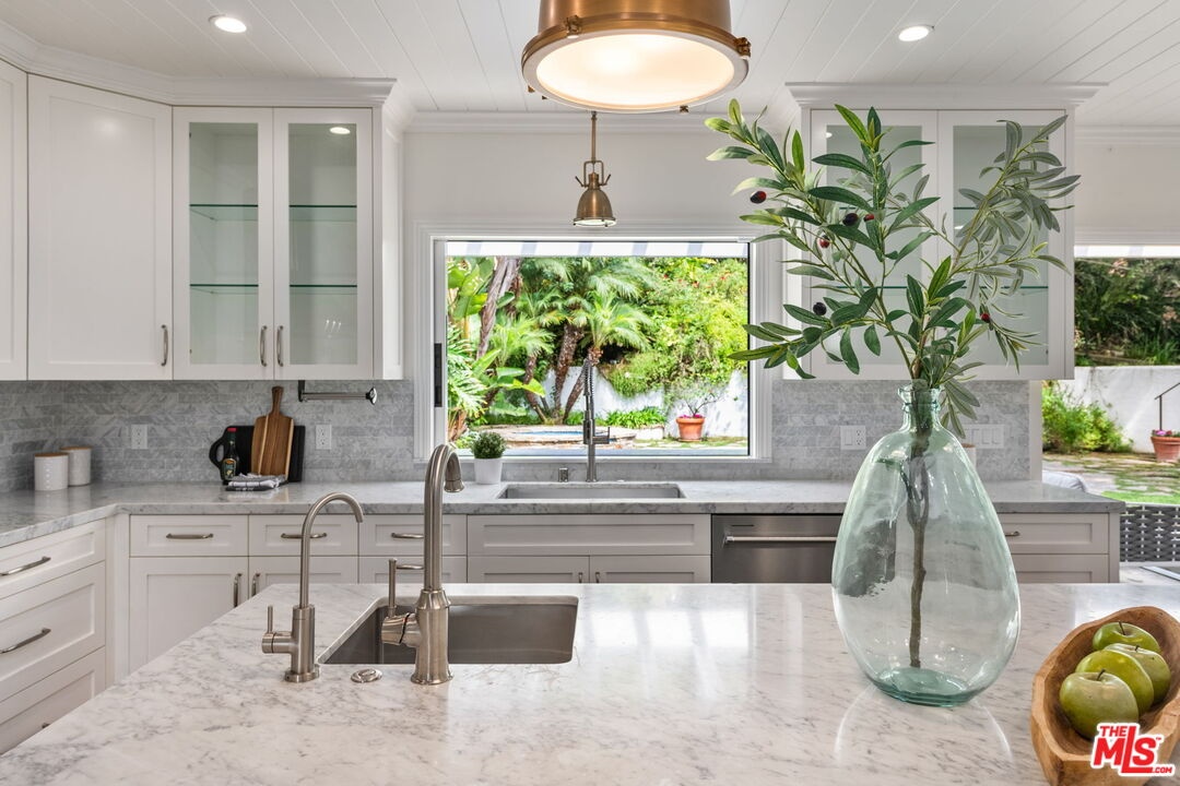 Gorgeous Custom 5 bed/4.5 bath Cape Cod Style Traditional 2-story in Beverlywood with spectacular views and delightful, oversized entertainer's backyard with pool and spa. Set privately off the street with treetop and city views, this lovely home is filled with natural light, high-end finishes, abundant storage and custom architectural details throughout. The home is designed for luxury family living and upscale entertaining. The entry features a two-story open ceiling and a charming, well-appointed mud room with barn door closure. The home's ideal, open floor plan includes a spacious living room with wainscoting, fireplace, large bay window with ample cushioned seating with city views, and an elegant powder room tucked away nearby. Formal dining room with exquisite coffered ceiling opens to sun-filled gourmet Kosher kitchen with large center island that offers generous breakfast seating for the whole family, stainless steel appliances including 8-burner Wolf range with built-in griddle and grill, over-range pot-filler faucet, high-capacity externally-vented Wolf hood, double ovens, a wine fridge, built-in under counter microwave, 2 sinks, marble countertops, pantry cabinets with pull out drawers and unique serving window over sink that opens the kitchen to an outside counter/bar adjacent to the outdoor BBQ. Kitchen opens to family room with 4-panel bi-fold doors that create an open, indoor/outdoor living space perfect for hosting intimate and larger-scale gatherings, with built-in barbecue and pergola-covered patio, and a backyard oasis with privately landscaped mature trees framing the pool/spa. Downstairs includes 2 bedrooms, one with en-suite beautifully updated 3/4 bathroom and large patio with tree-top views, and the 5th bedroom with backyard access and 3/4 bathroom just outside the bedroom, ideal as well for a home office. Upstairs 3 additional bedrooms, including oversized primary suite with fireplace, bay window with built-in cushions seating and city views, 2 closets including large custom closet, covered balcony overlooking backyard and luxurious remodeled marble-finished primary bathroom with spa tub, separate shower and dual basins. 2 additional spacious bedrooms upstairs open to shared bathroom with dual basins, including one generously-sized bedroom with a front-facing balcony that boasts breathtaking expansive city views spanning from Downtown Los Angeles to Marina del Rey. Additional features found in luxury estate homes include built-in speaker system in family room ceiling and backyard, security system including custom-designed exterior security cameras with remote access, tastefully remodeled custom bathrooms, high-end fixtures and hardware, hardwood flooring, dual zoned ac/heat, graceful wainscoting, custom door casings, solid wood doors throughout for sound reduction and added privacy, built-ins, skylight, high ceilings and recessed lighting throughout. Ideal proximity to Beverly Hills shopping and retail, Century City's Westfield Mall and Downtown Culver City retail and restaurants, with easy access to freeways. Castle Heights Elementary School. Stunning home ready to move right in!