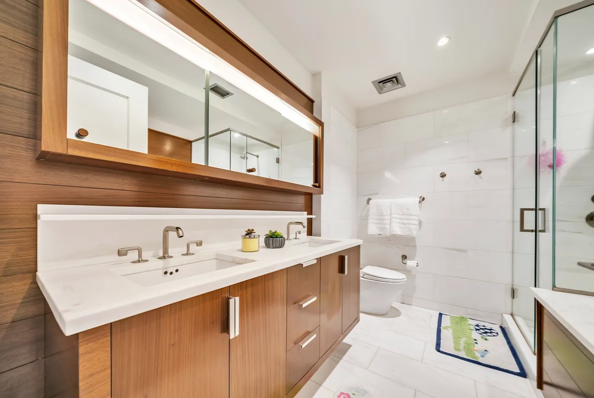 The king-size primary suite includes a custom walk-in closet and a spa-like bathroom with a deep soaking tub, glass-enclosed rainfall shower, and dual vanities finished in Bianco Dolomite marble. The secondary bedroom enjoys its own en-suite bath and open northern views.