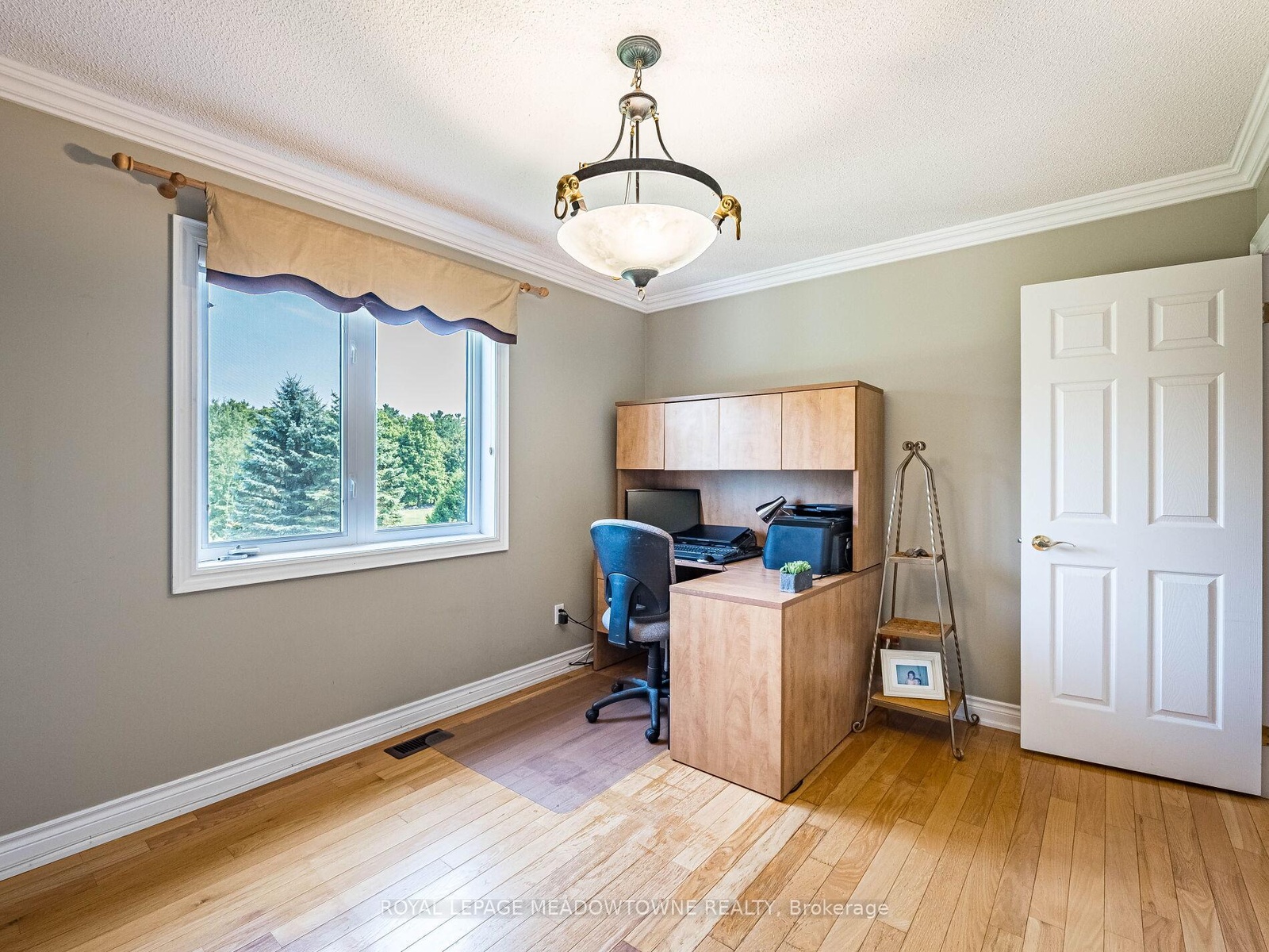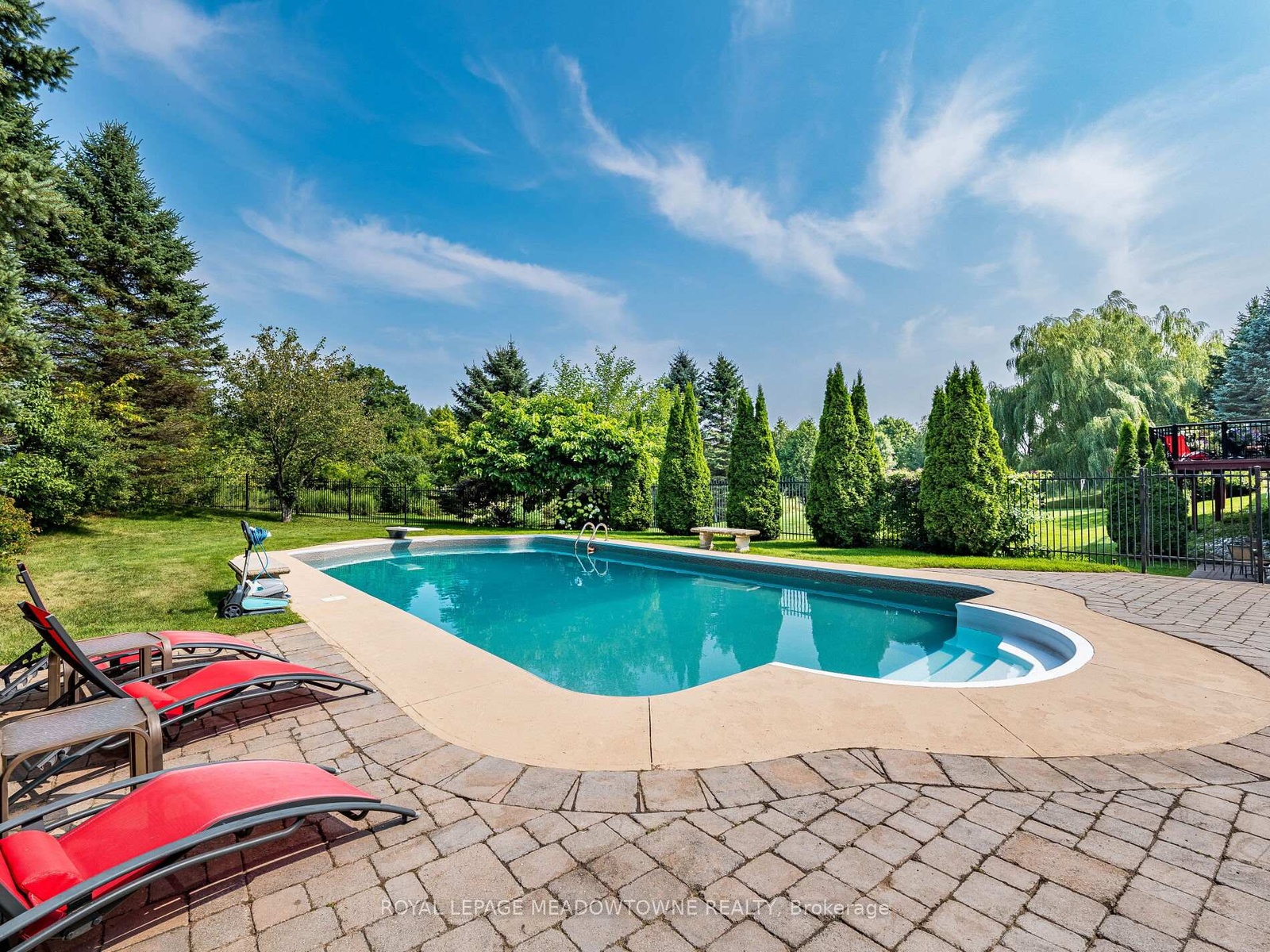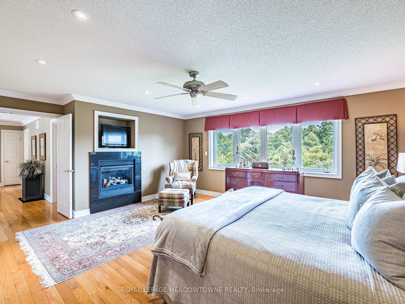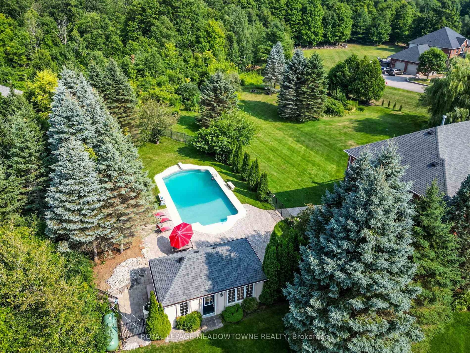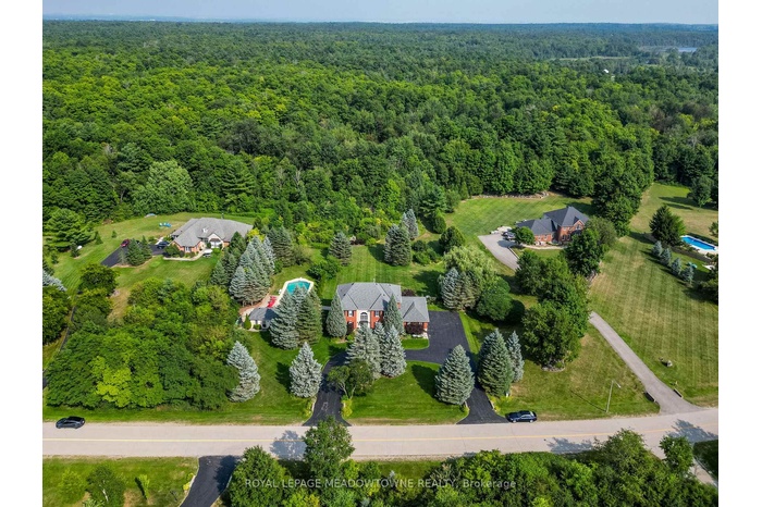Welcome to 8 Deer Run an exceptional property in a sought-after executive estate subdivision. This private retreat sits on nearly 4 acres, including 1 acre of protected conservation. This beautifully maintained home offers approx. 3,100 sq ft above grade plus a walkout basement, combining timeless charm with modern upgrades. Perfect commuter location centrally located just minutes to Guelph, Milton, and Acton. The main floor features 9-ft ceilings, original hardwood, pot lights, crown moulding, a double-sided fireplace, and French doors opening to a coffered living room. The spacious eat-in kitchen includes granite countertops, travertine backsplash, built-in oven and cooktop, freezer, breakfast bar, walk-in pantry, and walkout to a 4-year-old deck with gas hookup and awning. A mudroom with laundry and deck access complements the 3-car garage. Upstairs offers 4 generous bedrooms, oak staircase with runner, pot lights, and original strip hardwood. The primary suite features double-door entry, fireplace, large walk-in closet, and 6-pc ensuite with Jacuzzi tub, walk-in shower, linen storage, and new toilet. Updated 4-pc main bathroom and additional linen closet complete the level. The finished walkout basement with separate entrance to the in-law suite offers 9-ft ceilings, pot lights, above-grade windows, a 3-sided fireplace, wet bar, cold room, and bedroom with stove connection and huge walk-in closet (or use as second bedroom) plus 3-pc ensuite and laminate flooring. The fenced-in 7-ft deep pool is thermal heated with a 2-year-old pump and filter. Enjoy a fully equipped pool house with running water and electricity, interlock walkway, perennial landscaping, sprinkler system, electric dog fence, surround sound, and outdoor fridge/freezer. Roof on house and pool house replaced 4 years ago with new gutters and guards. A true oasis with incredible privacy, just minutes to amenities