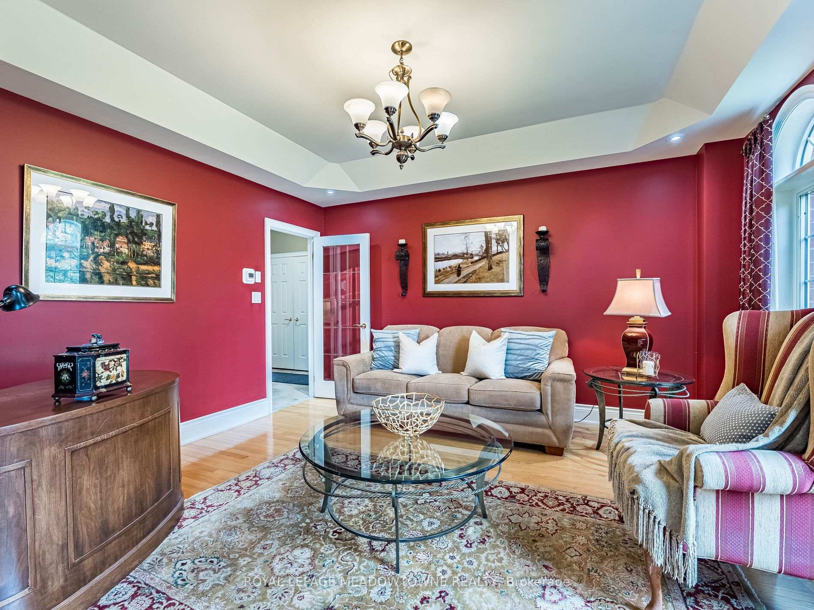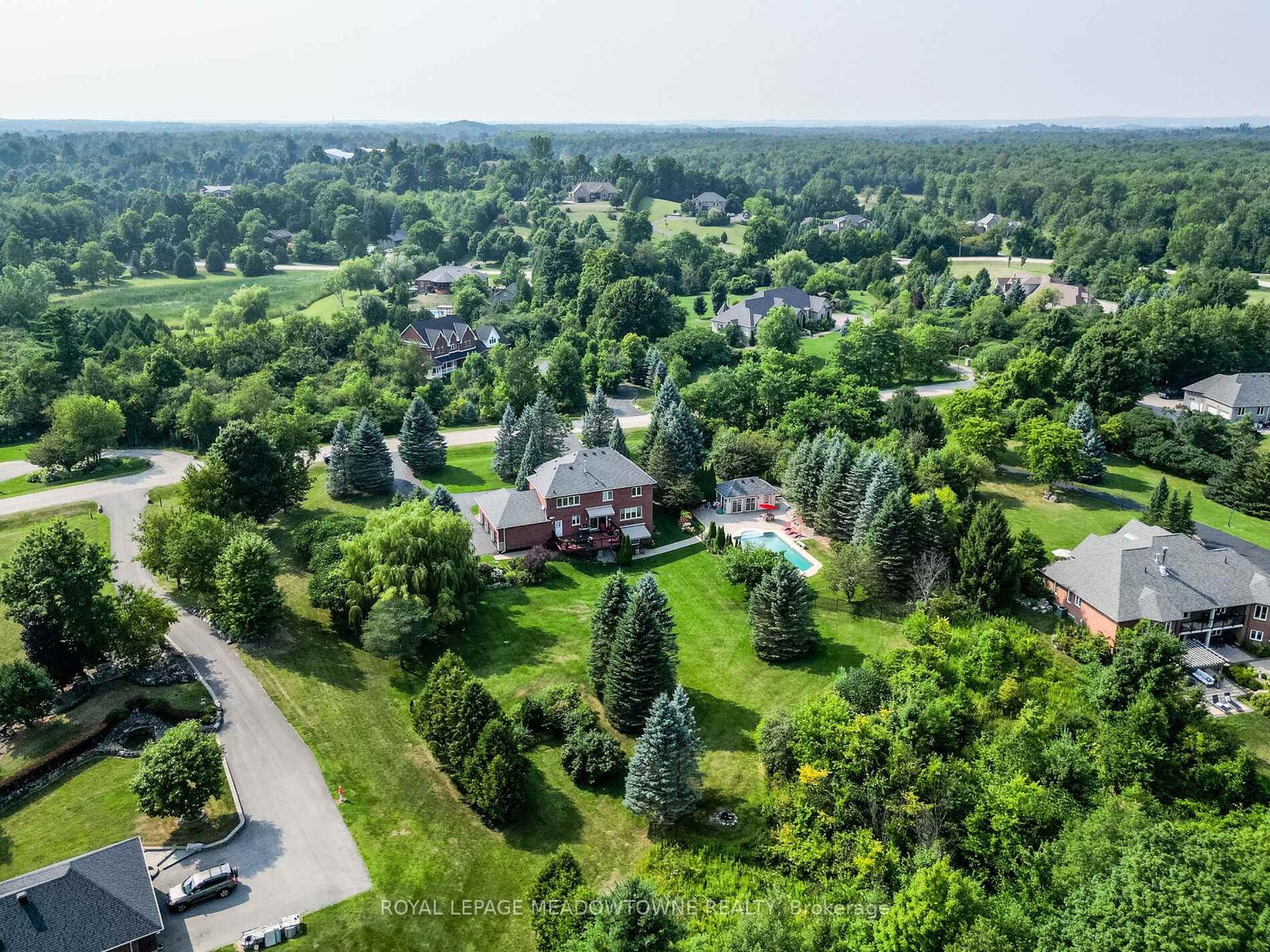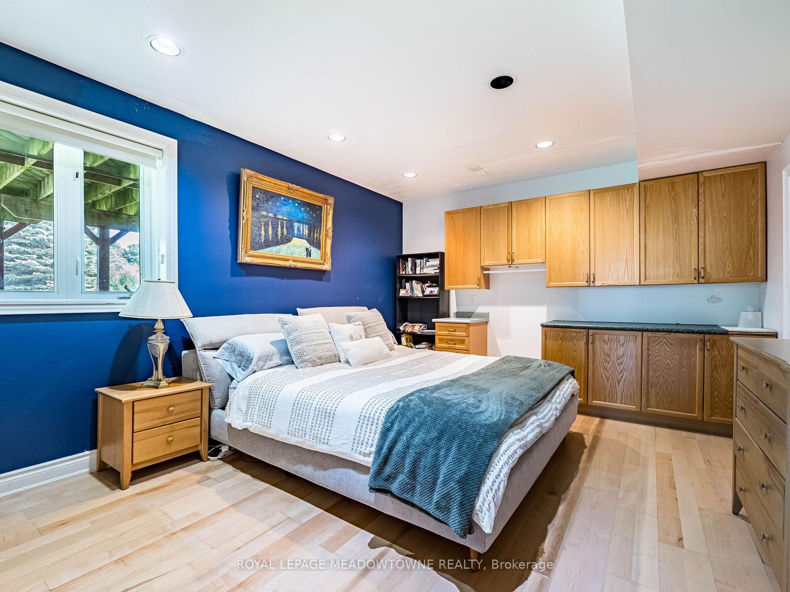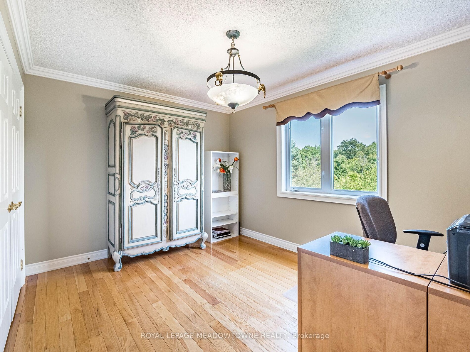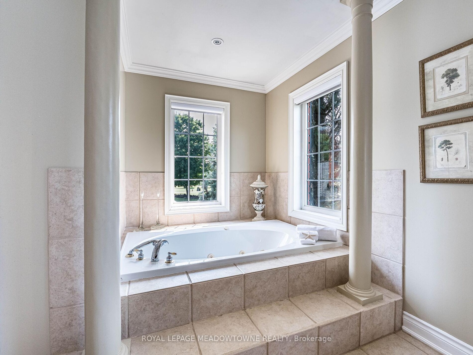 Welcome to 8 Deer Run an exceptional property in a sought-after executive estate subdivision. This private retreat sits on nearly 4 acres, including 1 acre of protected conservation. This beautifully maintained home offers approx. 3,100 sq ft above grade plus a walkout basement, combining timeless charm with modern upgrades. Perfect commuter location centrally located just minutes to Guelph, Milton, and Acton. The main floor features 9-ft ceilings, original hardwood, pot lights, crown moulding, a double-sided fireplace, and French doors opening to a coffered living room. The spacious eat-in kitchen includes granite countertops, travertine backsplash, built-in oven and cooktop, freezer, breakfast bar, walk-in pantry, and walkout to a 4-year-old deck with gas hookup and awning. A mudroom with laundry and deck access complements the 3-car garage. Upstairs offers 4 generous bedrooms, oak staircase with runner, pot lights, and original strip hardwood. The primary suite features double-door entry, fireplace, large walk-in closet, and 6-pc ensuite with Jacuzzi tub, walk-in shower, linen storage, and new toilet. Updated 4-pc main bathroom and additional linen closet complete the level. The finished walkout basement with separate entrance to the in-law suite offers 9-ft ceilings, pot lights, above-grade windows, a 3-sided fireplace, wet bar, cold room, and bedroom with stove connection and huge walk-in closet (or use as second bedroom) plus 3-pc ensuite and laminate flooring. The fenced-in 7-ft deep pool is thermal heated with a 2-year-old pump and filter. Enjoy a fully equipped pool house with running water and electricity, interlock walkway, perennial landscaping, sprinkler system, electric dog fence, surround sound, and outdoor fridge/freezer. Roof on house and pool house replaced 4 years ago with new gutters and guards. A true oasis with incredible privacy, just minutes to amenities