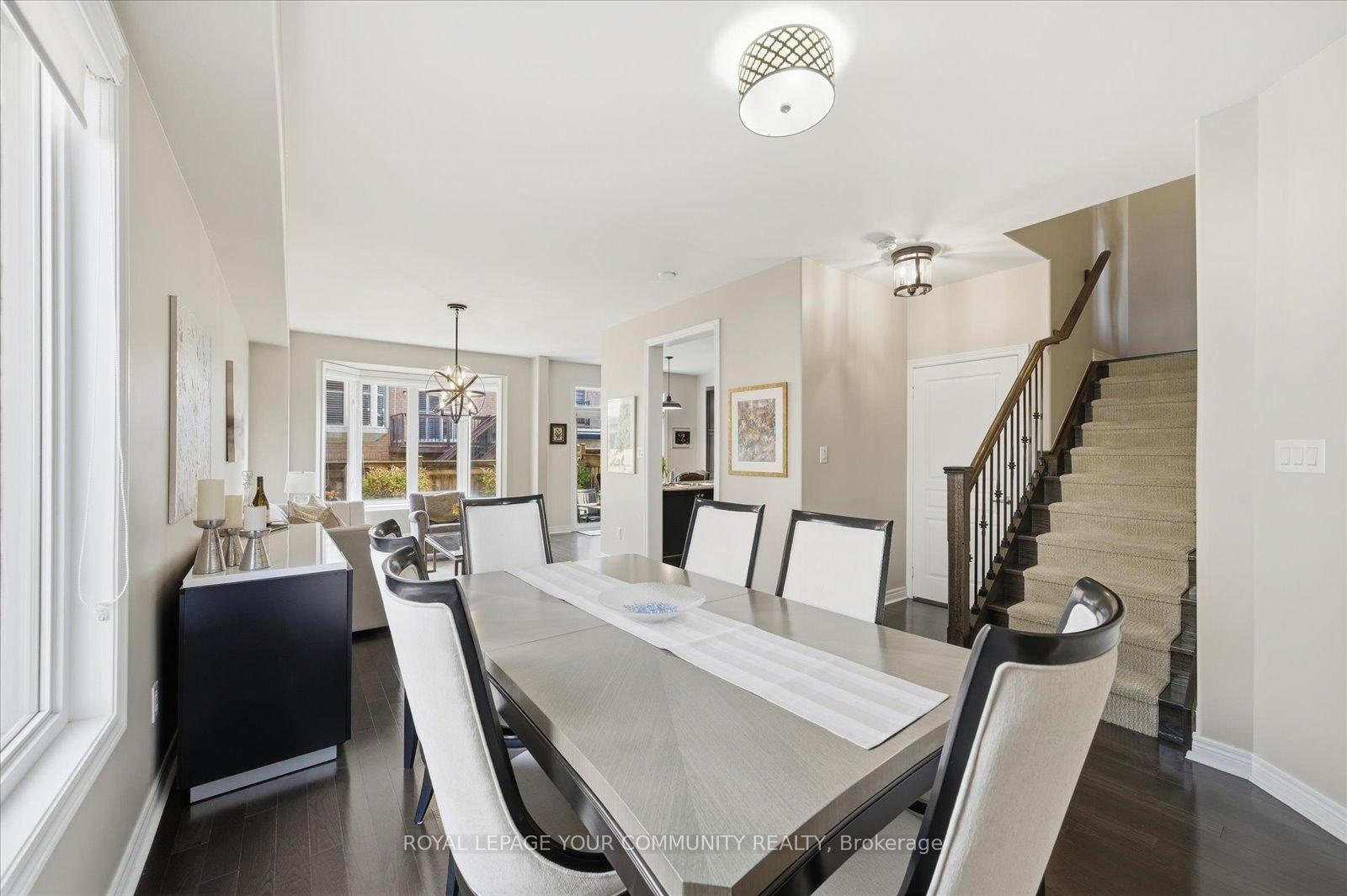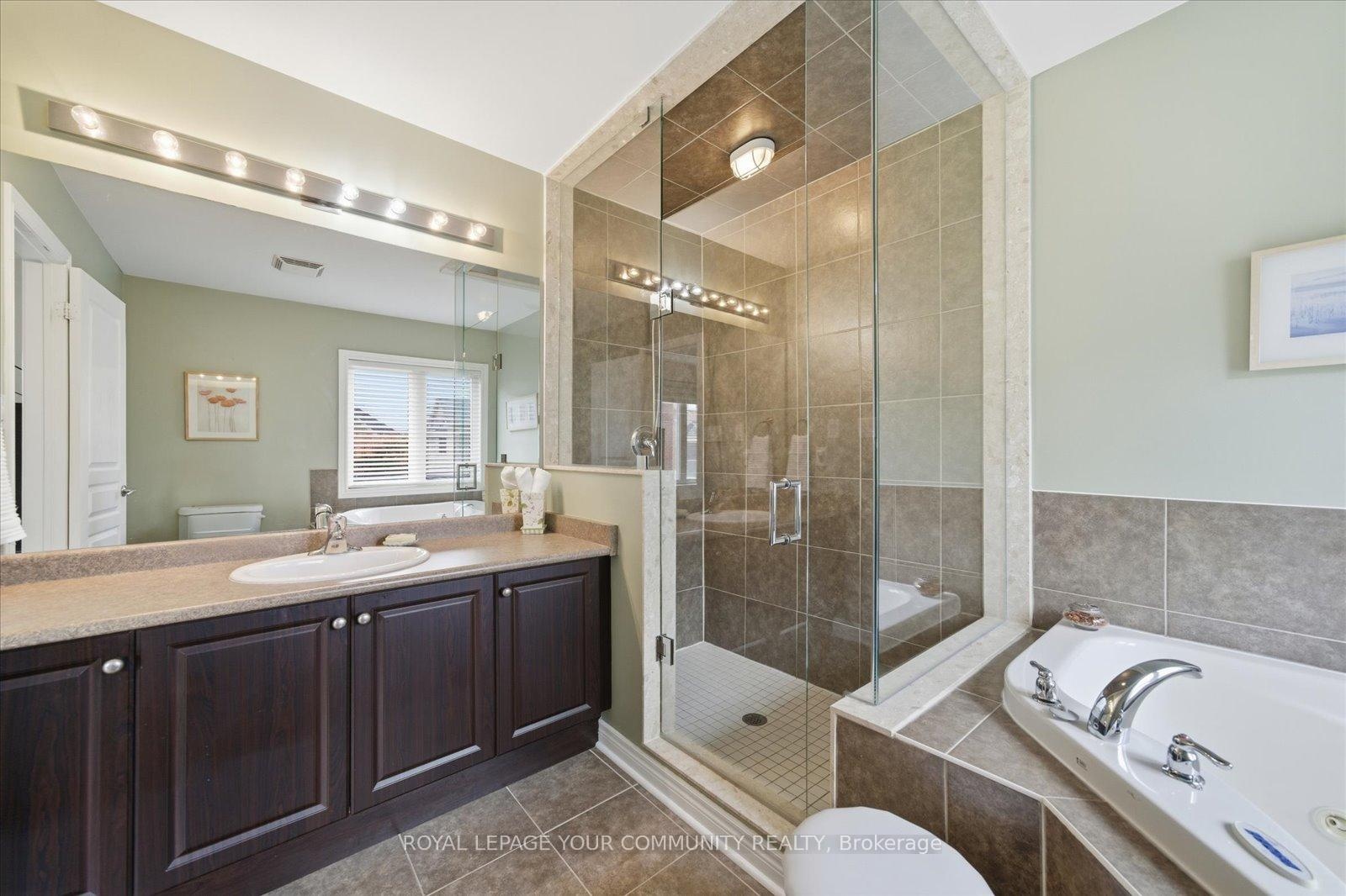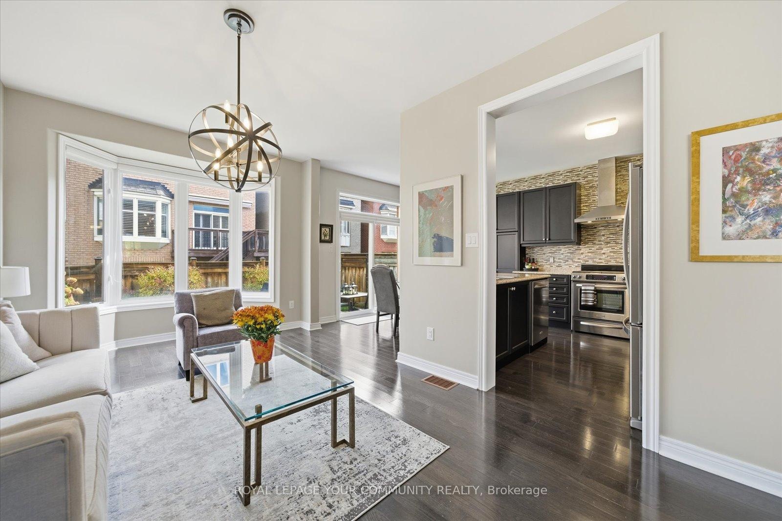 Your Search Ends Here! Don't miss this rare opportunity to own a beautiful 3-bedroom end-unit link home on a quiet crescent in sought-after Thornhill Woods! Featuring a 2-car garage and a driveway for 4 vehicles, this sun-filled home offers 9-ft ceilings, rounded corners, and dark-stained hardwood floors throughout the main level. The combination living and dining room boasts a charming bay window, while the modern kitchen includes stainless steel appliances, a pantry, and a bright eat-in area with a walkout to the extended patio and landscaped, fully fenced backyard - perfect for entertaining! Upstairs, relax in the cozy family room with gas fireplace and French doors leading to a walk-out balcony. The spacious primary suite features large windows, a walk-in closet, and a 4-piece ensuite with jacuzzi tub and large glass shower. There are two additional bedrooms, a 4-piece bathroom with private toilet and tub, an upstairs laundry room with stainless steel front loading washer and dryer, and a large linen closet that completes the upper level. The unfinished lower level includes a cold cellar and rough-in plumbing- ready for your personal touch. Ideally located near top-rated schools, parks, Community Centre, shops, public transit, GO Station, and Hwy 407. Move-in ready and waiting for you - this one won't last!