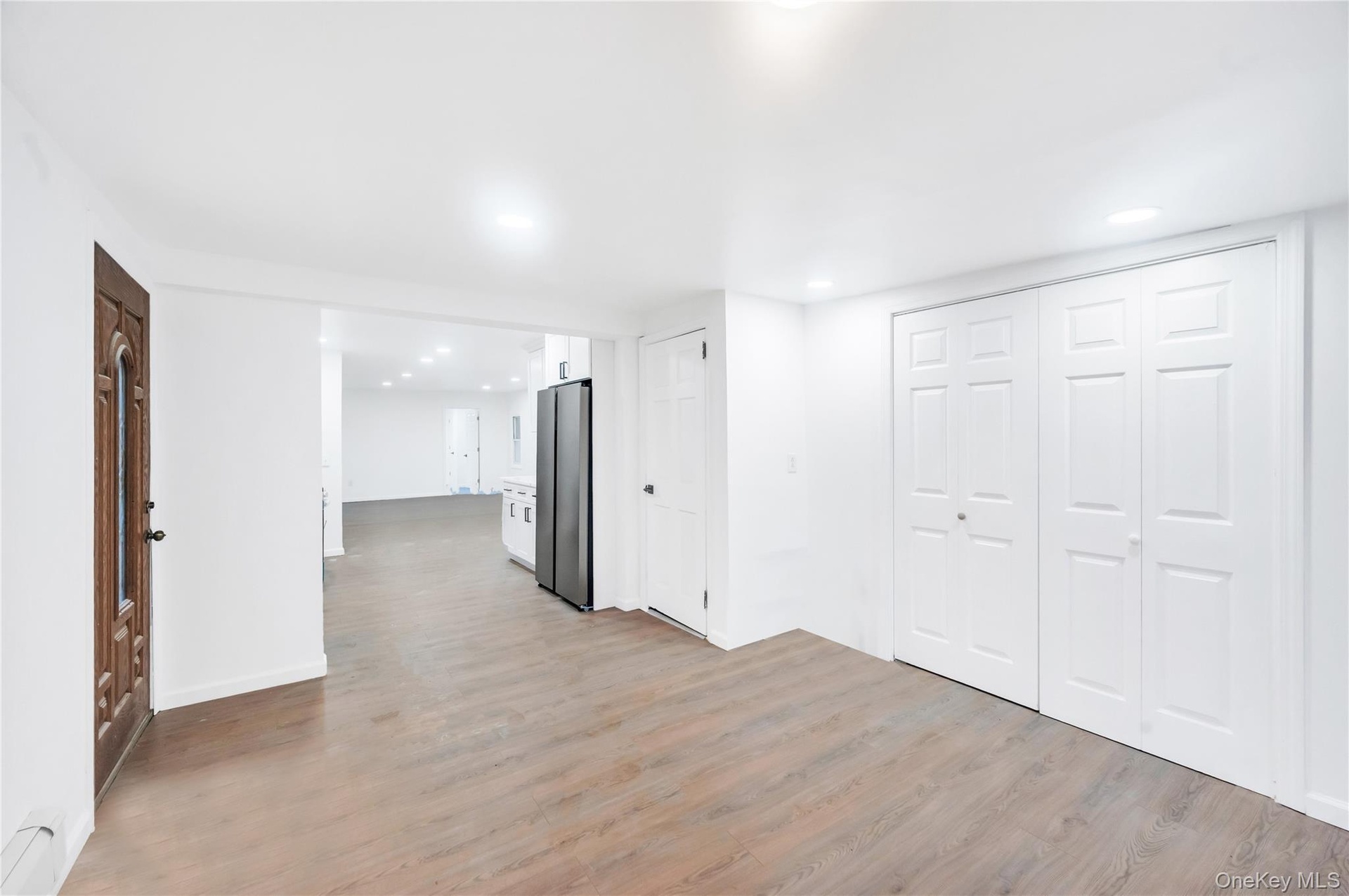 - Hall featuring light wood-type flooring, baseboard heating, and recessed lighting