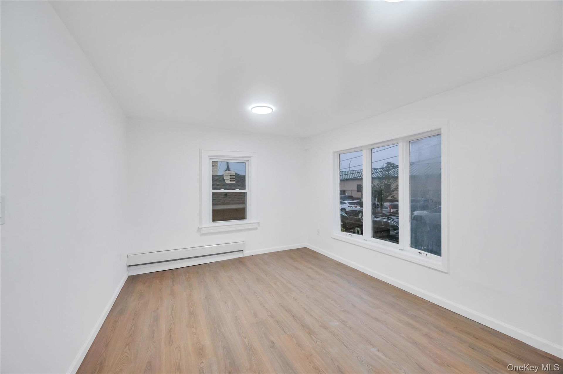 - Unfurnished living room with a baseboard radiator, light wood-style flooring, stairway, recessed lighting, and a wall mounted air conditioner