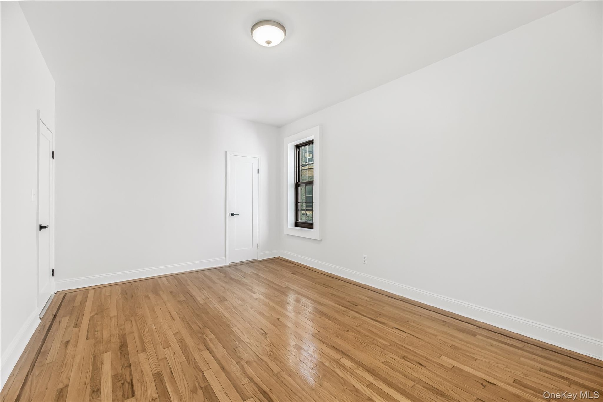 - Empty room with light wood-style floors and baseboards