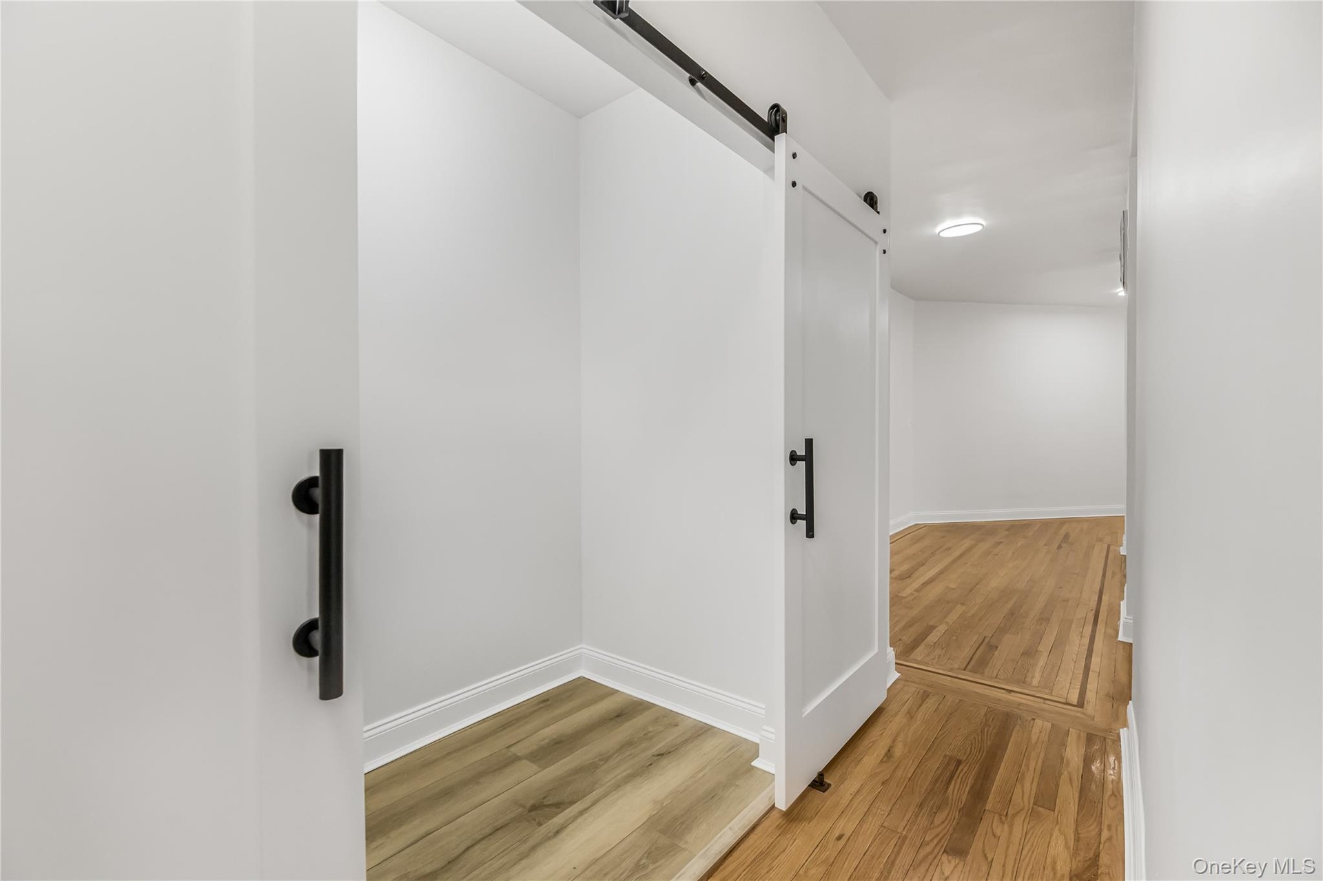 - Corridor with a barn door and light wood-style flooring