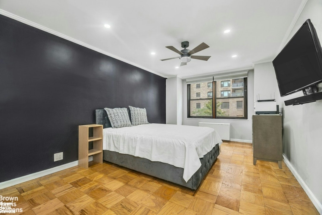 - Expansive Living Space: The oversized living room, with its wall of west-facing windows, offers abundant natural light and a sense of openness. Refinished parquet floors add warmth and character throughout the home.