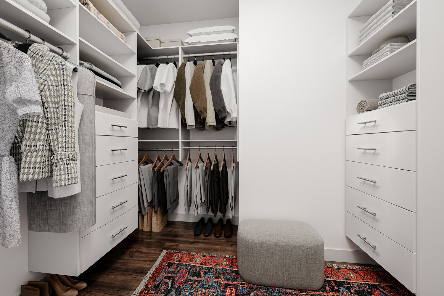 The primary bedroom is a sanctuary of its own with plenty of space for a king-sized bed. The high ceilings are accentuated with a beautiful, curved ceiling design. Premium upgrades include a custom-built desk, and a fully built-out walk-in closet offers ample storage space. The en-suite spacious marble bathroom is a delight with a double sink vanity and large walk-in shower.