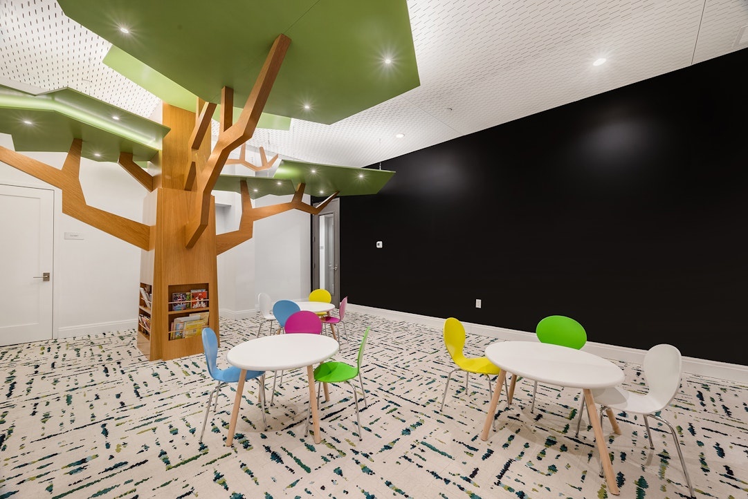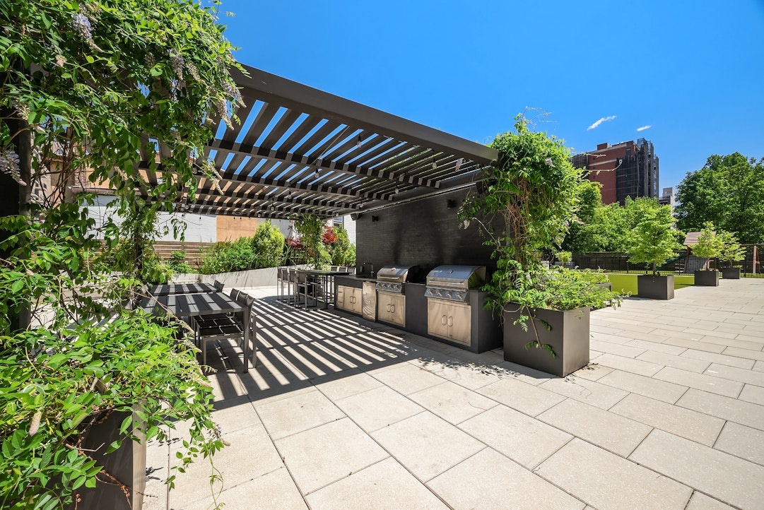 575 Fourth's robust amenities include a double-height attended lobby, well-appointed state-of-the-art fitness center with adjoining yoga studio, whimsical children's playroom, music-room, game room and modern resident lounge with work spaces. Multi-floored bicycle storage ensures quick and easy storage. Enjoy sweeping views of the Brooklyn and Manhattan skylines, New York Harbor and Statue of Liberty from the building's common roof deck featuring sundeck, outdoor showers, lounge area, and dining area with BBQ grills. A second greenspace with outdoor great lawn, trellis-covered al-fresco dining area with adjacent BBQs, children's playground and fenced dog run provides spaces to play, relax, and recharge. Indoor parking, private rooftop cabanas, and private storage available for additional fees.