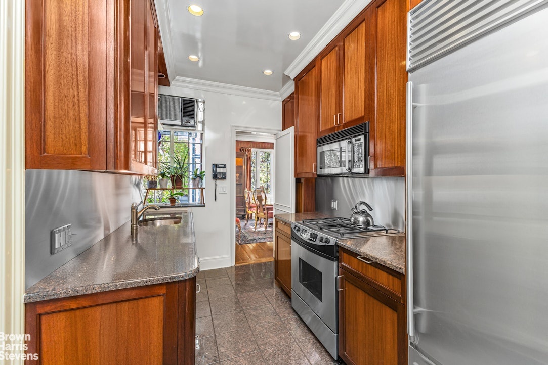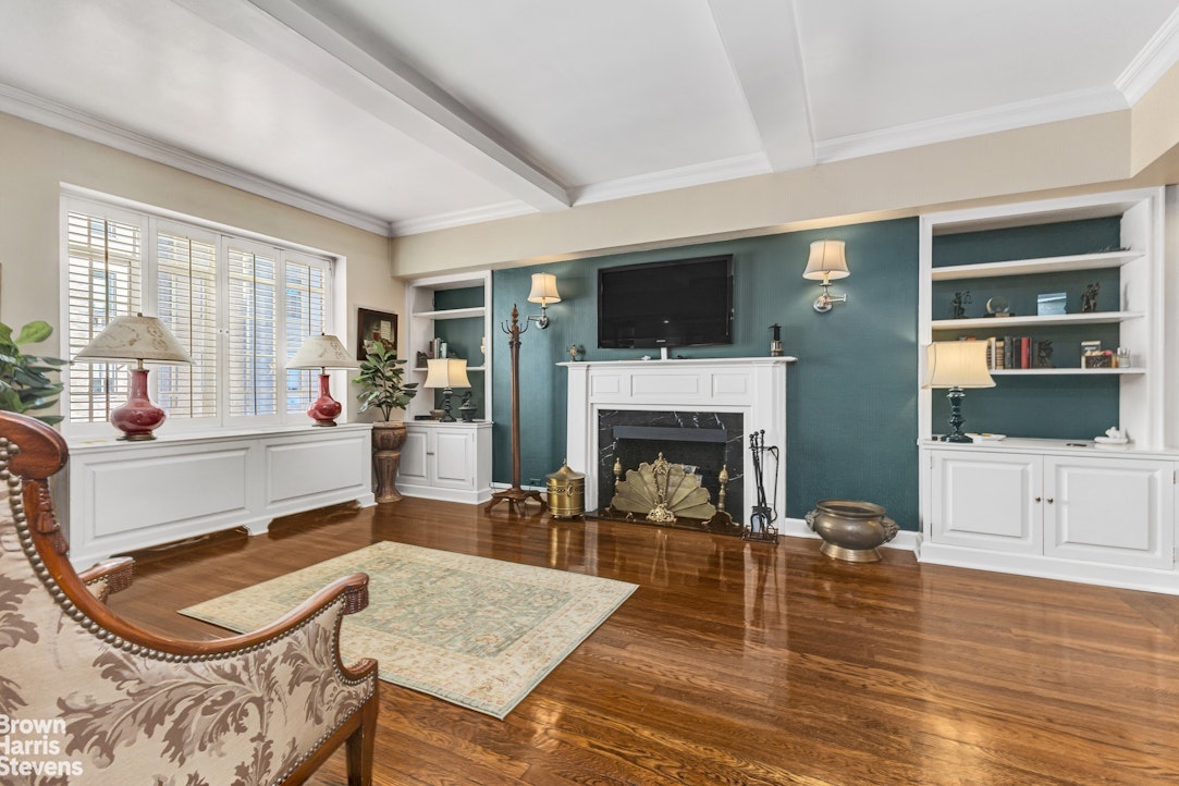 Inside, the 11th floor unfolds with 10-foot ceilings, a wood-burning fireplace, hand-pegged oak floors, and a rare continuity of light and air, with French doors in every room opening onto the terrace. A dramatic 60-foot-long arched gallery creates a natural rhythm between the formal living and dining rooms, perfect for grand entertaining. The stately dining room looks onto the garden terrace, while the windowed chef's kitchen-finished in rich mahogany and granite-offers both craftsmanship and comfort. A powder room with skylight and a flexible staff room (currently used as an office) complete the upper level.