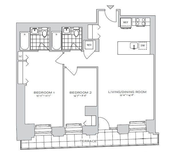 Large two bed two bath apartment features a designated dressing area along with an en-suite primary bath, gourmet kitchen with stainless steel appliances, stone countertops and an eating bar, high ceilings, wood floors throughout, and in-unit washer/dryer.