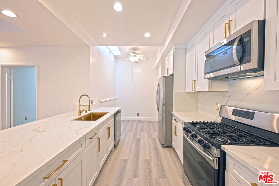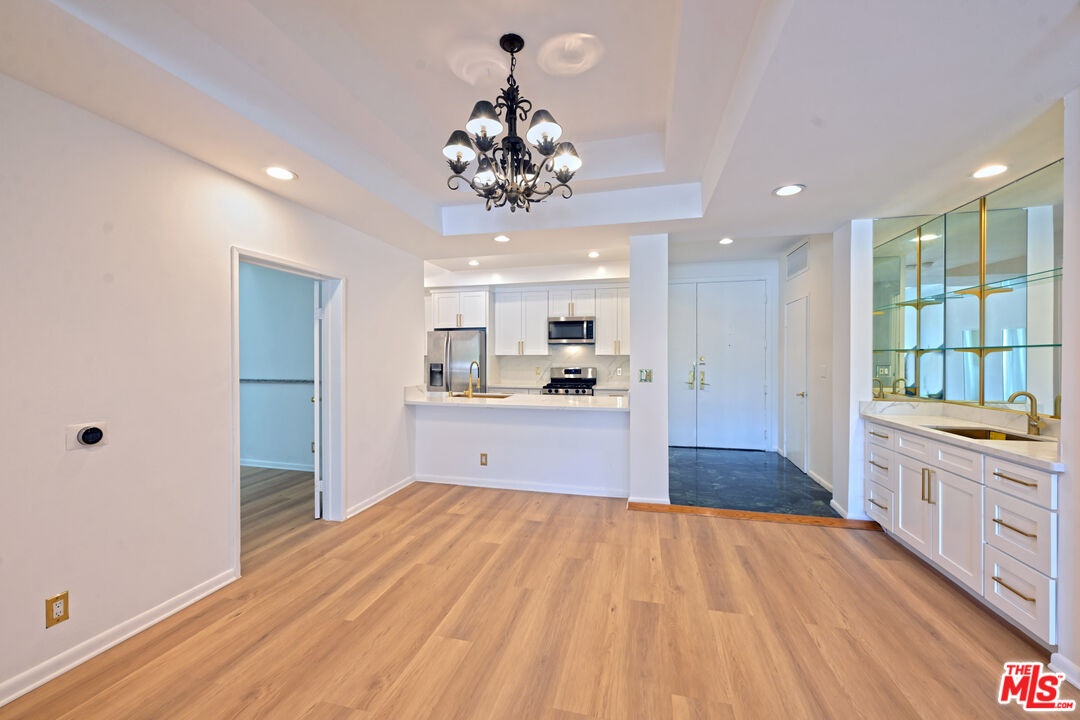 Exquisite Beverly Hills Penthouse with High Ceilings & Sweeping Views . Discover serene luxury in this recently remodeled two-bedroom penthouse in the prestigious "The Hamptons" complex. With a desirable split floor plan, each bedroom is positioned on opposite sides of the unit ideal for privacy each featuring its own en-suite bathroom, plus separate office and powder room w/sky lights. Step inside to soaring ceilings, new flooring, and abundant natural light from skylights and floor-to-ceiling windows that frame gorgeous open views. The spacious living room features a fireplace and opens to a large private terrace perfect for entertaining or relaxing under the stars. The stunning new kitchen boasts quartz countertops, sleek stainless steel appliances, and ample cabinetry. The luxurious primary suite offers downtown city views, a romantic fireplace, a generous walk-in closet, and a spa-like en-suite bath with separate soaking tub and glass-enclosed shower. The second bedroom also includes a walk-in closet and en-suite bath. Additional highlights: Side-by-side in-unit laundry, Two side-by-side parking spots. Resort-style amenities: pool, spa, fitness center, sauna. Unbeatable location near La Cienega Park, Beverly Hills Tennis Courts, The Beverly Center, fine dining, and houses of worship all within the acclaimed Beverly Hills School District. A rare find in one of L.A.'s most coveted addresses!