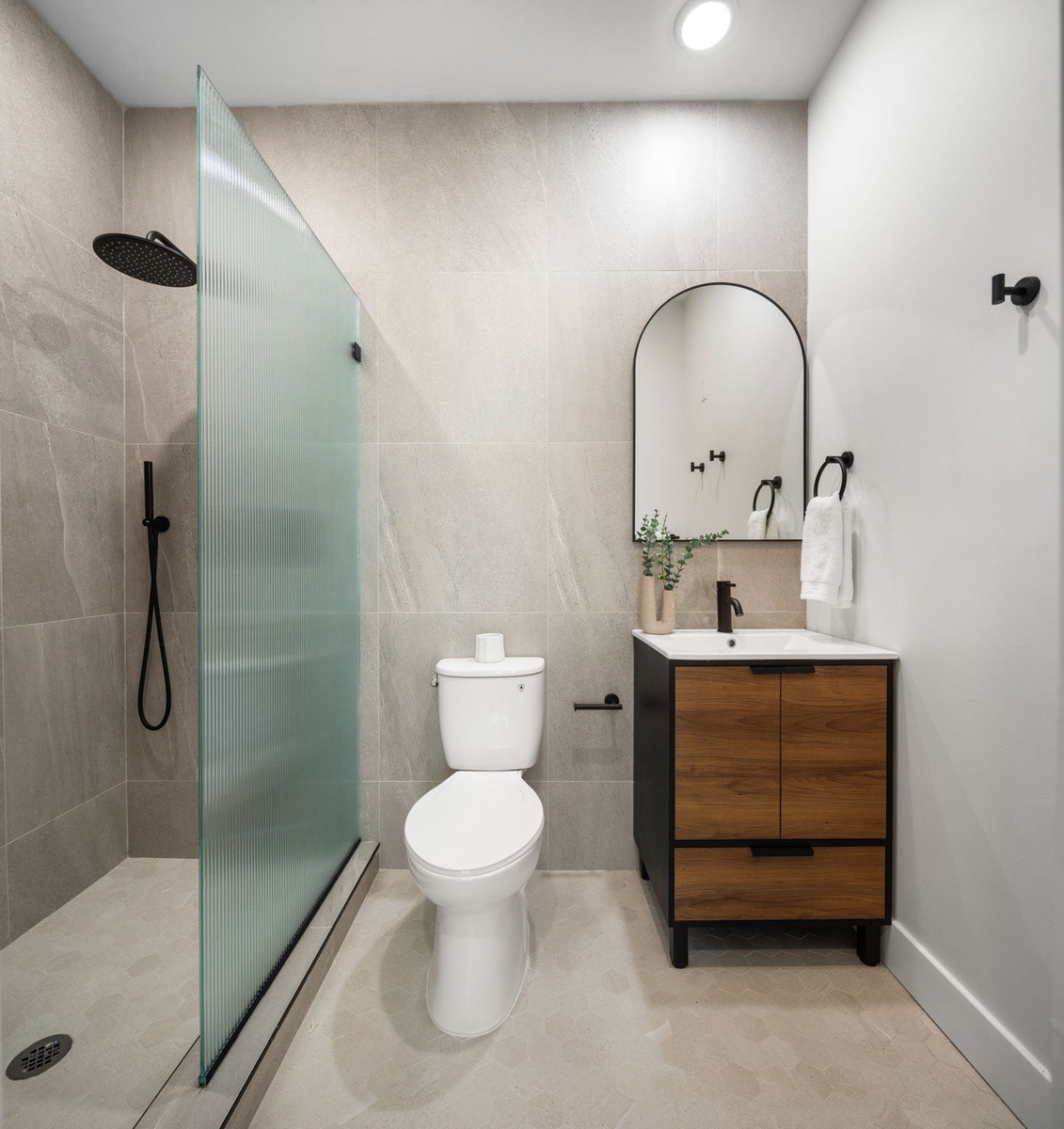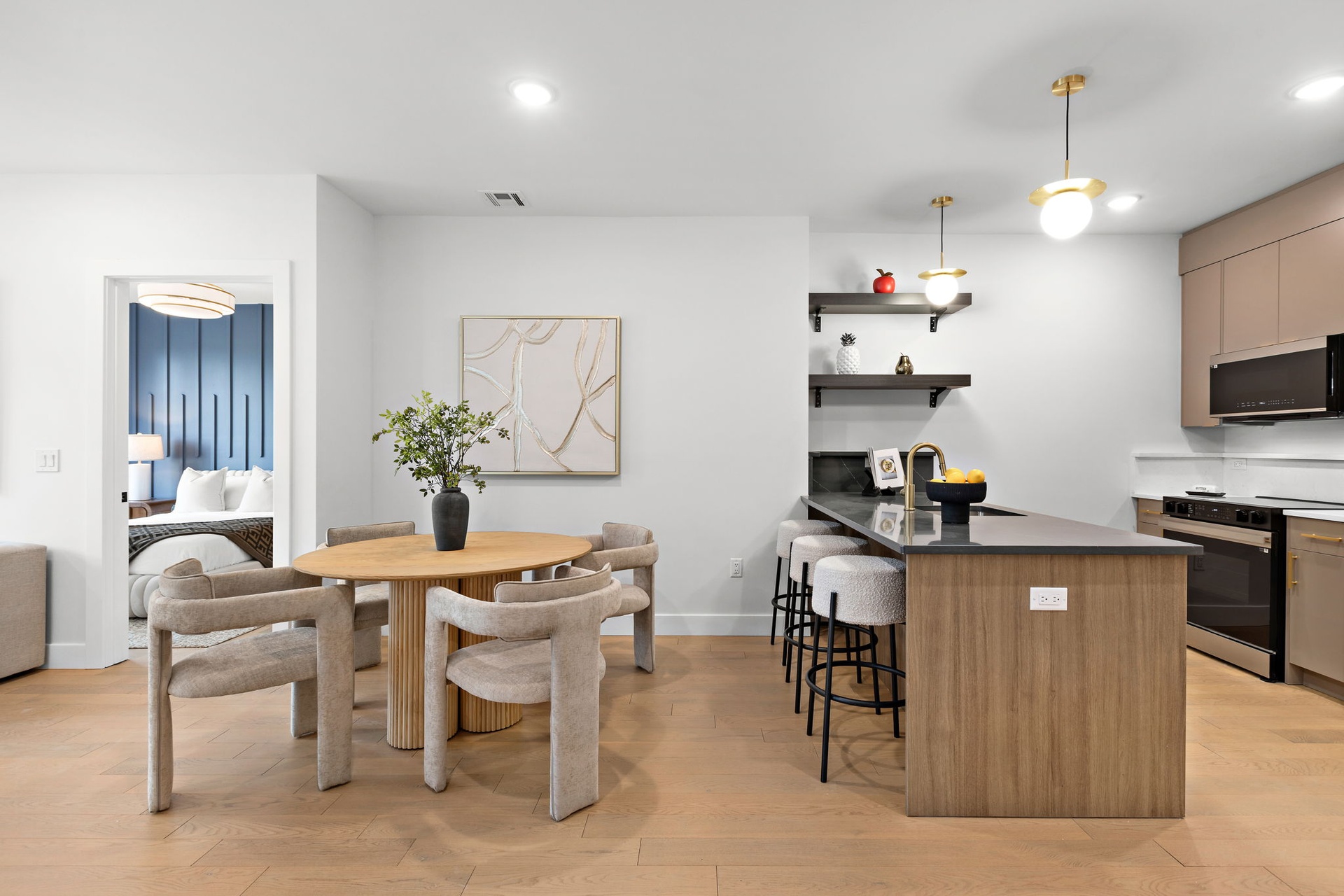 Each home has been curated with precision, blending modern elegance with everyday comfort. Kitchens feature sleek Samsung appliances, striking quartz countertops—including MSI Soapstone Metropolis and veined white finishes—paired with bold brass hardware and faucets. Select layouts also offer open wall shelving for a warm, personalized feel. Bathrooms are equally refined with matte black fixtures, porcelain tile, and reeded glass shower panels in the primary suites—balancing sleek design with inviting texture and tone. Expansive windows, engineered wood flooring, solid core doors, smart entry systems, and in-unit laundry round out a living experience rooted in style and function.