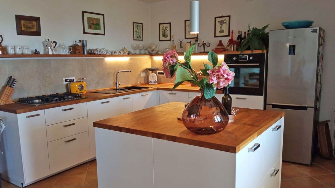 The second accommodation of approximately 70 sqm, perfect for hosting relatives and friends, offers a cosy living room, a well-equipped kitchen, two bedrooms and two bathrooms.