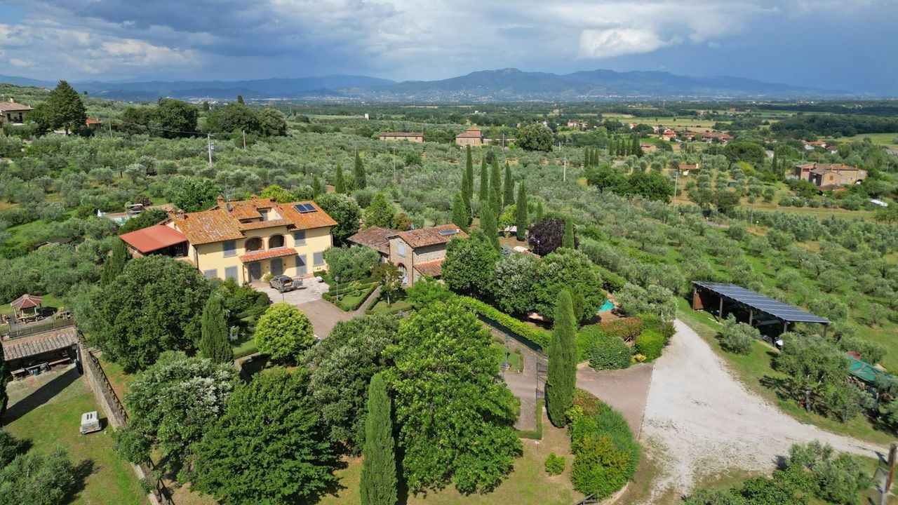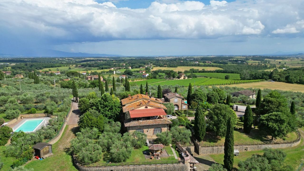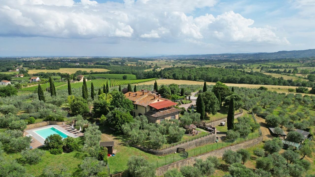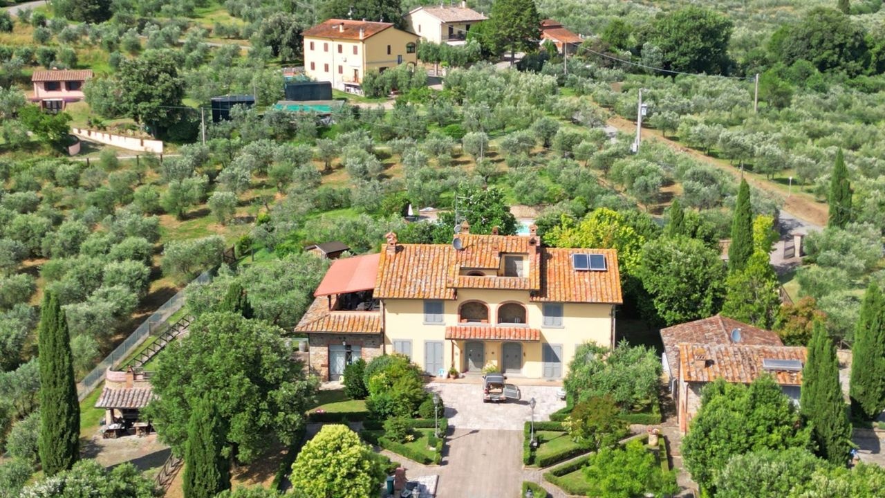 The first floor houses 2 double bedrooms, one with en-suite bathroom and loggia, a bathroom and a small bedroom with loggia. The villa is characterised by the typical rustic style of Tuscan houses, with terracotta and parquet floors.