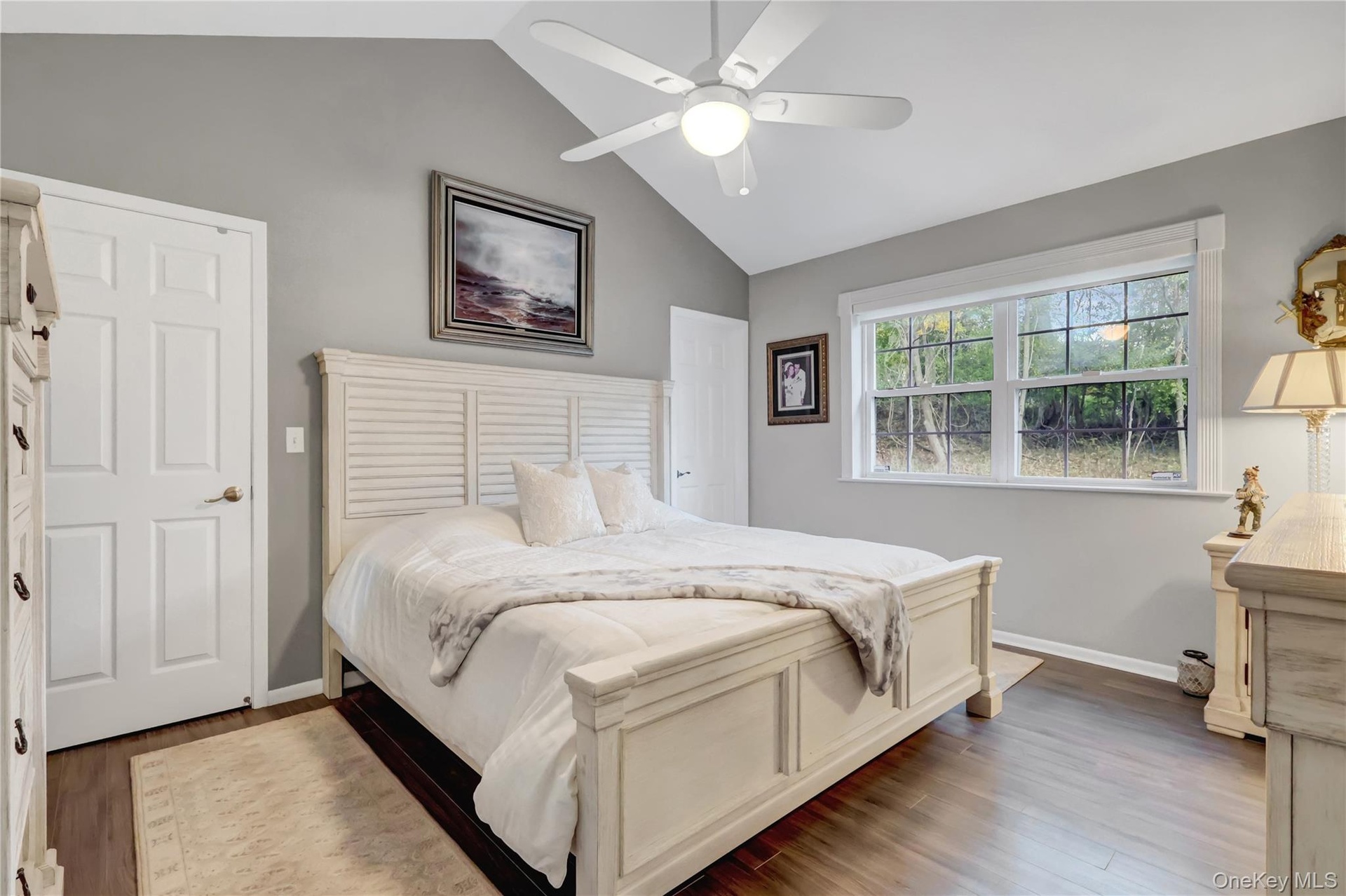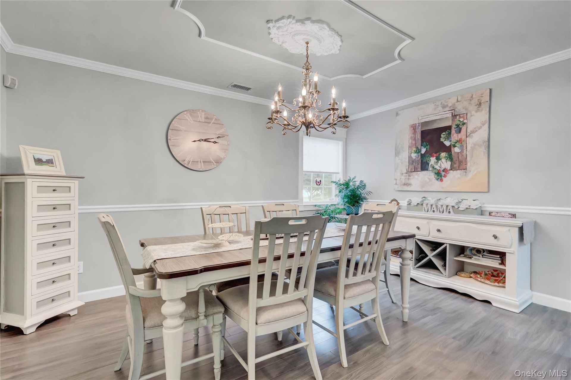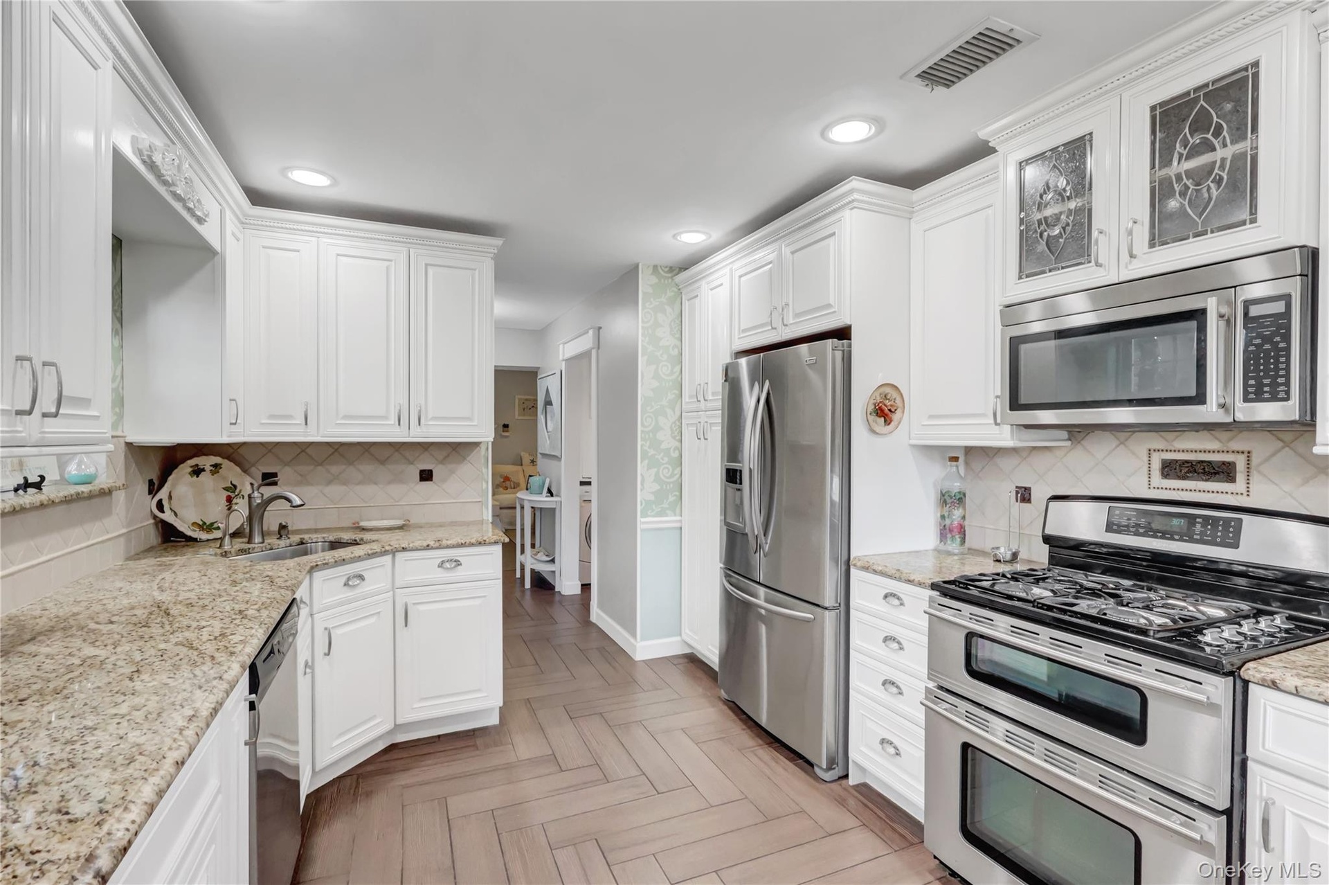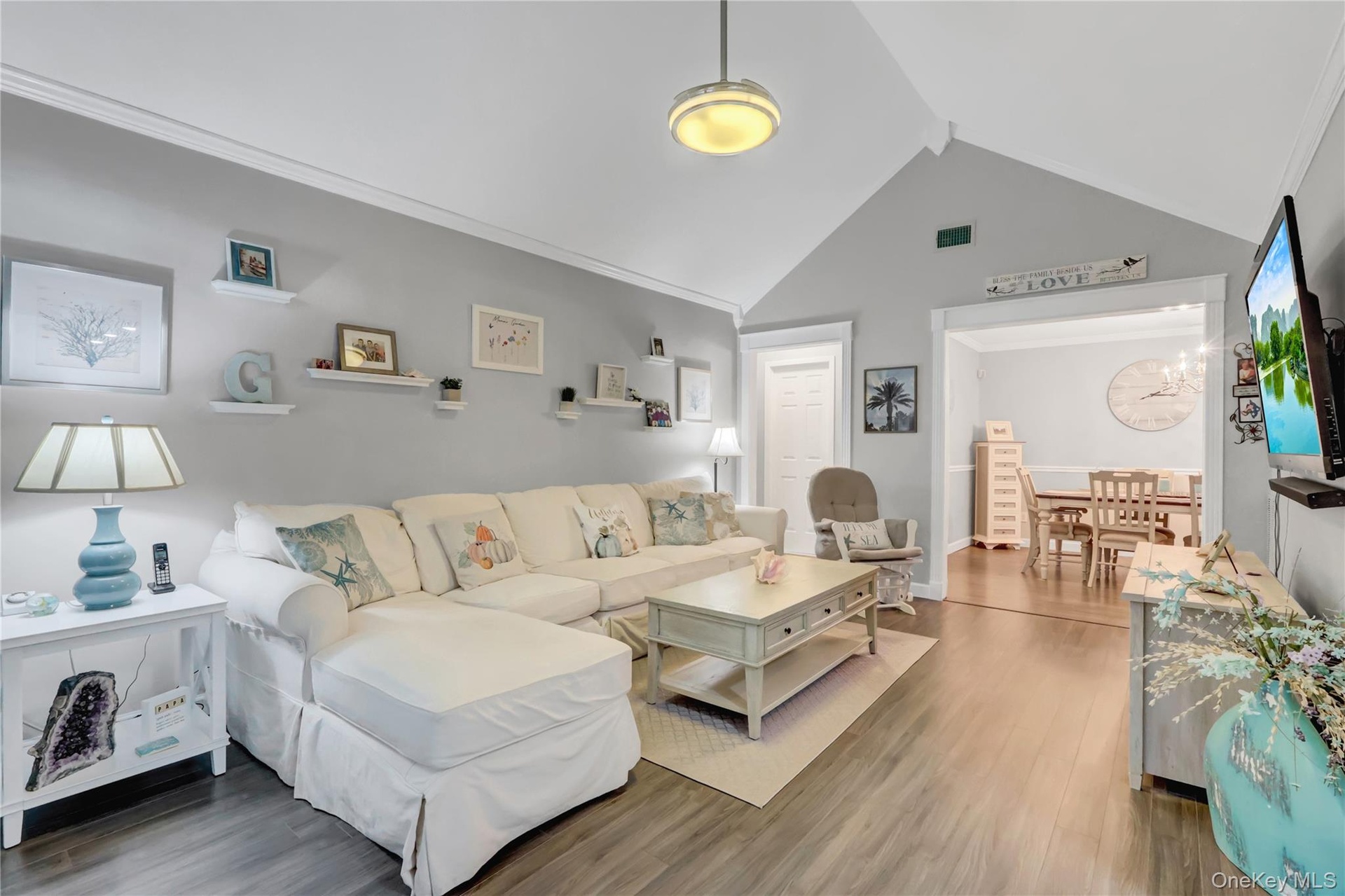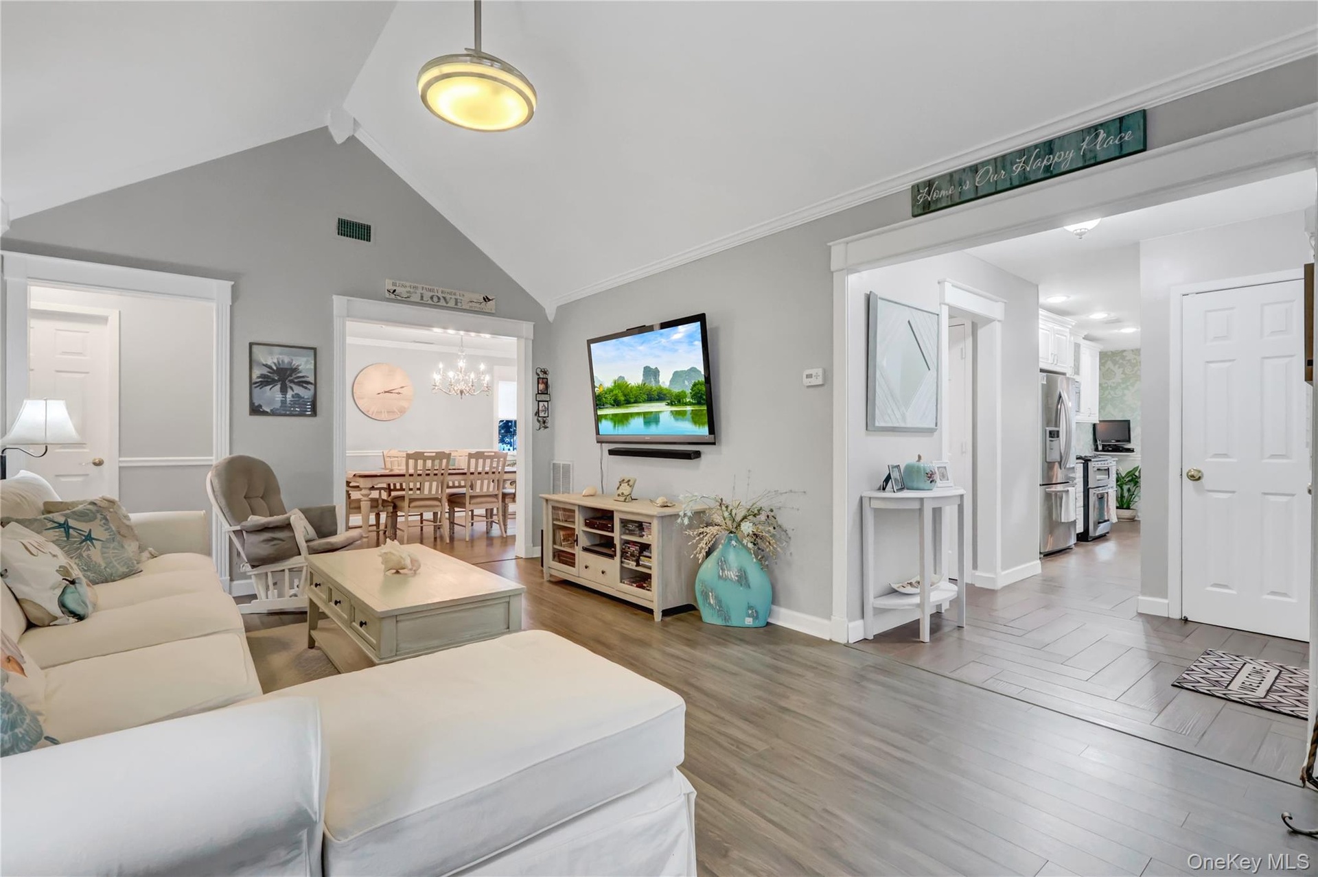 Step through the welcoming entry foyer and discover an open & airy layout featuring a formal living room with stunning vaulted ceilings and a formal dining room adorned with elegant crown molding. The updated eat-in kitchen showcases granite counters, stainless steel appliances, gas cooking, and a convenient pantry for all your storage needs.