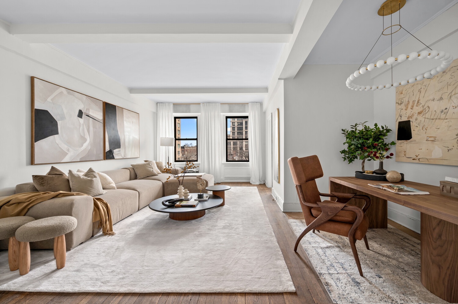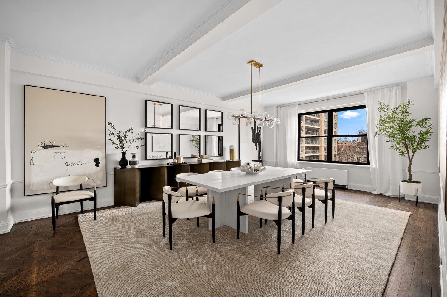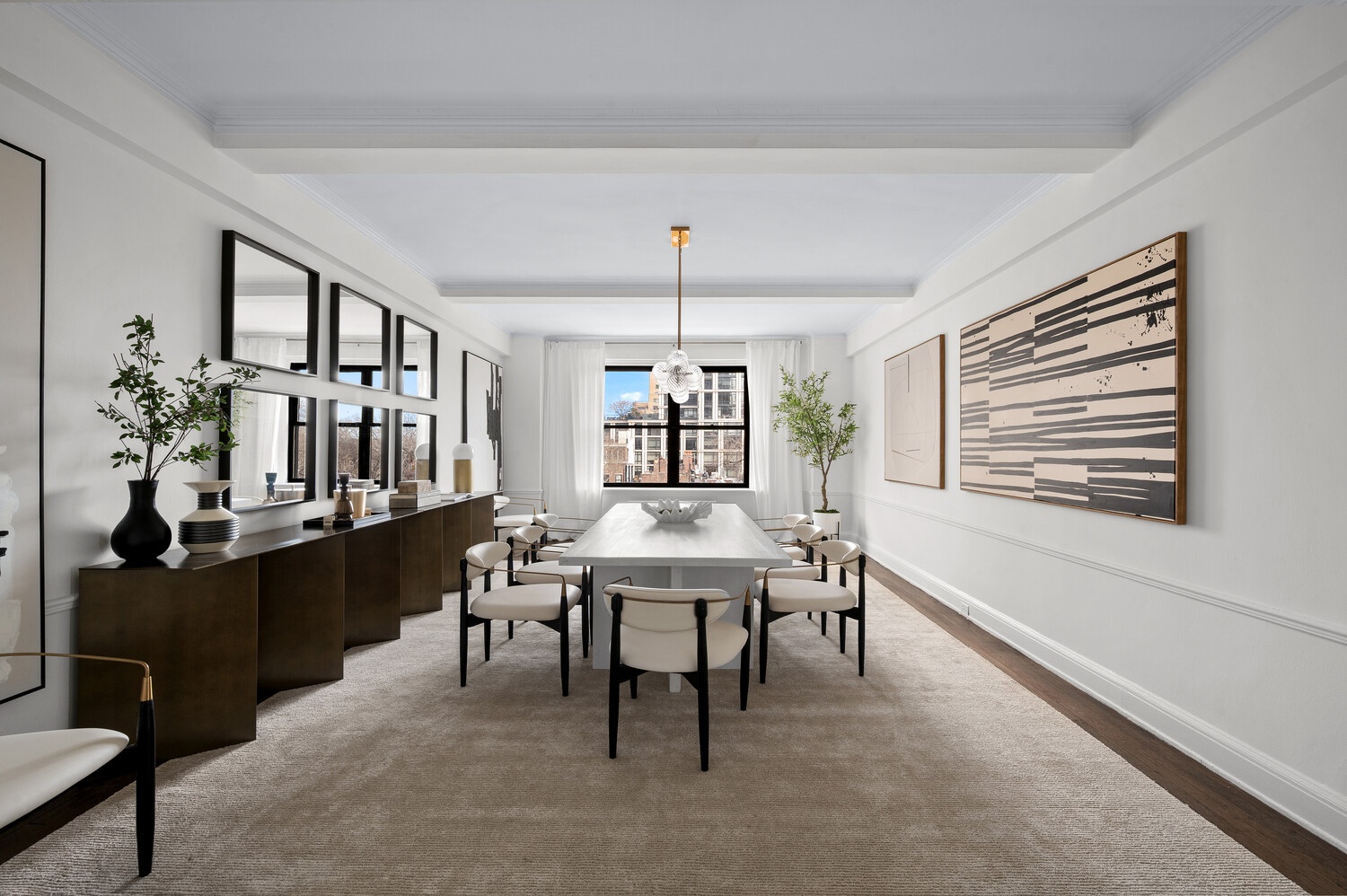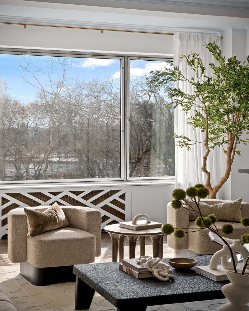A gracious central gallery introduces the apartment and flows effortlessly into the home's entertaining and private wings. The expansive living room, anchored by a wood-burning fireplace, is bathed in natural light and framed by picture-perfect vistas stretching over the park and river. The adjoining formal dining room-generous in scale and beautifully proportioned-offers an ideal setting for gatherings large or small.