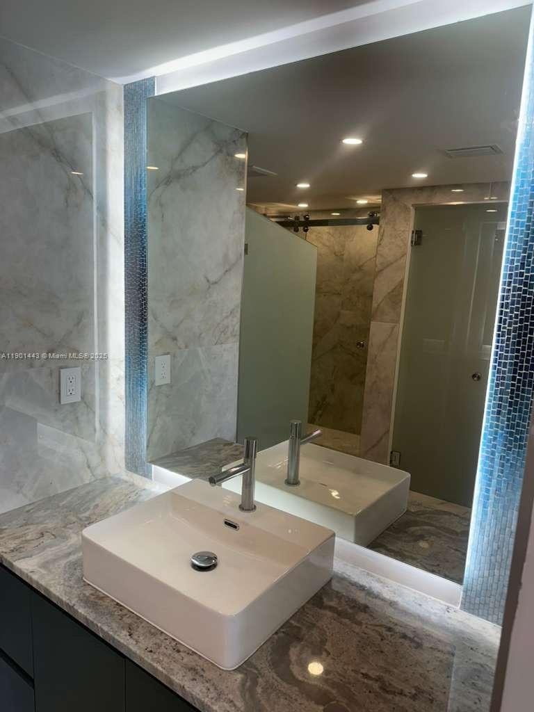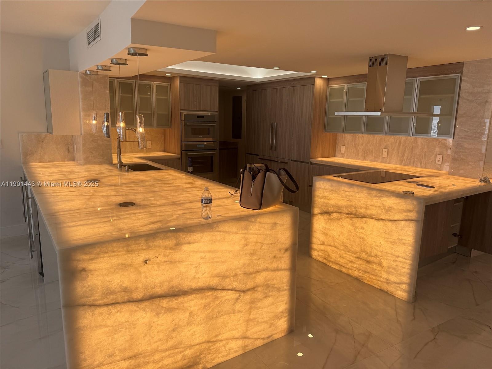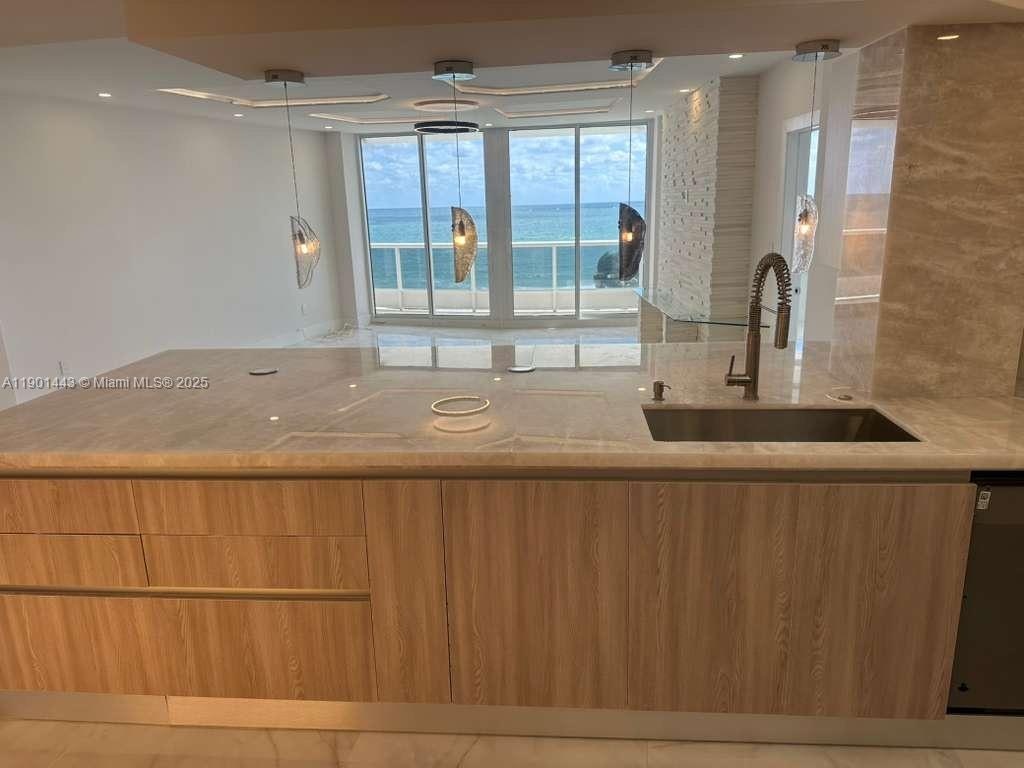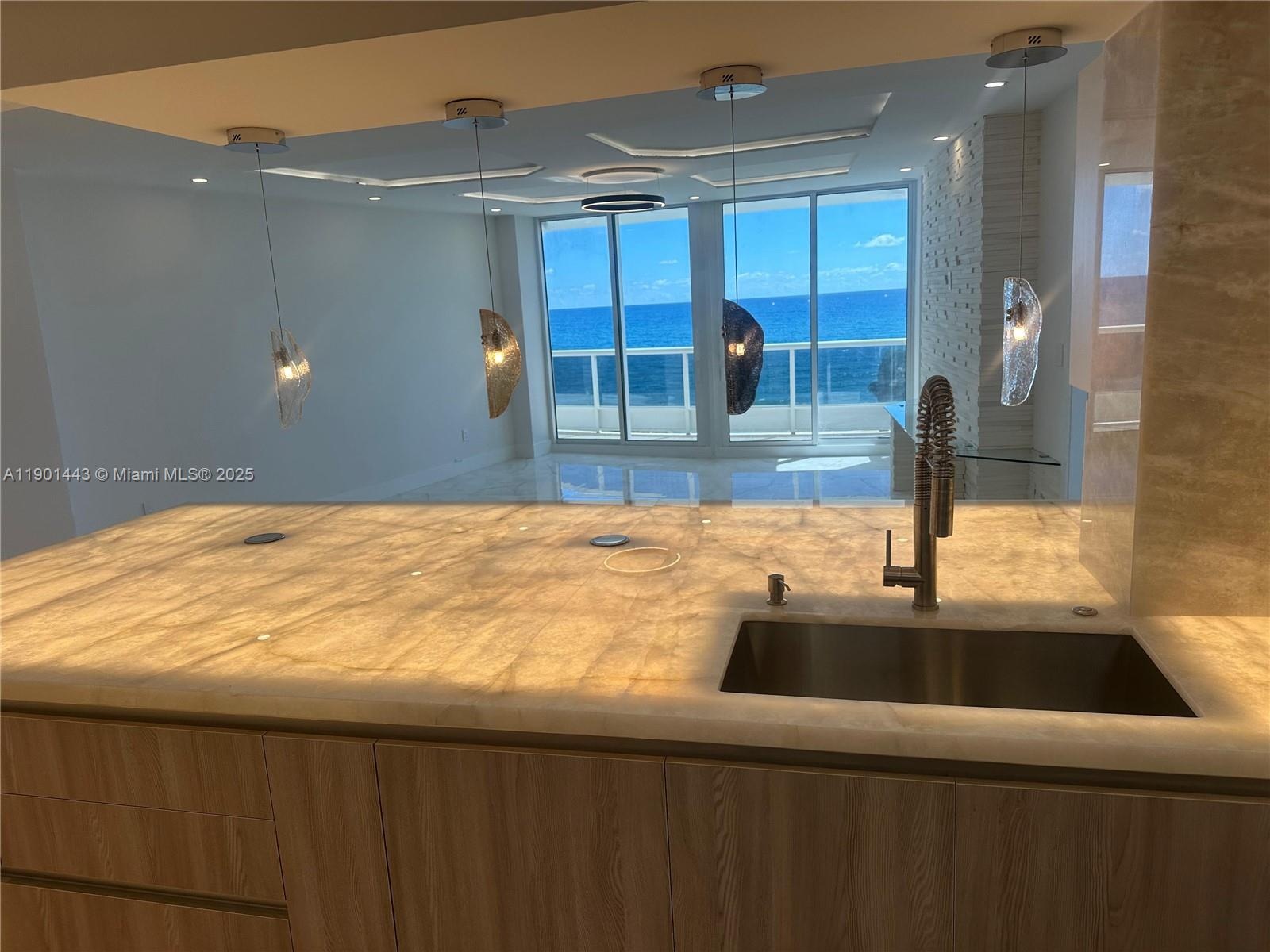 Exquisite oceanfront residence with 2 bedrooms and 2.5 baths, fully renovated and uniquely designed with impeccable detail. Spanning 1,900 sq. ft., this luxurious home is located in Sabal Point, a boutique building of only 70 units featuring a saltwater pool and private beach access. The custom kitchen showcases Thermador appliances, quartzite lit up counter tops , wine cooler, and artistic glass accents. The living and dining areas boast elegant ceiling LED lighting, designer finishes, and a stunning Custom Glass fireplace wall. Both bedrooms feature custom closets, glass doors, and spa-inspired baths with European fixtures. Recent building upgrades include concrete restoration, new roof, glass railings, impact windows, and a chic modern lobby.