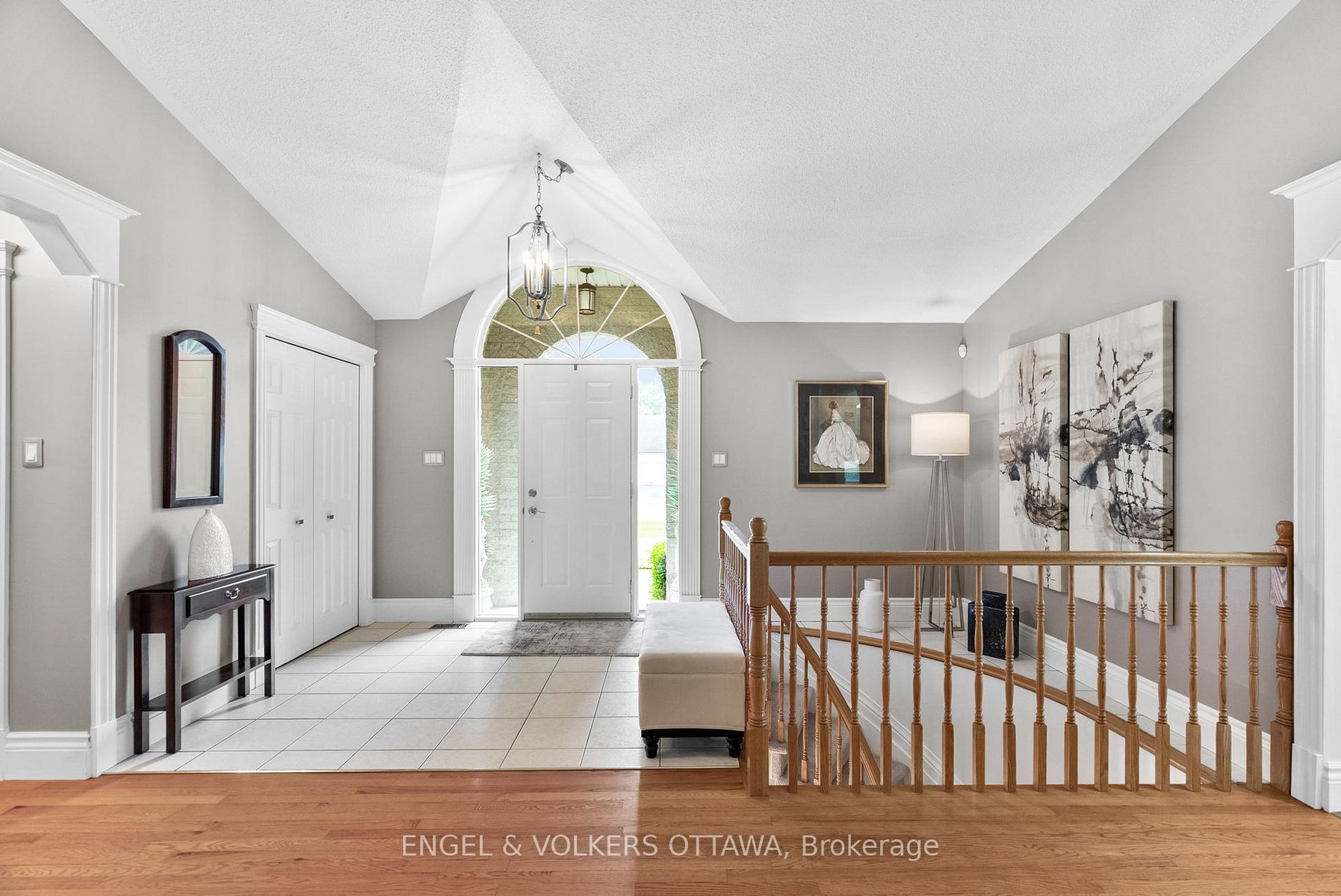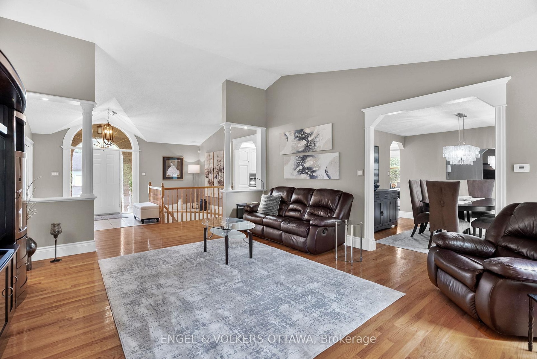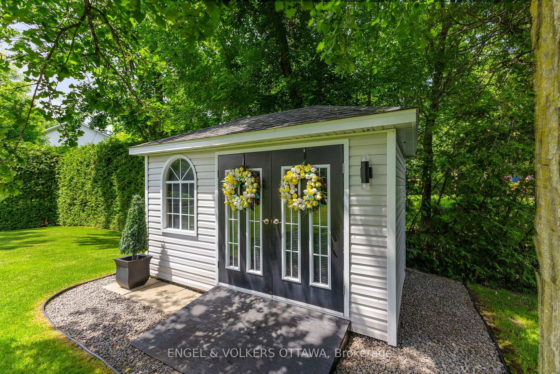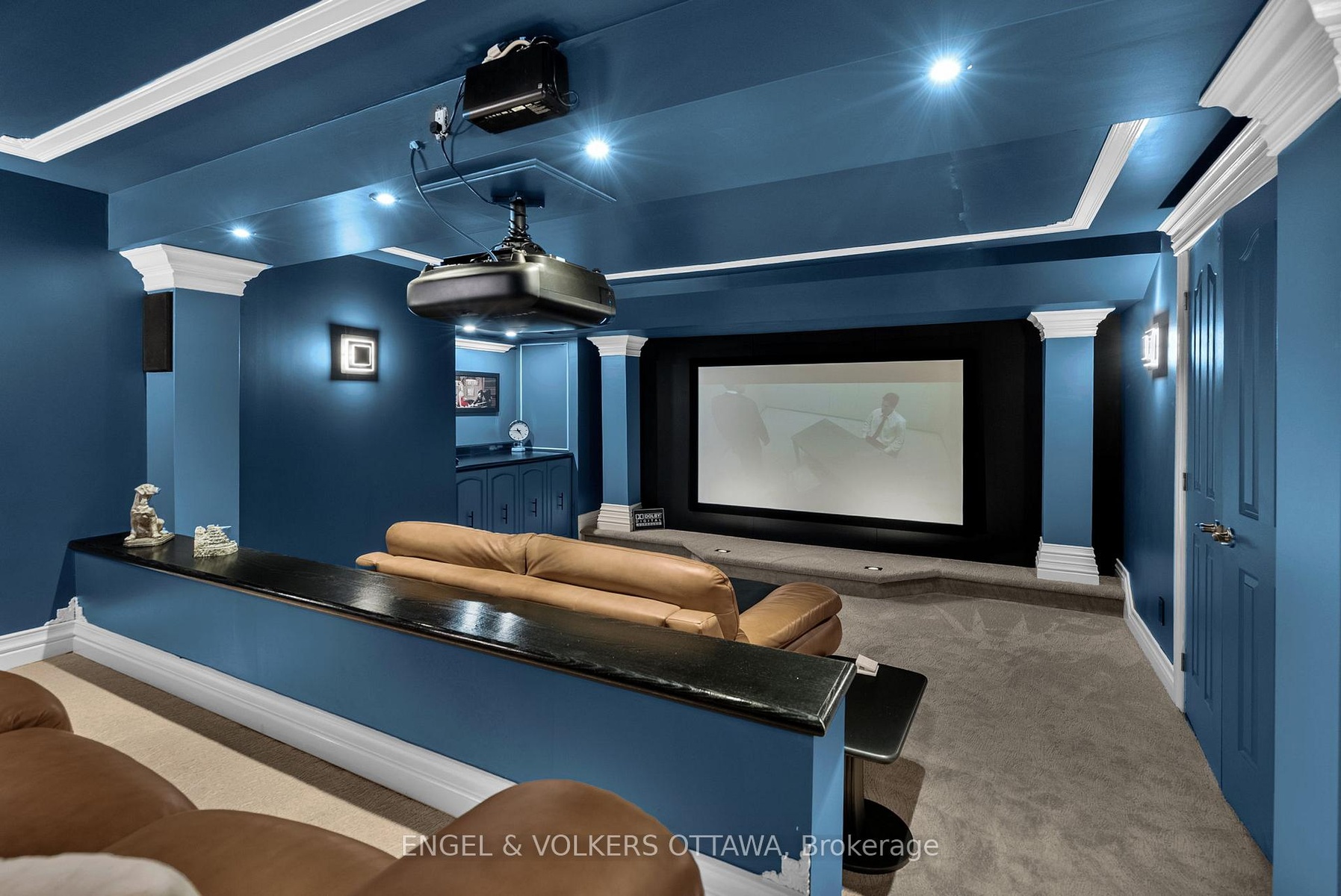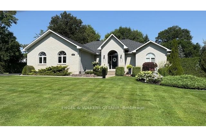 1591 Stephanie Anne Drive invites you to experience your very own private cinema - a spectacular two-level, soundproof home theatre designed for movie nights, sports, and next-level gaming, combined with luxurious living set on a beautifully landscaped corner lot. Surrounded by 20-foot hedges and set back from the road, this residence delivers privacy and distinction in one of Greely's most established communities. The main floor opens with a grand foyer boasting vaulted ceilings, ceramic tile, and hardwood floors flowing throughout. Anchored by a gas fireplace and soaring 13-foot ceilings, the living room exudes warmth and grandeur, while the formal dining room sets the stage for memorable gatherings. The designer kitchen features quartz counters, stainless steel appliances, and a large central island with pendant lighting. A bright adjoining eating area with oversized windows and French doors extends to a private backyard and two-level hardscape patios, perfect for evening relaxation. The primary suite offers a walk-in closet, custom wardrobe, and a luxurious 5-piece ensuite. A spacious secondary bedroom and beautifully finished full bath (all baths with quartz counters) complete the main level. A striking circular staircase leads to the lower level, where the theatre takes center stage with tiered seating and cinematic scale. Complementing this is an expansive recreation room, an additional bedroom (currently a gym), a home office, a sleek full bath, and a laundry room. Crafted with enduring steel construction, the home blends elegance with strength. Outdoors, manicured landscaping and an underground irrigation system impress across the property, while an oversized two-car garage, a sweeping circular driveway for 21 vehicles, and a large custom storage shed offer unmatched convenience. Minutes from schools, parks, shops, and nature trails, this home delivers Greely's tranquility with modern luxury and unforgettable entertainment at home with family and friends.