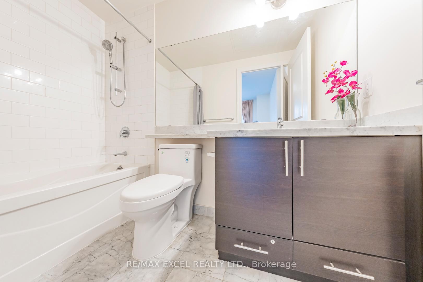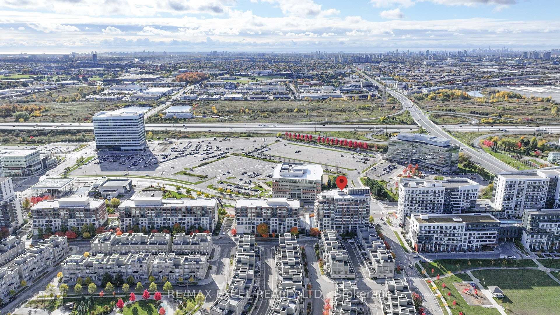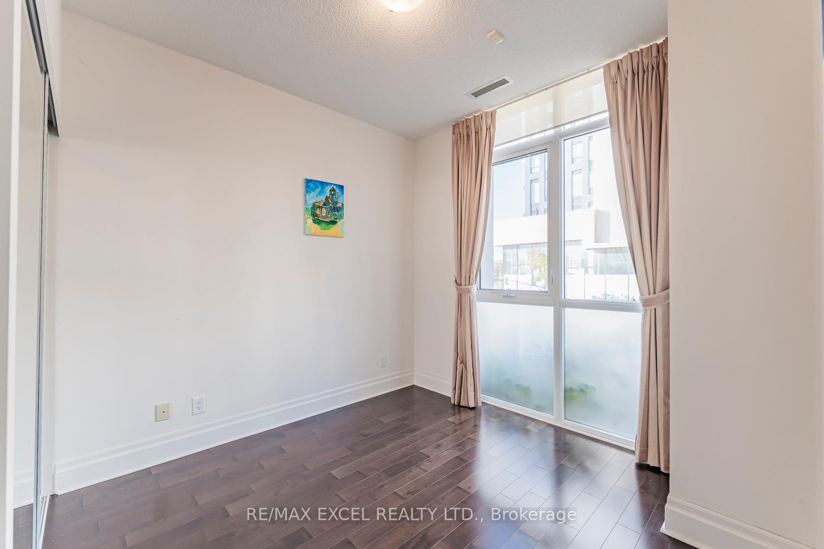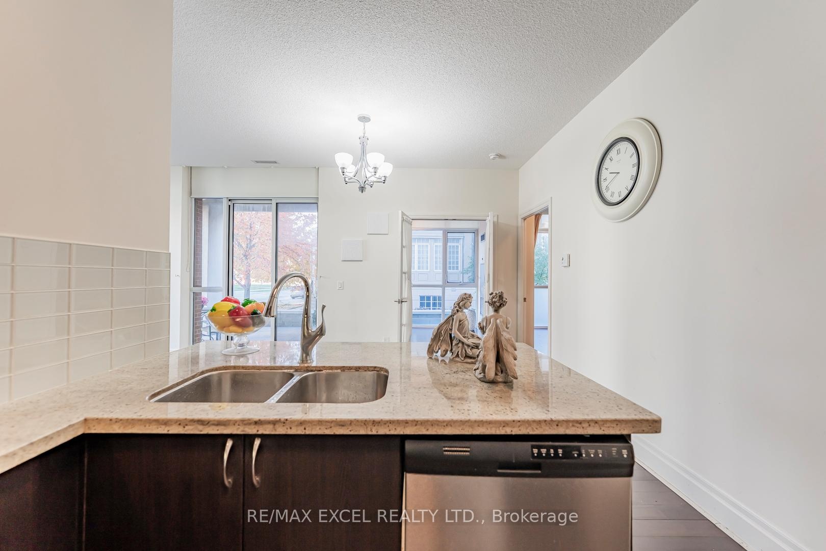 Bright & Spacious 1050 S.F. Corner Unit At Rouge Bijou By Remington. 2 Bed + Den (W/Window & French Doors Can Be 3rd Bdrm) High 10' Ceilings & Hardwood Flooring Throughout. Extended Kitchen Cabinets W/Quartz Countertop, Backsplash & Valance Lighting. Marble Vanity Top In All Baths. Primary Bdrm W/4Pcs En-Suite & W/I Closet. Large 280 S.F Covered Patio. Amenities: Concierge, Gym, Guest Suites, Party Room, Virtual Golf & More! **Markville Secondary School (2/739)**. S/S Appl (Fridge, Stove, Dishwasher, Range Hood). Washer & Dryer. All Existing Window Coverings. 1 Parking Spot & 1 Locker Included. Steps To Viva Bus Station, Downtown Markham Shopping & Restaurants. Close To Go Train, Hwy 404 & 407.