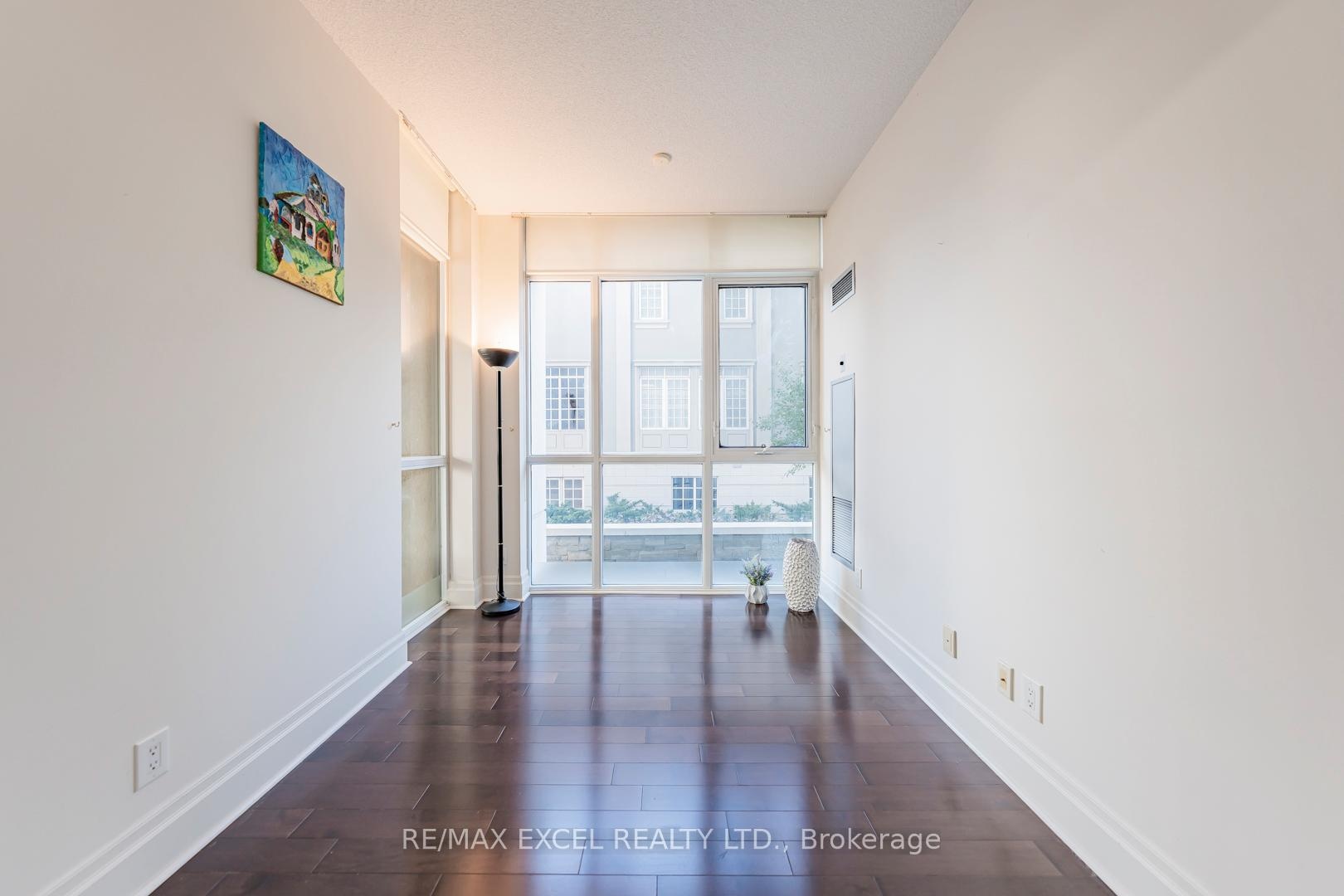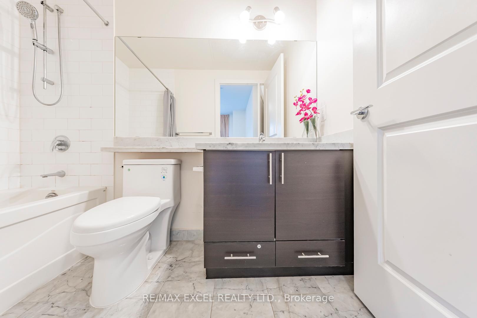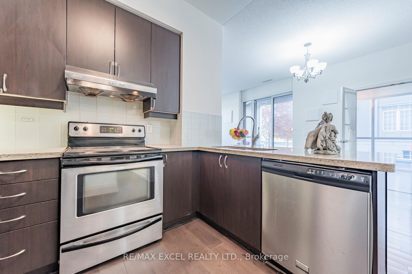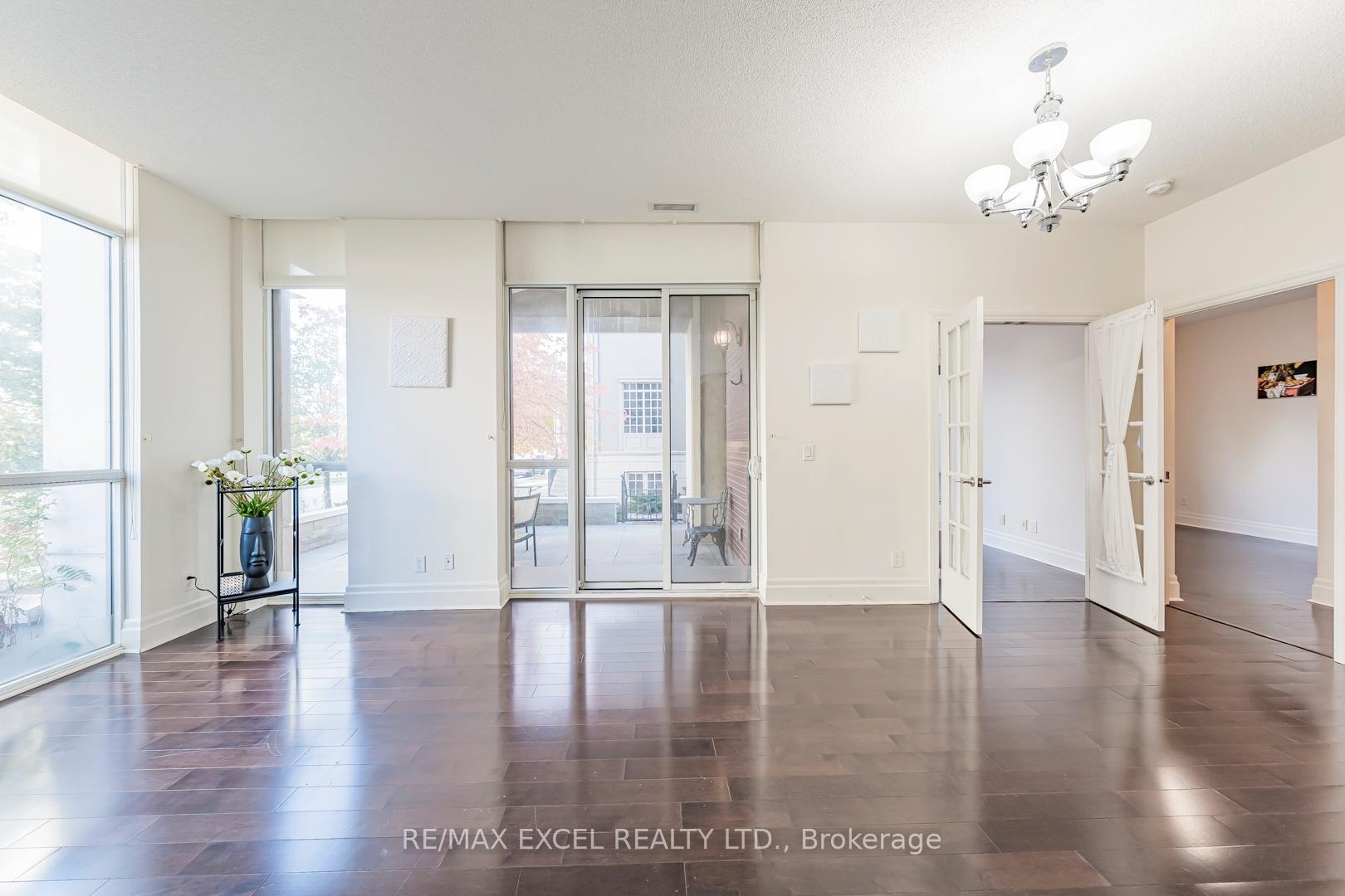 Bright & Spacious 1050 S.F. Corner Unit At Rouge Bijou By Remington. 2 Bed + Den (W/Window & French Doors Can Be 3rd Bdrm) High 10' Ceilings & Hardwood Flooring Throughout. Extended Kitchen Cabinets W/Quartz Countertop, Backsplash & Valance Lighting. Marble Vanity Top In All Baths. Primary Bdrm W/4Pcs En-Suite & W/I Closet. Large 280 S.F Covered Patio. Amenities: Concierge, Gym, Guest Suites, Party Room, Virtual Golf & More! **Markville Secondary School (2/739)**. S/S Appl (Fridge, Stove, Dishwasher, Range Hood). Washer & Dryer. All Existing Window Coverings. 1 Parking Spot & 1 Locker Included. Steps To Viva Bus Station, Downtown Markham Shopping & Restaurants. Close To Go Train, Hwy 404 & 407.