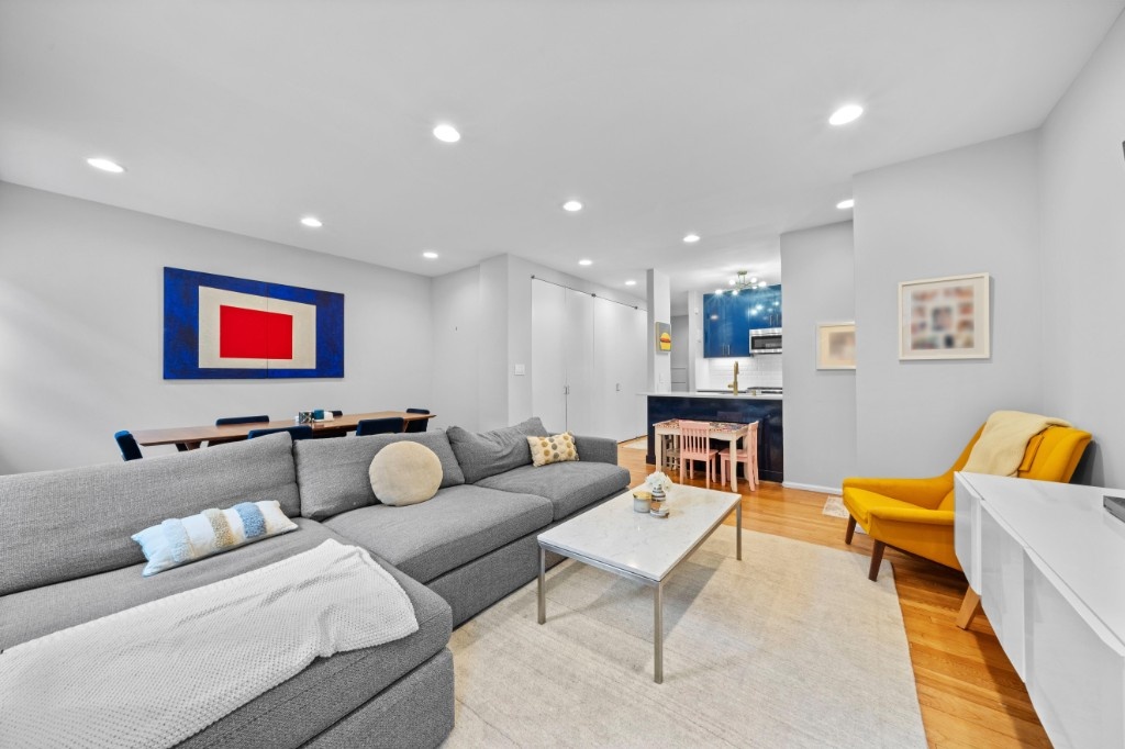 The main living and dining space is open and comfortable, framed by three oversized windows that bring in natural light throughout the day. The kitchen features Bosch appliances and opens into the dining and living areas with a wide counter perfect for meals, conversation, or work. Cabinet space is generous, and the layout is clean and efficient. Hardwood floors, high ceilings, and built-ins throughout the apartment give the home warmth and function without wasting space.