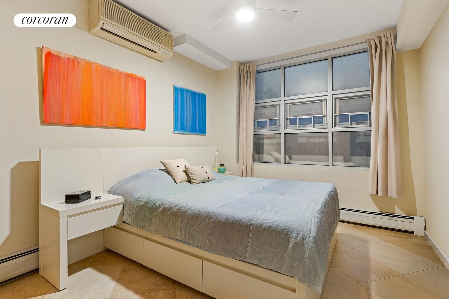 Apartment 102 has its mechanicals self-contained like a private townhome with its own boiler and hot water heater. The split system air conditioning throughout keeps the view to outside unobstructed.