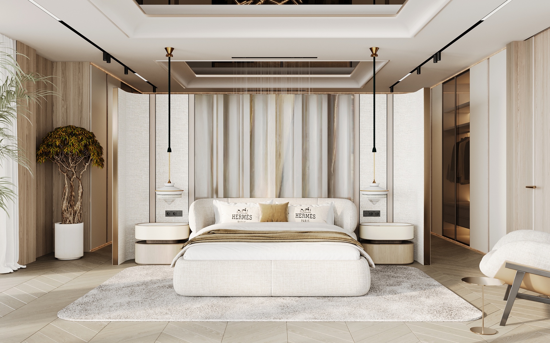 Marquetry floors, hand-stitched leather paneling, and bespoke furnishings evoke the Hermès signature of understated opulence. The master suite, described as “a sanctuary of craftsmanship and artistry,” exemplifies the maison’s ethos, discreet luxury that whispers rather than shouts.