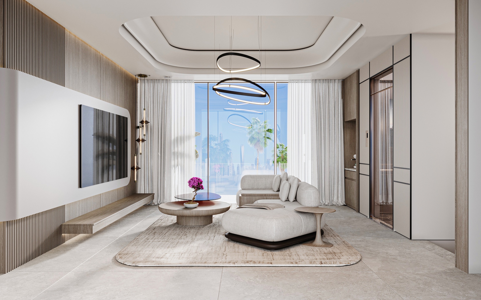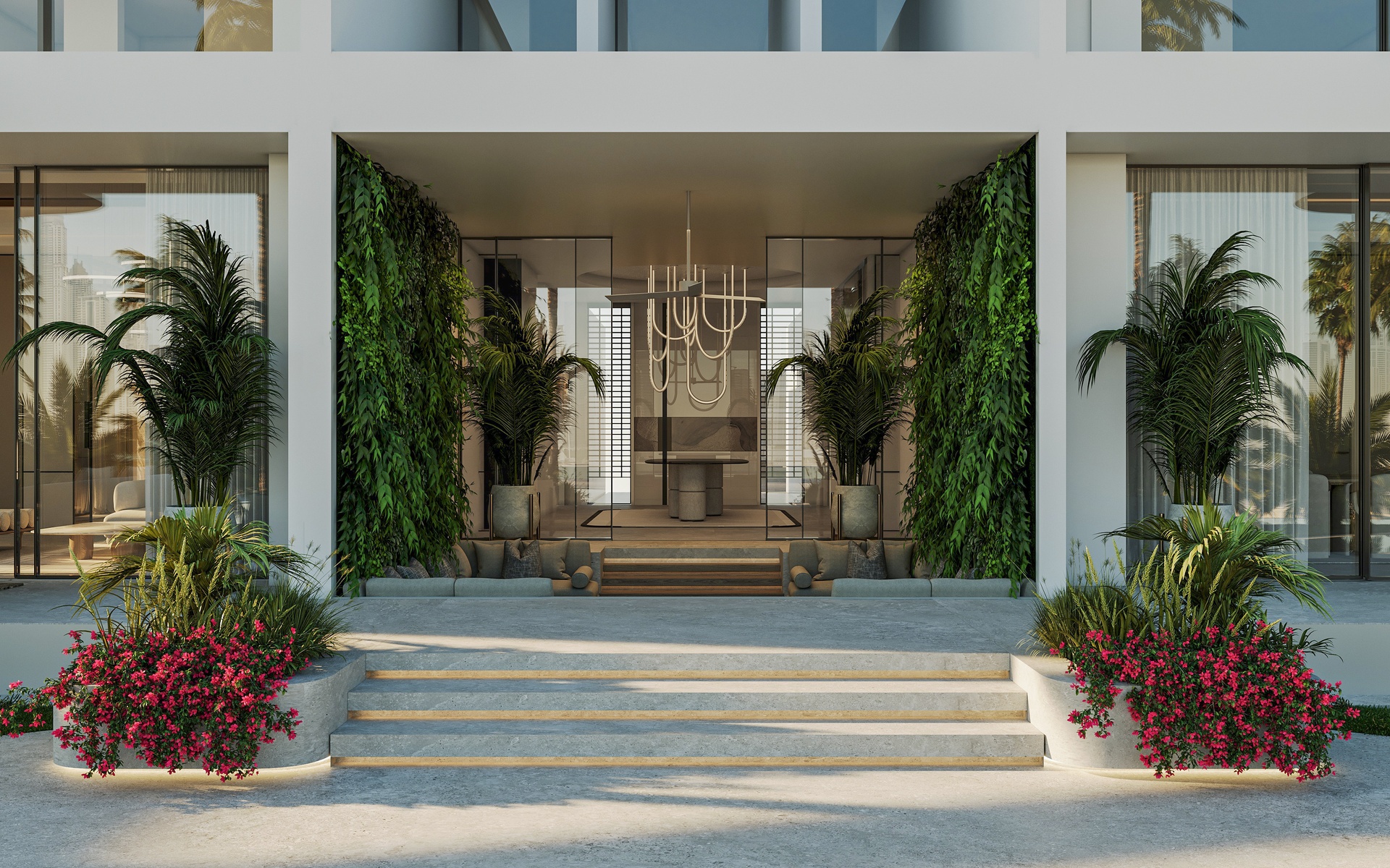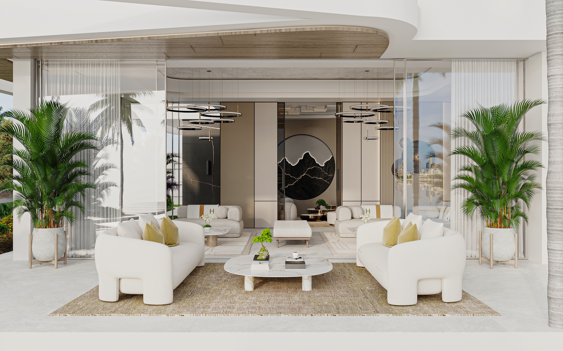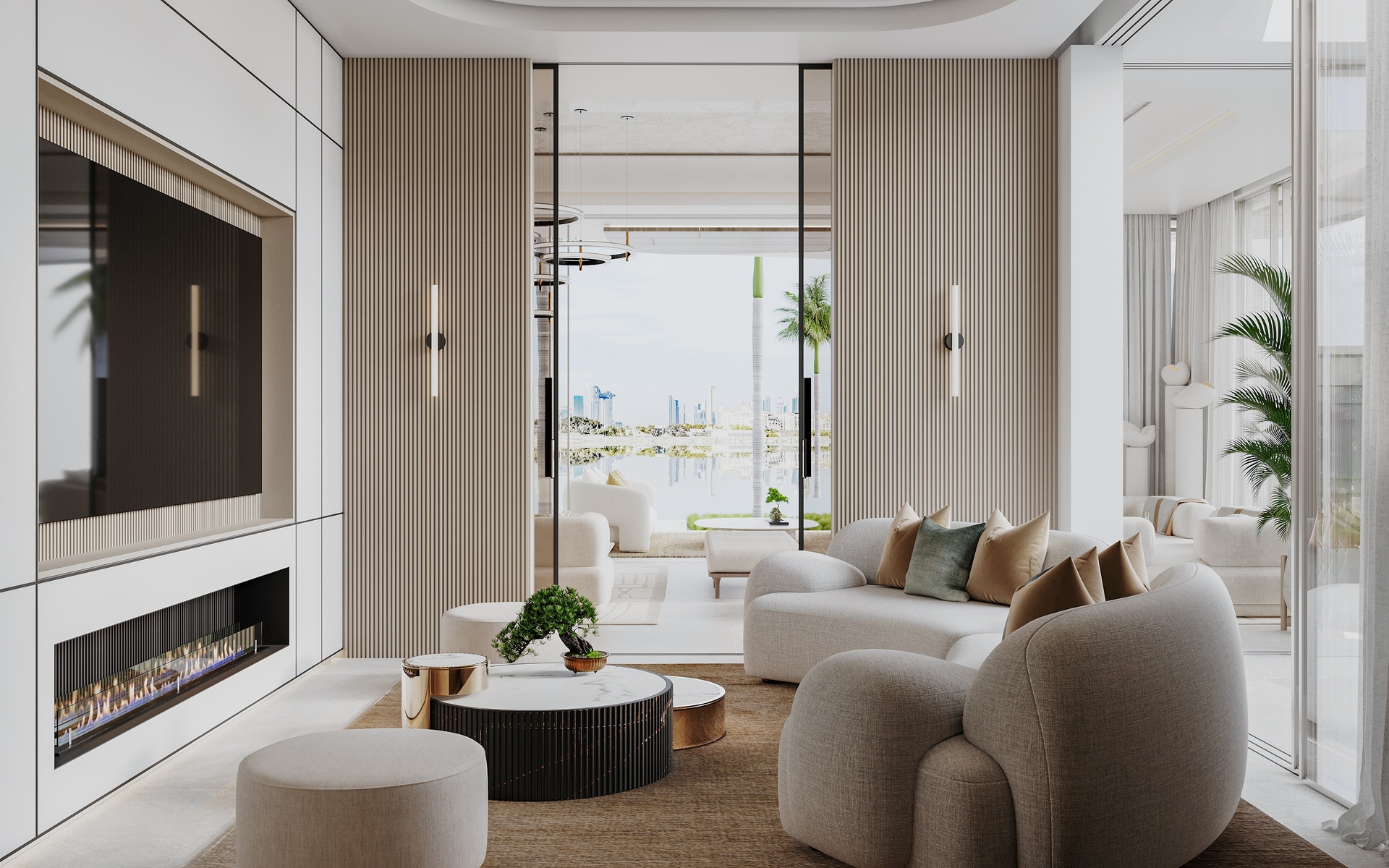 Stepping through the grand double-height entrance, a world of refined tranquility unfolds. Light floods through floor-to-ceiling glass, framing sweeping vistas of the Arabian Gulf and Dubai’s skyline beyond.