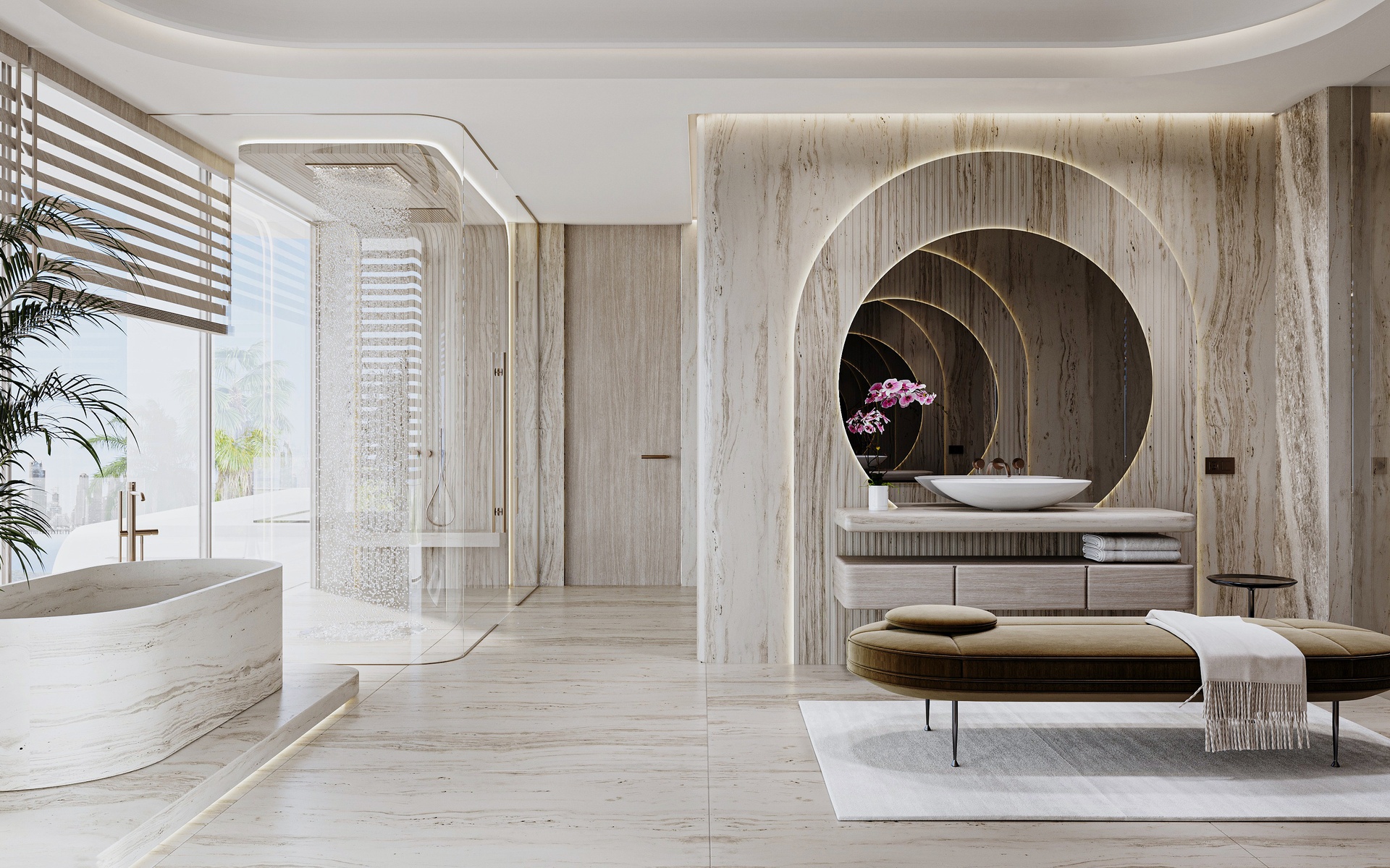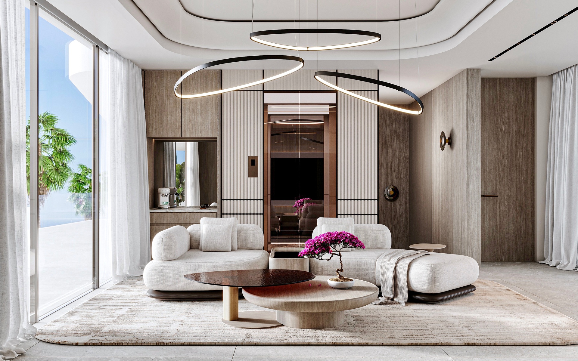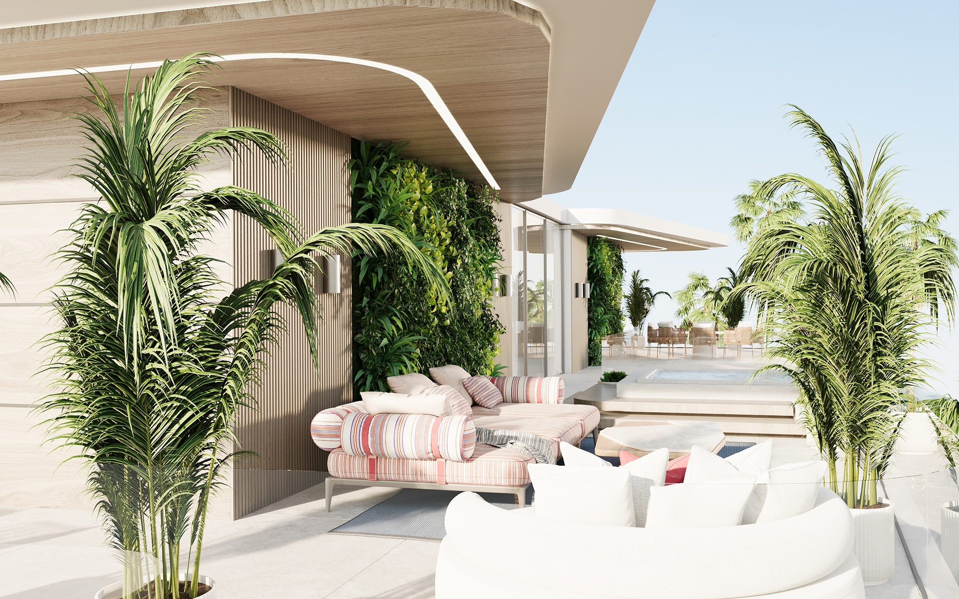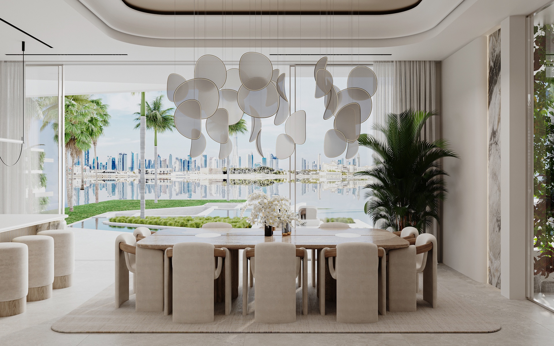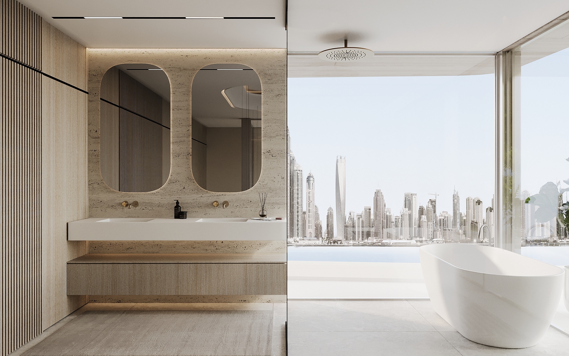Stepping through the grand double-height entrance, a world of refined tranquility unfolds. Light floods through floor-to-ceiling glass, framing sweeping vistas of the Arabian Gulf and Dubai’s skyline beyond.