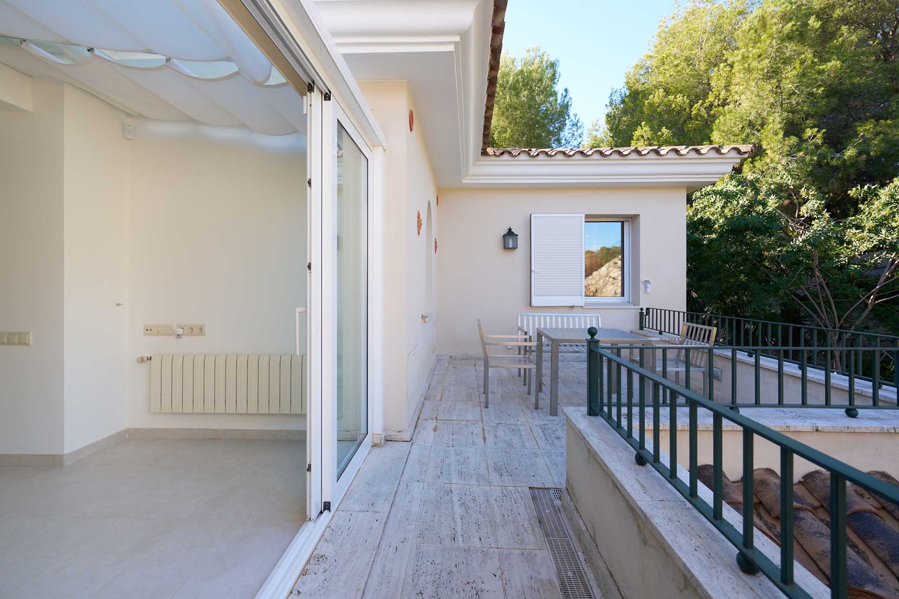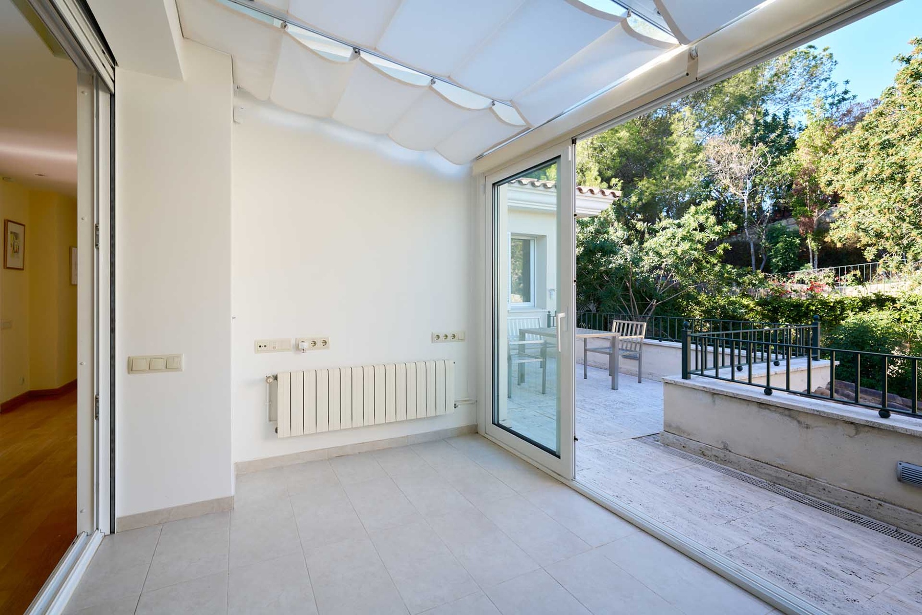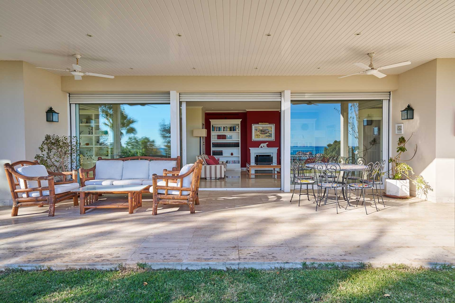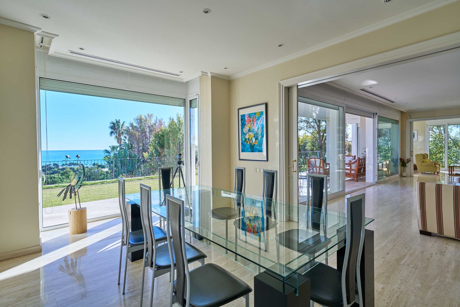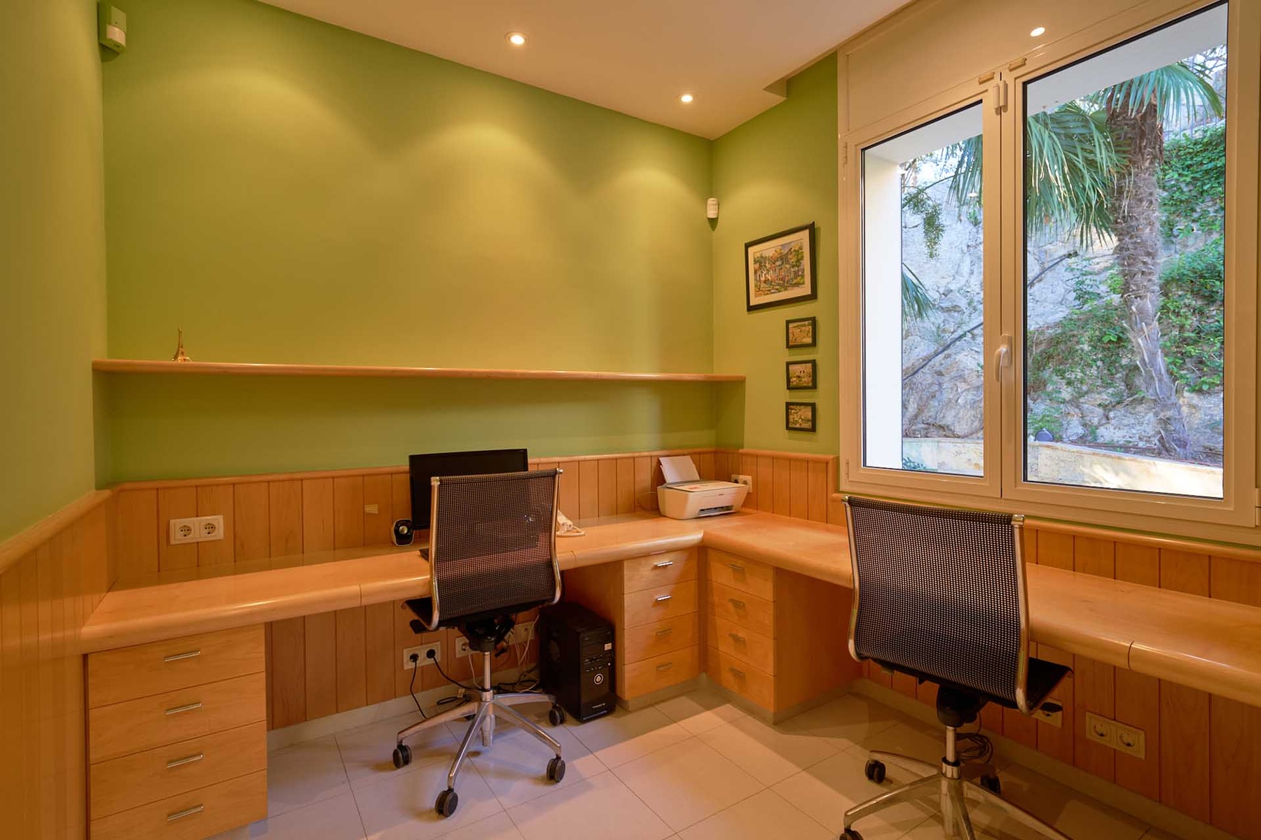 The main floor, with pedestrian access from the outside or by means of an imposing staircase and elevator from the parking lot, reveals a careful distribution. A fully equipped kitchen with a separate service entrance, an office with own bathroom, living room, dining room and a library, all of them with access to the covered terrace with panoramic sea-views.