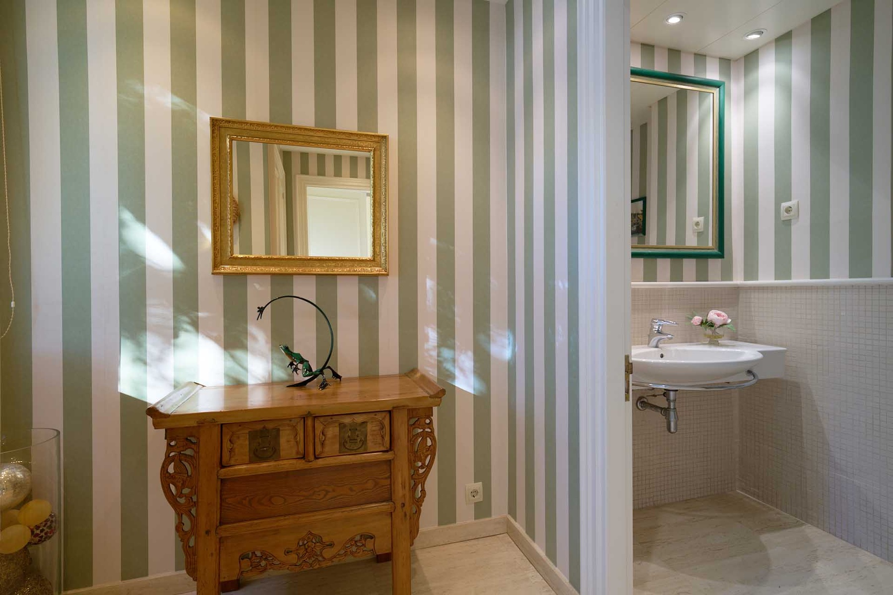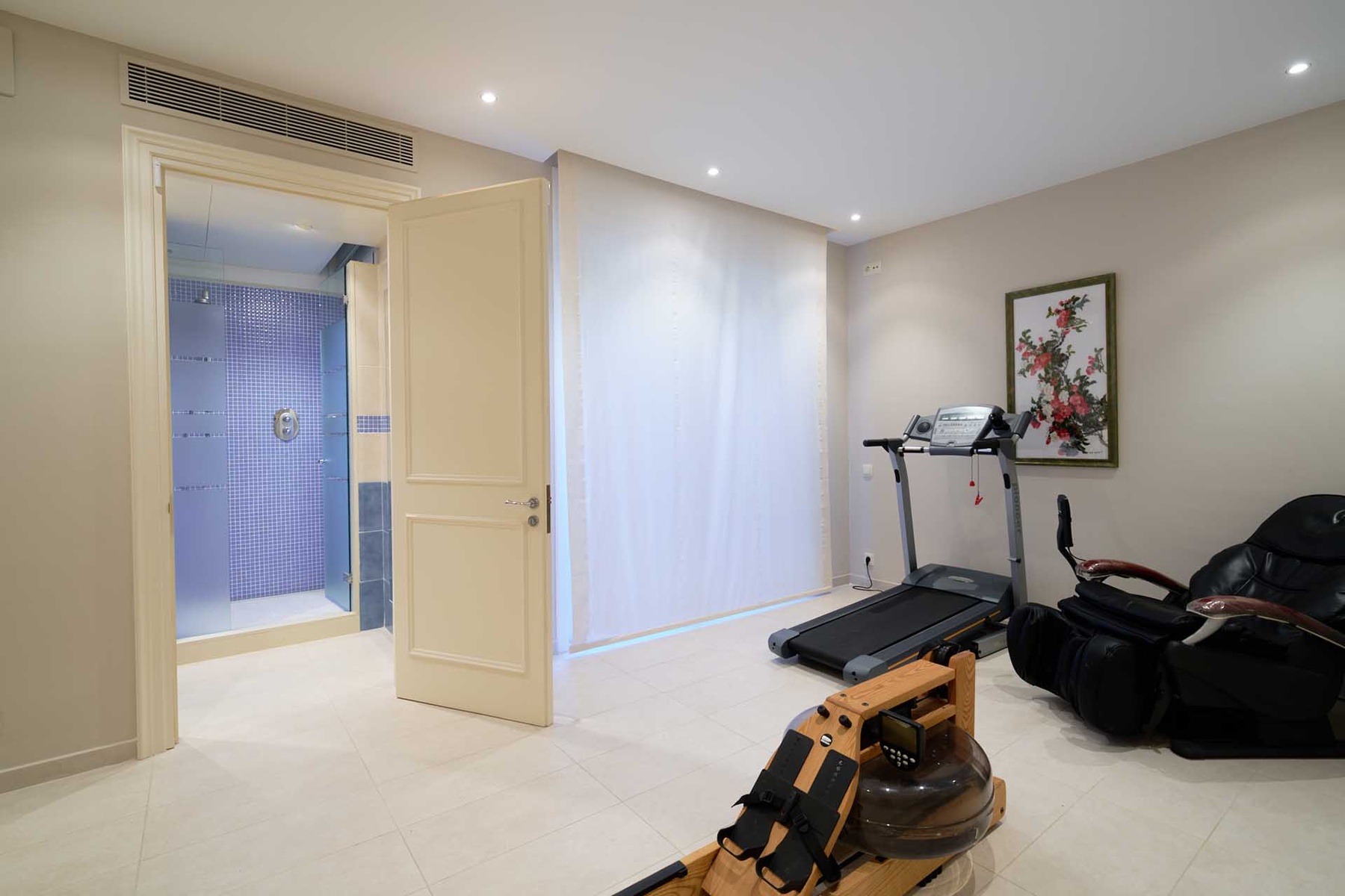 The ground floor not only houses the spacious garage with capacity for eight cars and several motorcycles, a fifth double bedroom with en-suite bathroom, practical spaces such as a gym, sauna, dressing room, wine cellar and archive but also the central control of the underfloor heating installations, air conditioning and irrigation of the property.