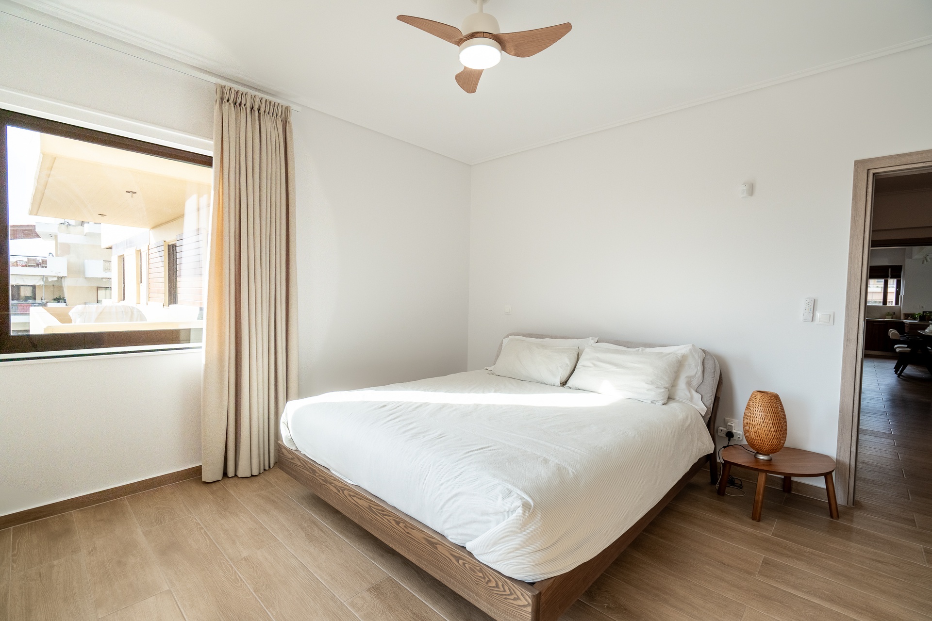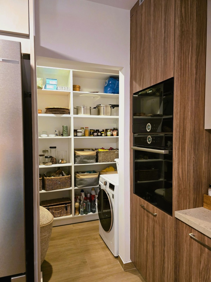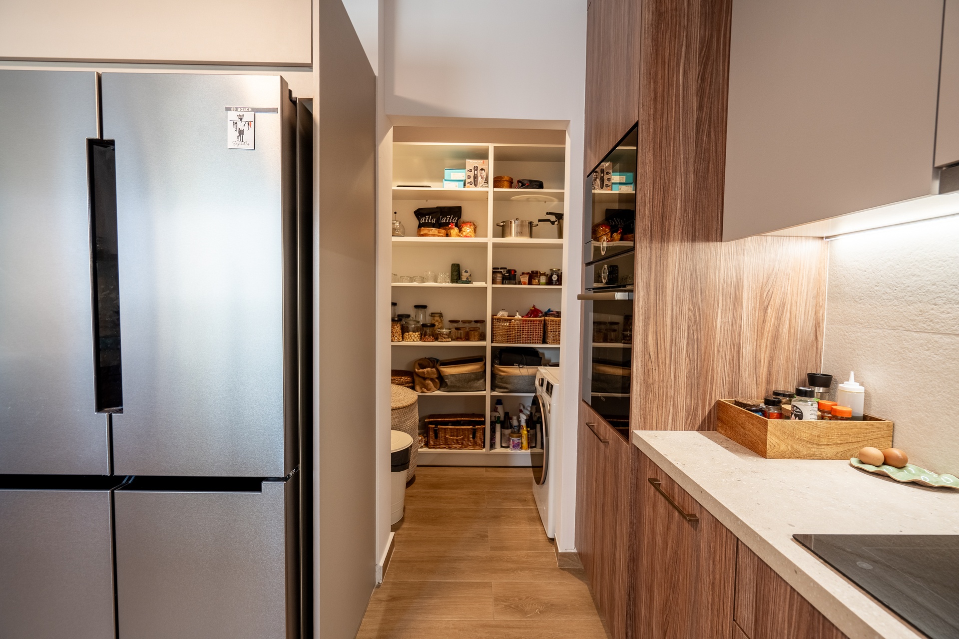 The apartment features three spacious bedrooms with bespoke built-in storage, two beautifully appointed bathrooms with high-quality finishes, and an open-plan kitchen, dining, and living area intelligently designed to maximise space and natural light. The custom kitchen includes premium Bosch integrated appliances and a separate walk-in pantry for additional storage. Italian tile flooring runs throughout, complemented by air conditioning, ceiling fans, and autonomous natural gas heating.