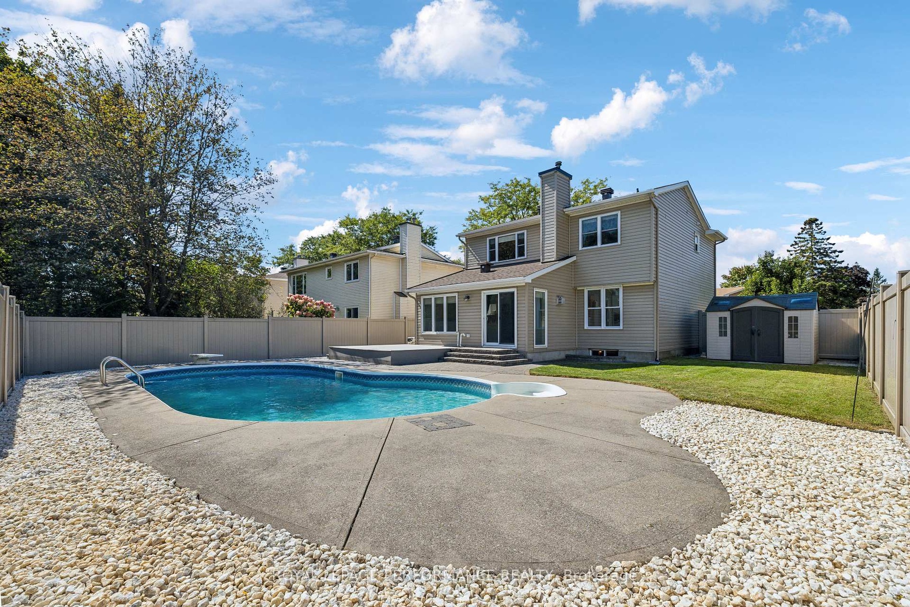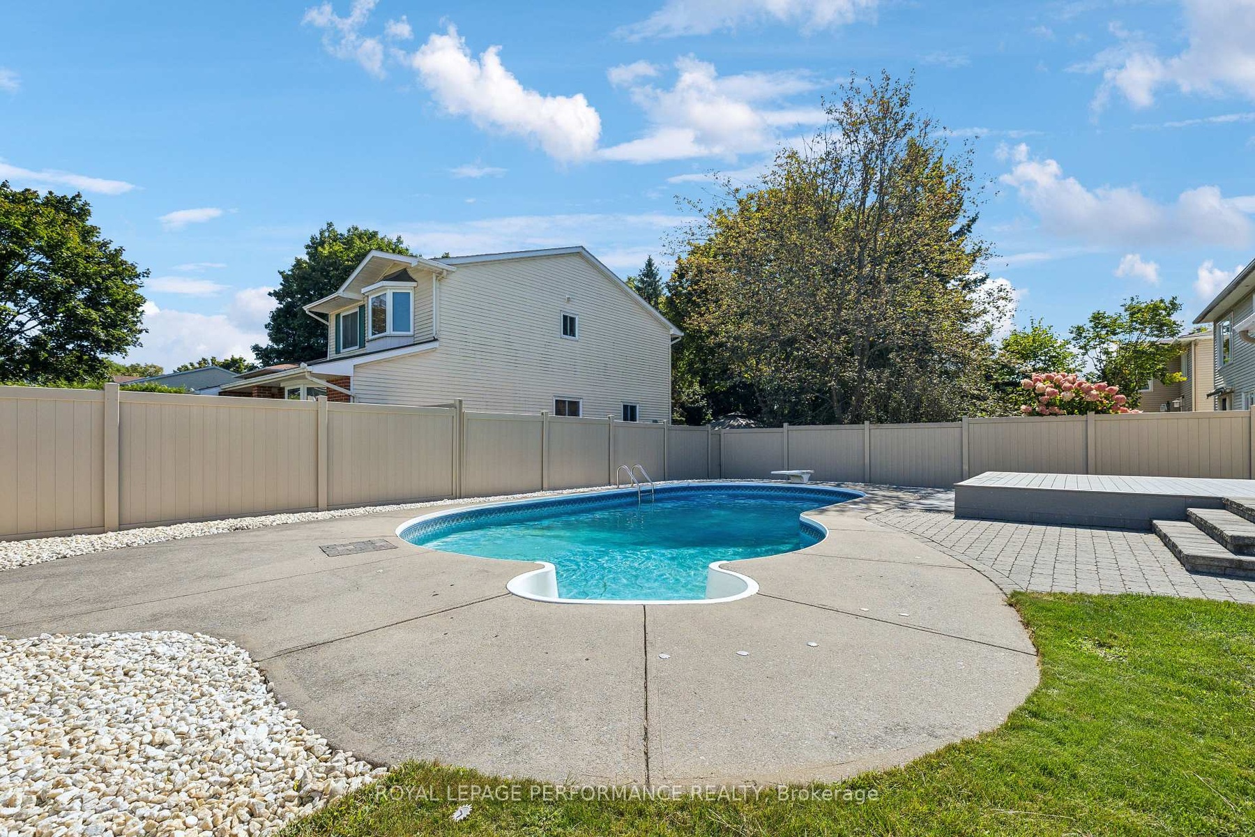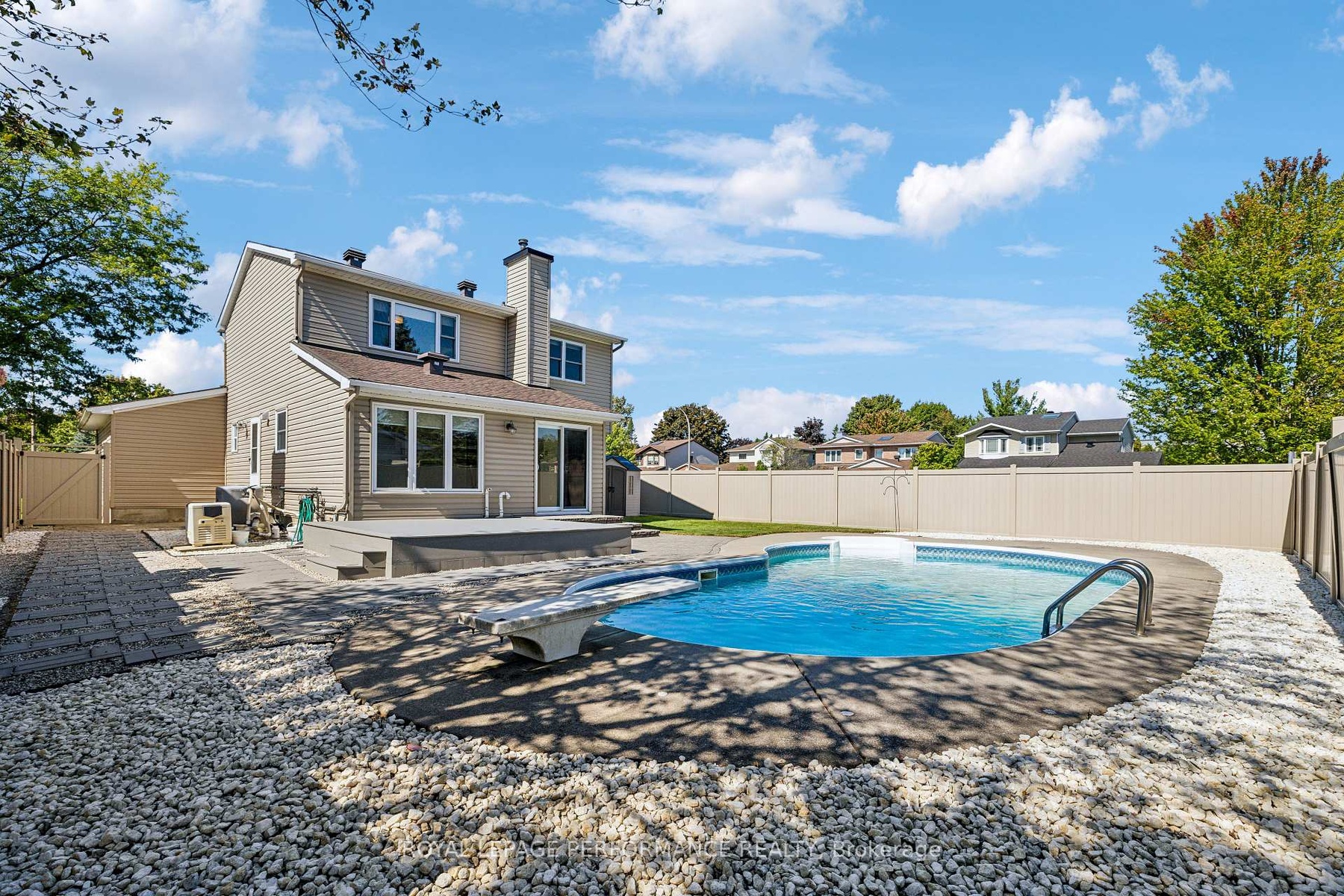 This beautifully maintained corner-lot home in Chapel Hill offers incredible curb appeal, modern upgrades, & a private backyard oasis with an in-ground pool. The bright foyer leads to a spacious living & dining area with resurfaced hardwood floors & oversized windows. The fully renovated kitchen features granite countertops, stainless steel appliances, & a tumbled marble backsplash. A sunken family room boasts vaulted ceilings, a gas fireplace, & stunning backyard views. The primary suite offers ample closet space & an updated ensuite, while two additional bedrooms include new hardwood floors & a stylish 4-piece bath. The finished basement features a large rec room with an electric fireplace, a fourth bedroom, & a powder room. Outside, enjoy a composite deck, a professionally landscaped backyard with white river stone surrounding the pool, & a new stone pathway. Recent upgrades since 2022 include attic insulation, a full kitchen renovation, new hardwood in two bedrooms, a modern staircase, & an insulated garage. The backyard was redesigned with white river stone to reduce grass near the pool. Additional renovations since 2009 include interlock landscaping, a repaved driveway, PVC fencing, & pool updates such as a new pump (2024), liner (2011), filter, & safety cover. The roof was replaced in 2018, along with new siding, front & side doors. Main, ensuite, & powder room bathrooms were updated, & bay, family room, & basement windows were replaced. The furnace, air conditioner, gas fireplace, & electric fireplace were also upgraded. Popcorn ceilings were removed on the main floor, & the basement was recently renovated. Located in the desirable Chapel Hill community, this home is near top-rated schools like Forest Valley Elementary & Chapel Hill Catholic School. Enjoy nearby parks, trails, & Racette Park, with easy access to transit, shopping, & Highway 174. Dont miss this dream home book your showing today!