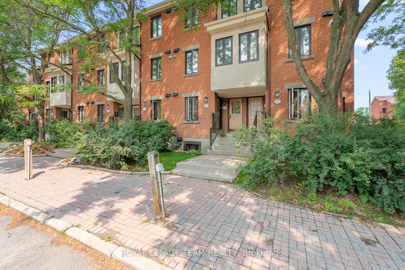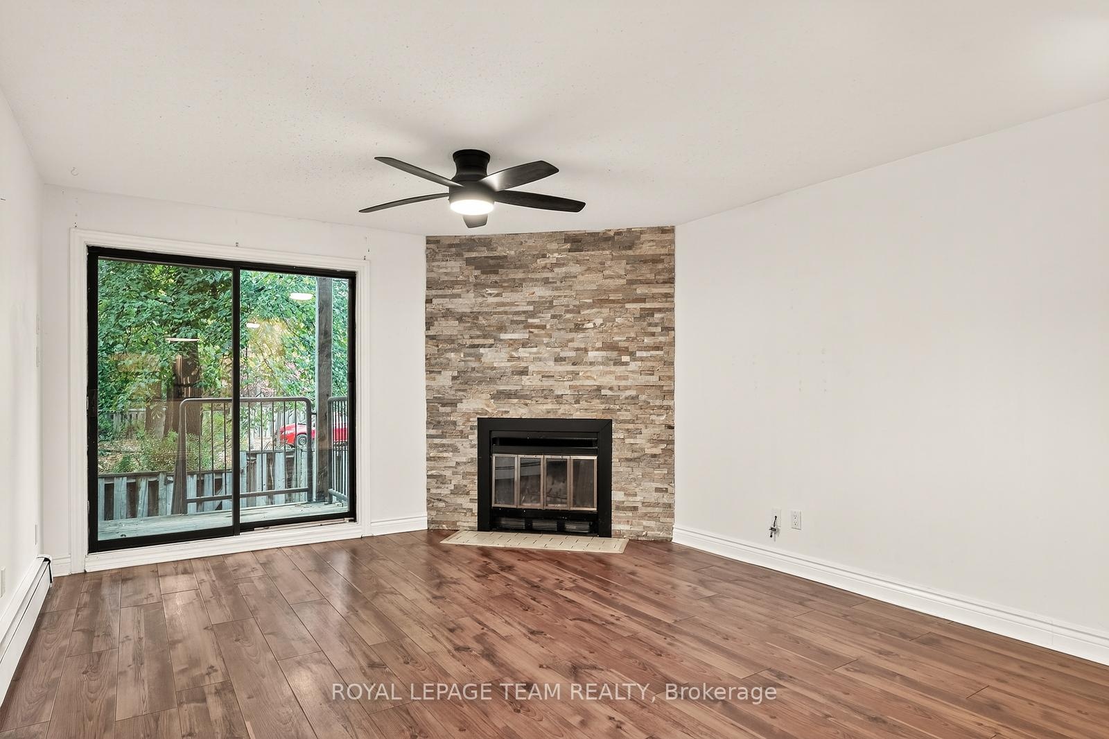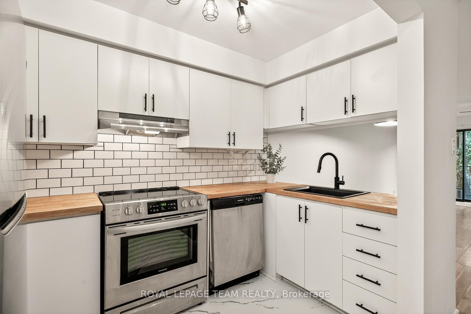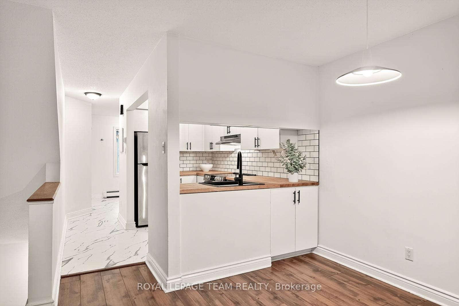 Welcome to this beautifully updated 2-bedroom stacked townhome in the sought-after neighbourhood of Manor Park. Step into a welcoming front foyer complete with a convenient powder room and a recently renovated kitchen featuring butcher block countertops, classic white subway tile backsplash, chic black hardware, and newer stainless steel appliances. The kitchen's open sight-lines overlook an airy living and dining area, enhanced by a cozy wood-burning fireplace and glass sliding doors that lead to a private back deck and fenced in garden. Downstairs, discover two spacious bedrooms with deep windows that offer both natural light and a serene space to retreat to. An updated 4-piece bathroom with modern fixtures and finishes tie seamlessly into the home's aesthetic. This level also includes a dedicated laundry room and ample storage space. Enjoy the convenience of an outdoor parking spot, and a charming parkette just steps away, perfect for walking the dog or enjoying a bit of green space close by. This home is a perfect blend of comfort, style, and location; a true gem with low condo fee's, ideal for first-time buyers, down-sizers, or investors alike. Proximity to gorgeous nature trails, the Ottawa River, shopping, schools and the 417.