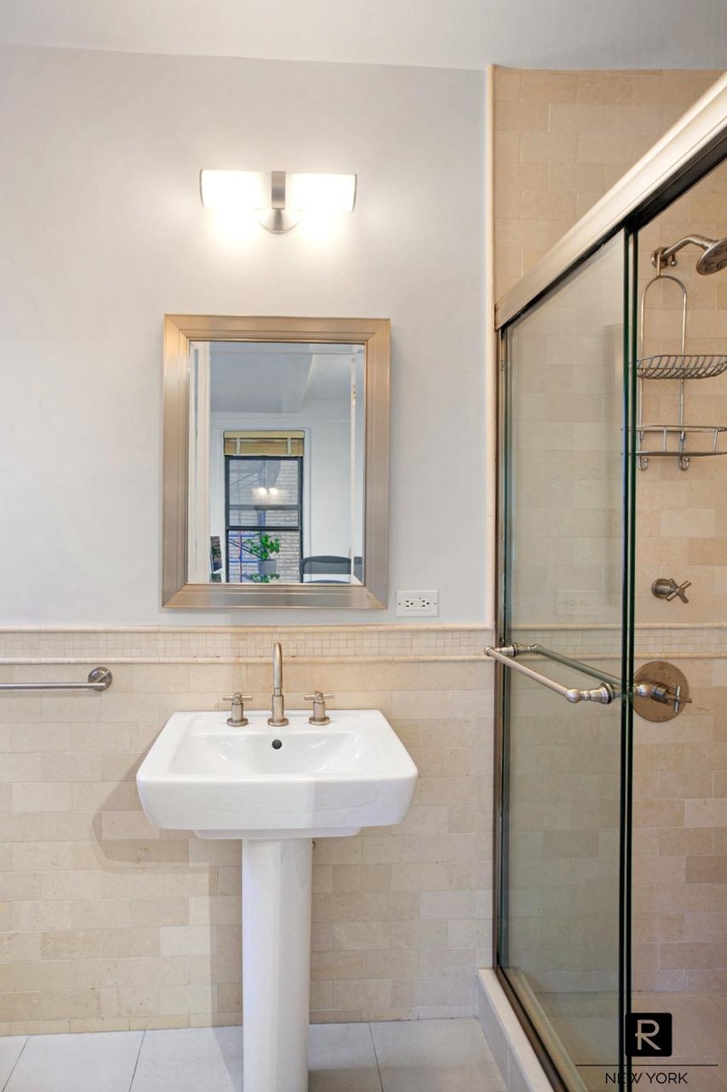 The serene primary suite features a custom walk-in closet, built-in casework, and a spa-like limestone bath with a glass-enclosed shower and heated towel racks. The second bedroom, framed by French doors, boasts two exposures and abundant natural southern and eastern light, while the second renovated bath offers stylish finishes with glass and limestone tiling. Throughout the apartment, you’ll find prewar details including beamed ceilings, oak strip flooring, and picture moldings, complemented by rare THRU-THE-WALL AIR CONDITIONING in both bedrooms and the living room.