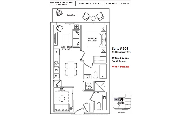 Brand New Untitled condo with a PARKING! Be the first to live in this beautifully designed 1 Bedroom + Den, 2 Bath suite featuring a smart and functional layout with carpet free hardwood floors plus a balcony. Enjoy sunset west-facing views from your private balcony. The sleek modern all new kitchen offers integrated appliances, quartz countertops, and custom cabinetry. The bedroom with the real window includes a 4-piece ensuite and a mirror closet. Spacious den with door - perfect for a home office, nursery, or 2nd bedroom. Ensuite laundry, 11' high ceilings, and floor-to-ceiling windows enhance the modern, open-concept design. Two bathrooms for ultimate convenience. All Window Coverings were ordered and to be installed soon. Luxury living with state-of-the-art amenities including Indoor/Outdoor pool, Co-Work Space, Spa, Gym, Yoga studio, Rooftop lounge, BBQ terrace, Visitor parking and more (Many amenities are currently under construction). Steps to Yonge & Eglinton, TTC subway, future LRT, Restaurants, Trendy shops, and Entertainment. Don't miss this RARE offering with a PARKING. Perfect for professionals or couples seeking style and comfort in Midtown Toronto! Move-in Anytime!