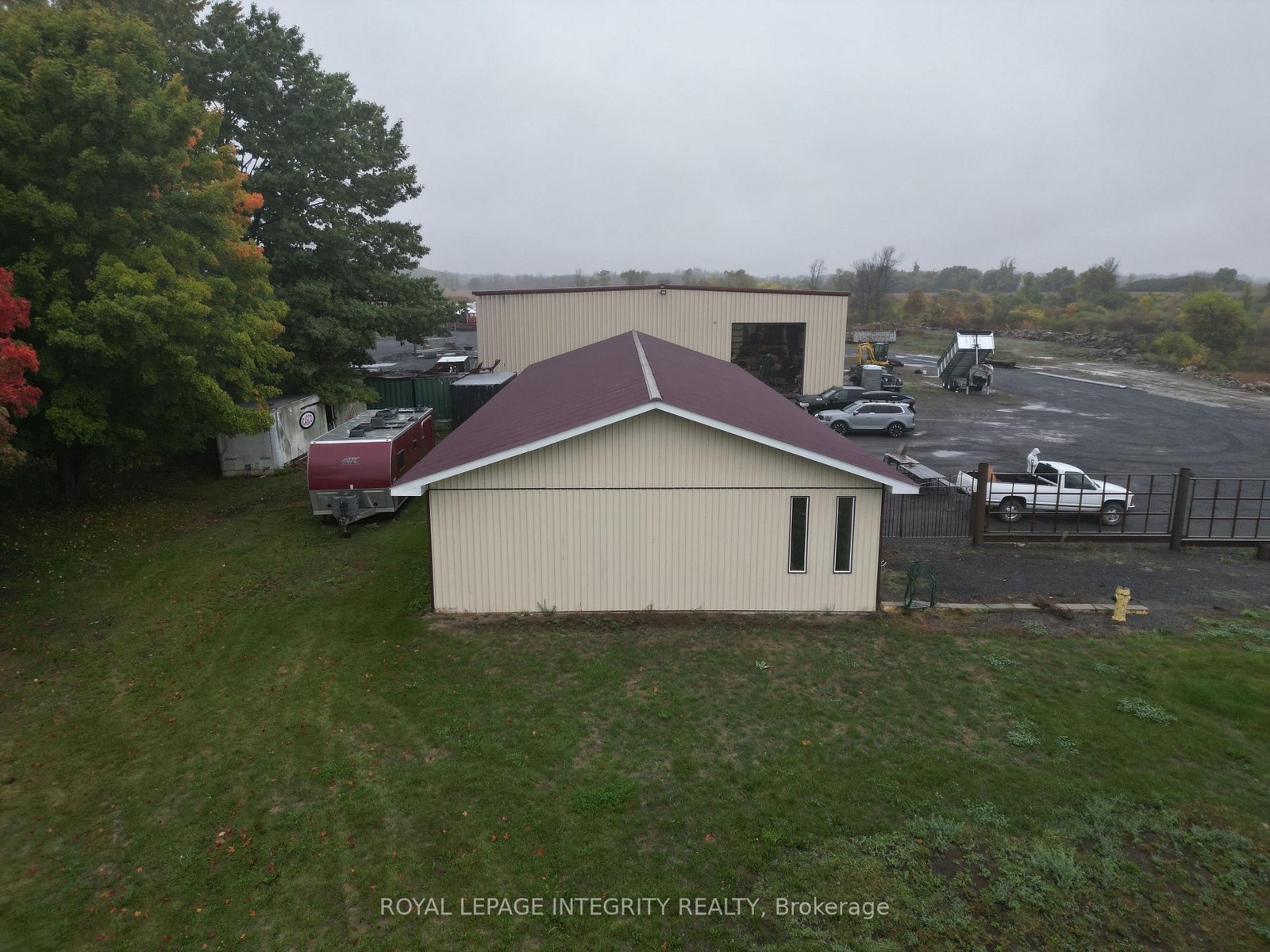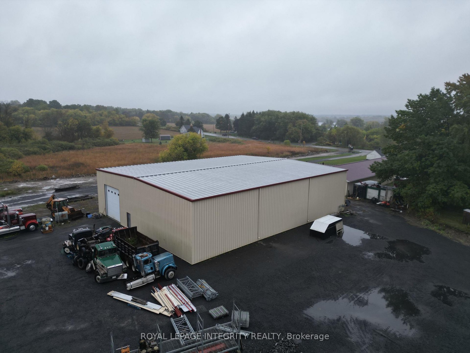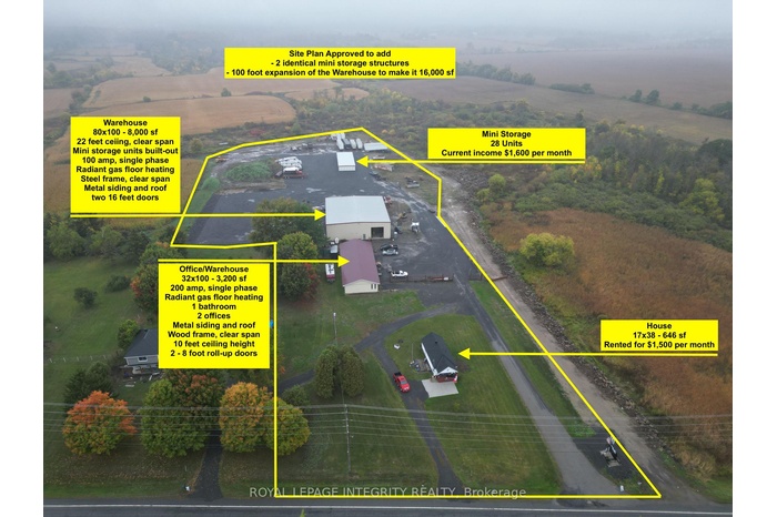Located in the municipality of Cardinal, Ontario, just minutes from Highway 401 and the U.S. border crossing along the St. Lawrence River, this property offers an exceptional mix of industrial, commercial, and income-generating opportunities. The site features a new 8,000 sq. ft. steel-frame, clear-span warehouse with a 22-ft. ceiling height, metal siding, and a metal roof. The warehouse is equipped with in-floor gas radiant heating built into the concrete slab and 100-amp single-phase electrical service. It includes two 16-ft. roll-up doors and two man doors for easy access. The building is site-plan approved for a 100-ft. expansion, allowing for a total of 16,000 sq. ft. if desired. A second 3,200 sq. ft. office-warehouse building offers clear-span interior space, steel siding and roof, and 200-amp single-phase service. It includes two 8-ft. roll-up doors and a front man-door entrance, making it ideal for operations or tenant use. At the rear of the property, a 28-unit mini-storage facility generates approximately $1,600 per month in rental income. The site is approved for two additional mini-storage buildings, offering strong expansion potential. At the front of the property, a residential bungalow currently leased for $1,500 per month provides additional income and could easily be converted into an office. Originally envisioned as a mini-storage rental facility, the site is zoned and suitable for a wide range of light industrial uses, including logistics, warehousing, outdoor storage, transportation, light manufacturing, and service or repair operations. Strategically positioned between Kingston, Montreal, and Ottawa, with direct access to Highway 401 and proximity to the U.S. border, this property offers outstanding accessibility and development potential for investors or owner-operators alike.