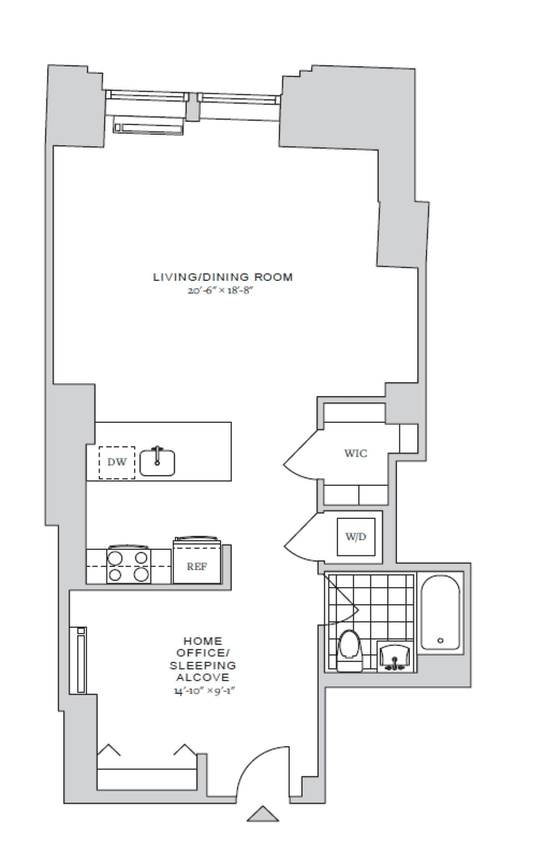 Spacious alcove studio with large flex space perfect for a home office or sleeping alcove, a walk-in closet, open kitchen with stainless steel appliances, stone counters and eating bar, and washer/dryer.