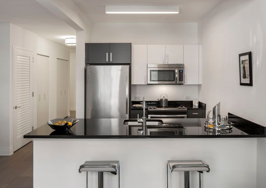 Alcove studio with bonus foyer space perfect for a home office or sleeping area, open kitchen with stainless steel appliances and stone counters, in-unit washer/dryer, multiple closets, and wood floors.