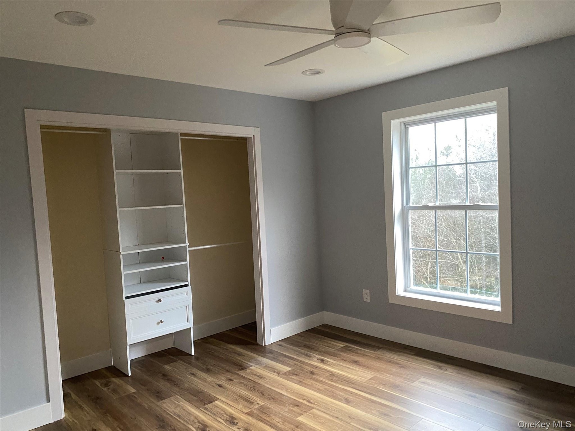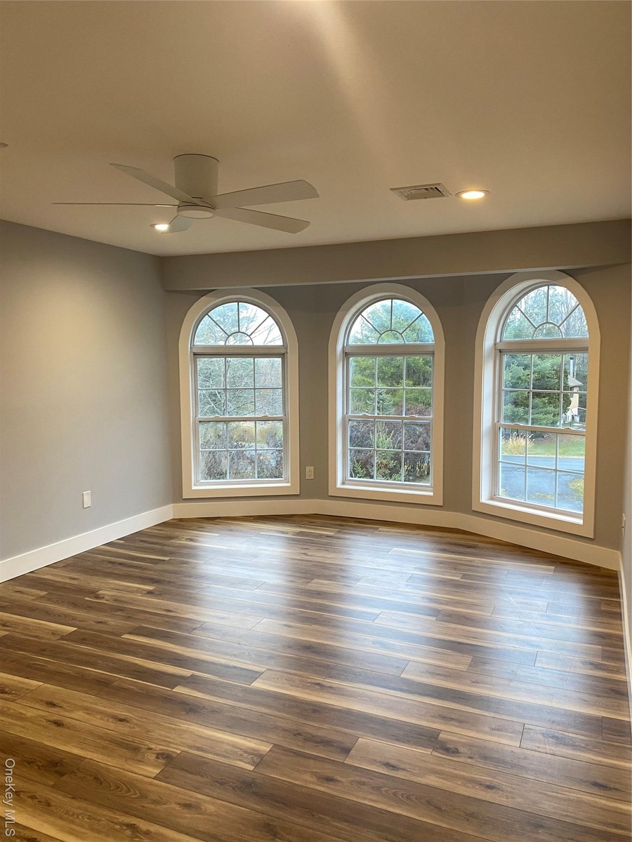 - Spare room with dark wood-type flooring and ceiling fan