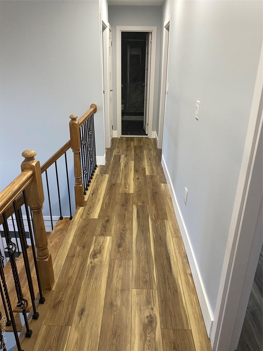 - Corridor with dark wood-style floors and an upstairs landing