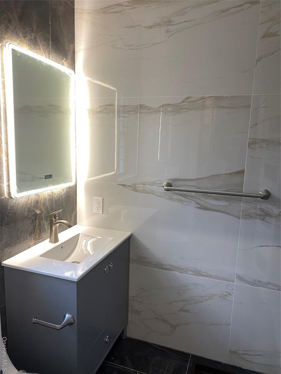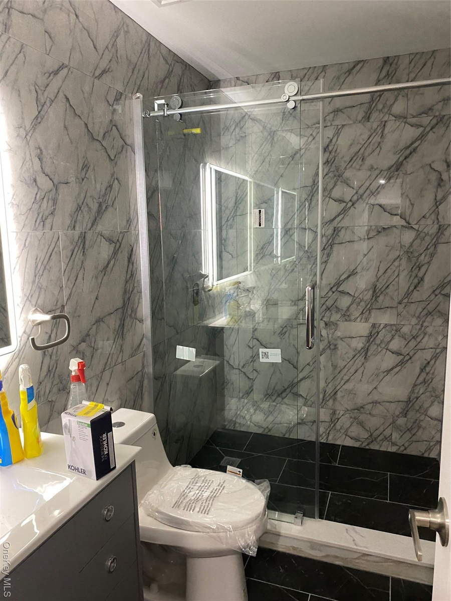 - Bathroom with tile walls, vanity, and a marble finish shower