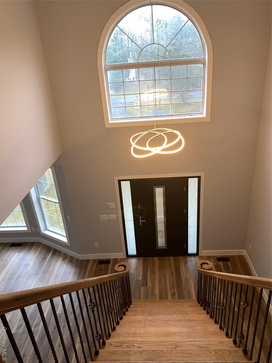 - Entryway with wood finished floors and a high ceiling