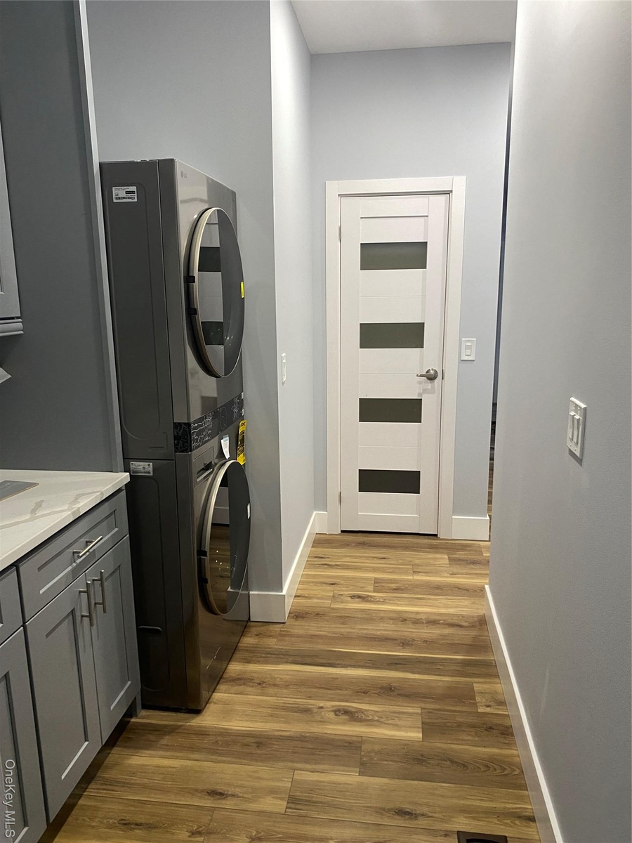 - Washroom with dark wood-style flooring, stacked washer and clothes dryer, and cabinet space