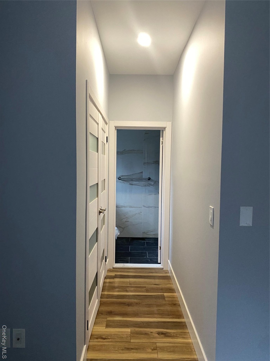 - Corridor featuring dark wood-style flooring and baseboards