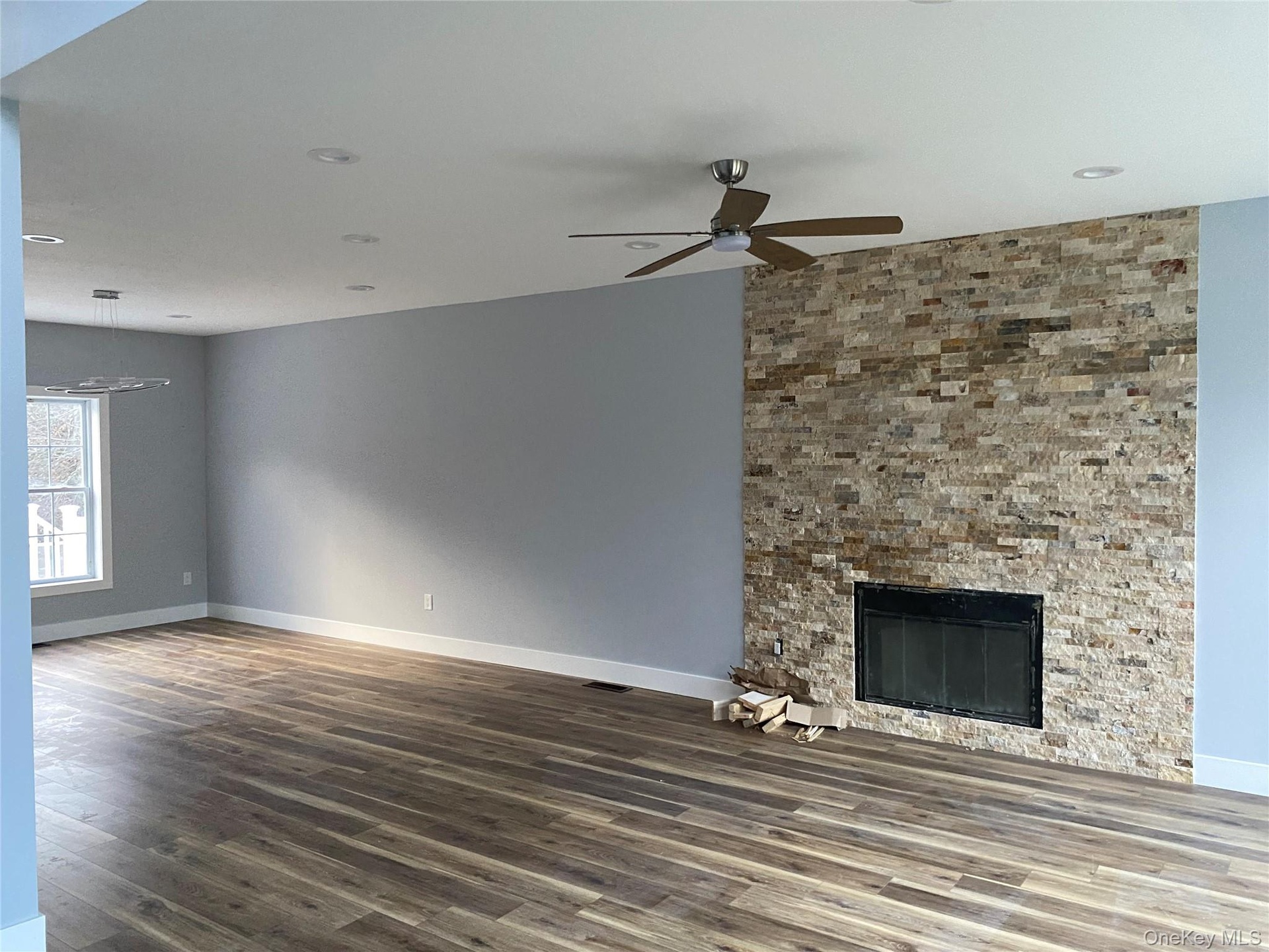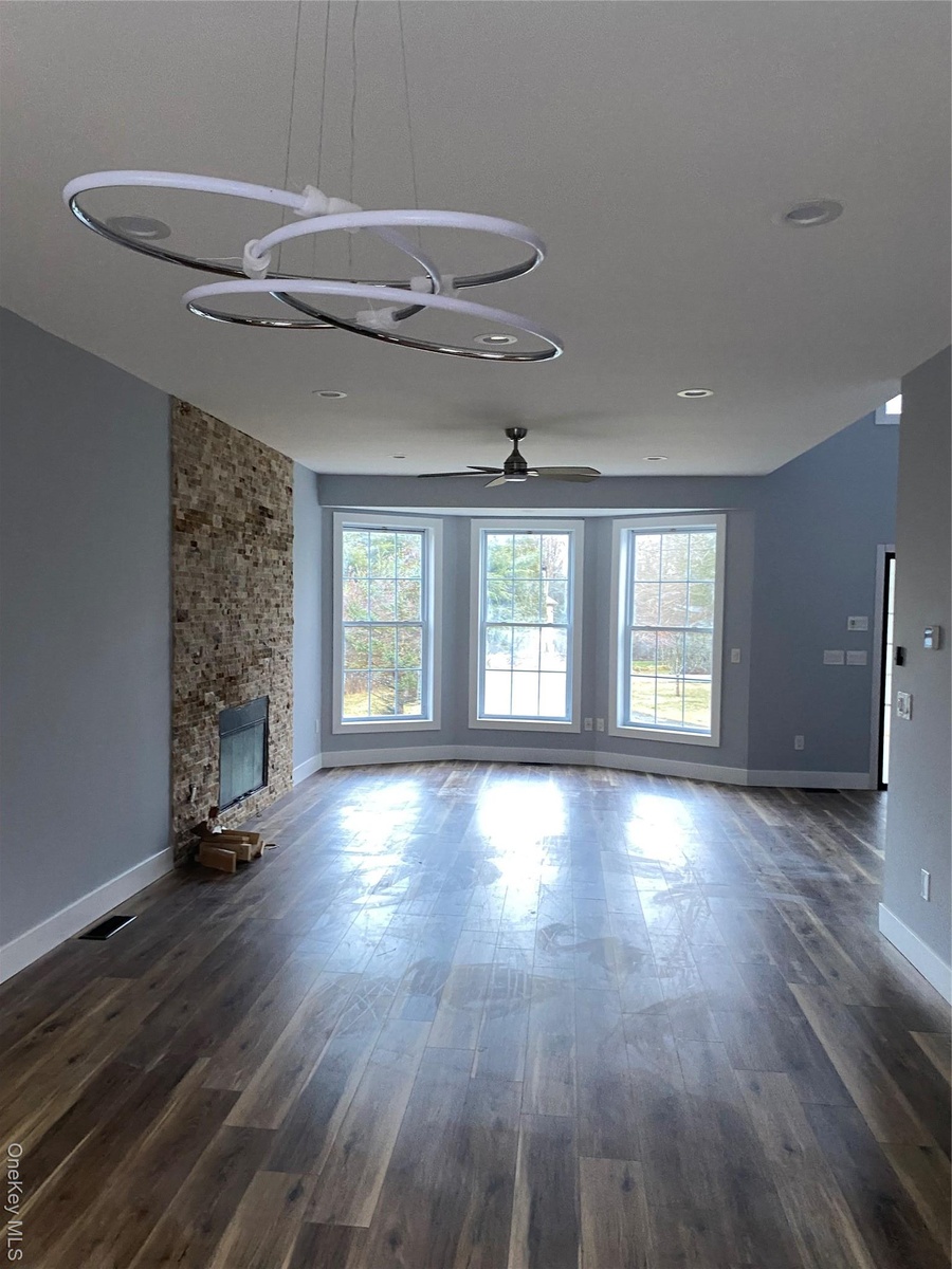 - Unfurnished living room featuring dark wood-style flooring, ceiling fan, a stone fireplace, and a chandelier