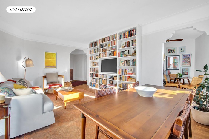 Upon entering, a proper entry foyer with two closets off the adjacent hall offers a lovely spot to greet your guests and drop your things, with space enough for a tidy home office or reading nook as well! The spacious and sun drenched living room offers plenty of room for lounging and relaxing, as well as dining for up to 8, while custom built in bookcases create focal point for the room and even include a spot for your TV. The adjacent kitchen is accessible from both the living/dining room and the hall providing an open flow to the floorplan while still concealing the kitchen mess from the rest of the home. The charming windowed kitchen is galley in style, yet widens as it goes, creating a more open feel; eventually leading to a lovely seating area for when things feel a bit more casual. A black and white checkerboard floor, and a white subway tile backsplash give it a classic feel, while ample cabinet and counterspace ensure you have a place for everything.
