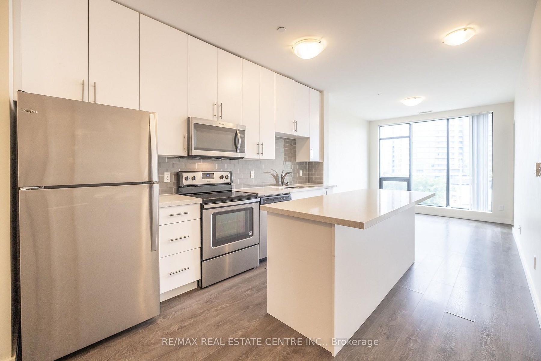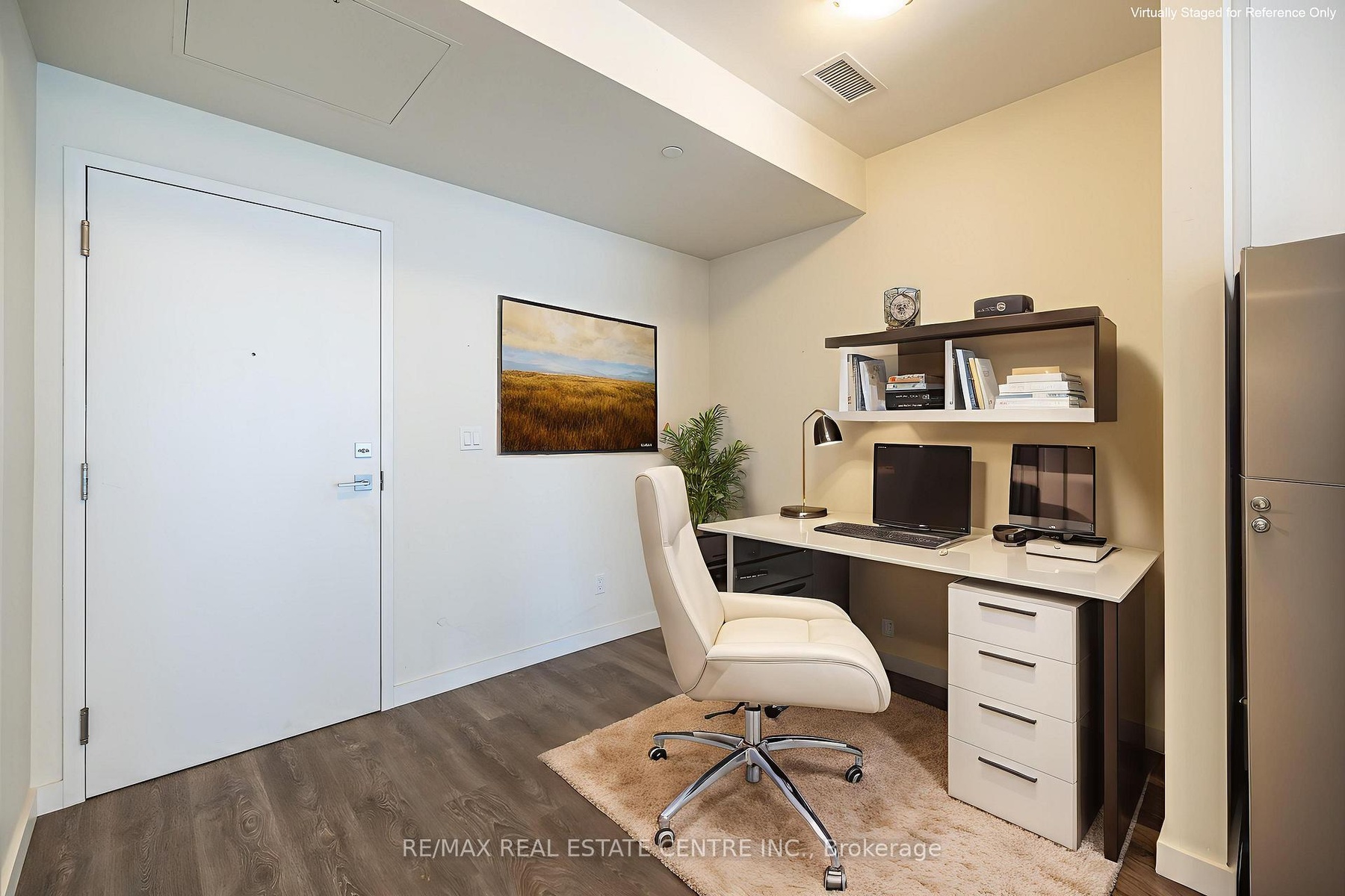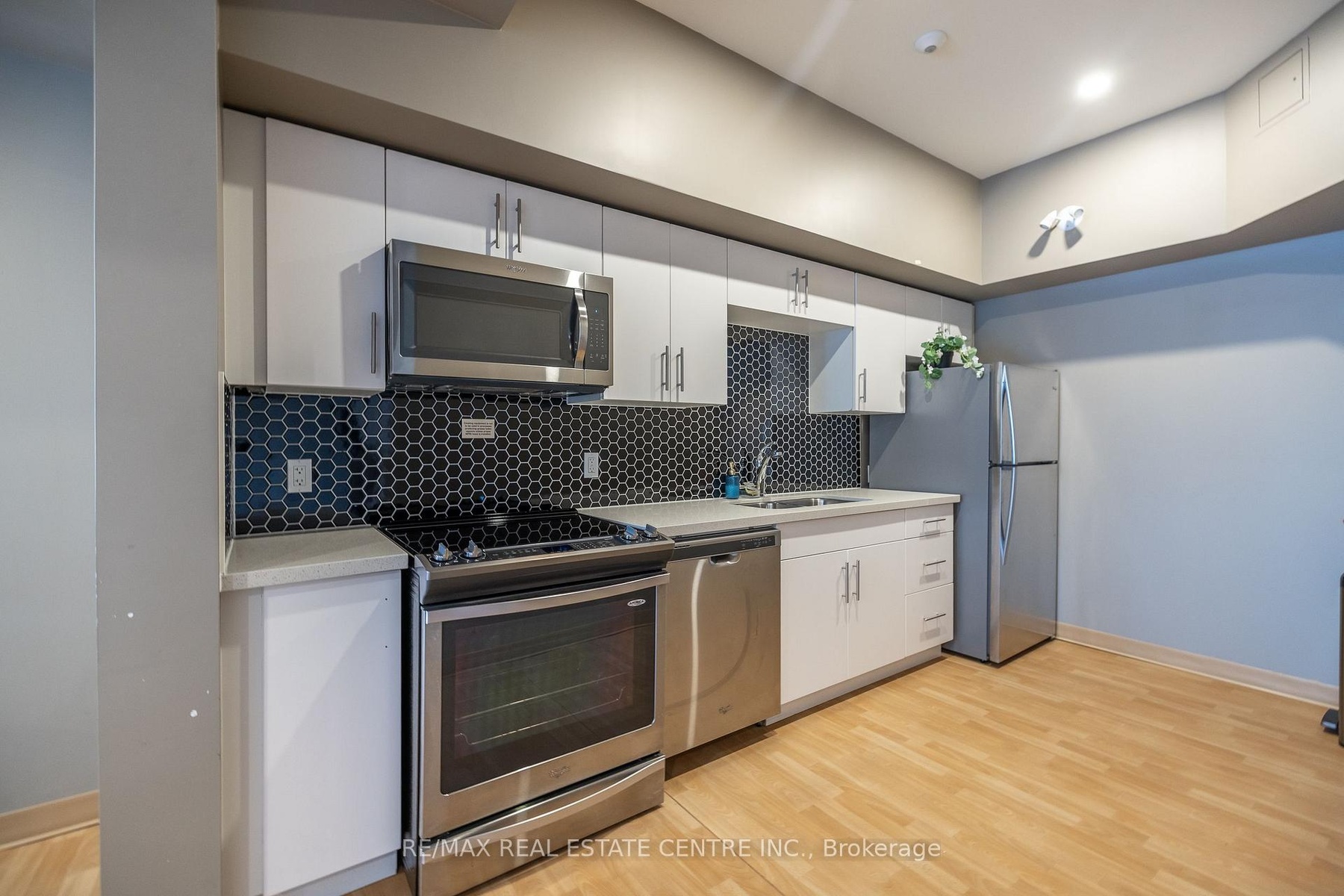 Welcome to this beautiful one-bedroom condo with Den in the popular Midtown Lofts Building - Unit 412 in the heart of Kitchener. 709 sq. ft as per MPAC, this condo offers plenty of living space and boasts floor-to-ceiling windows that flood the space with natural light. You will be delighted by the spacious foyer, four-piece bathroom, beautiful kitchen with white cabinetry, stainless steel appliances and a large island, perfect for cooking and entertaining. The living room is complete with custom blinds and leads out to your very own private balcony. The bedroom has everything you need, its spacious, has a walk-in closet that leads to the bathroom, and features custom black out blinds. Enjoy the convenience of having in-suite laundry. This unit includes one underground parking spot and an oversized storage locker. This building has wonderful amenities such as an exercise room, party room, rooftop deck with a community bbq, and visitor parking. The condo fees include heating, A/C, water, and more! This location is tough to beat with some of the best restaurants, cafes and shops in the region just steps away! Need to commute? The ION LRT and GO Station are minutes away, ensuring effortless commuting! Ready to see it for yourself? Book a private showing today!
